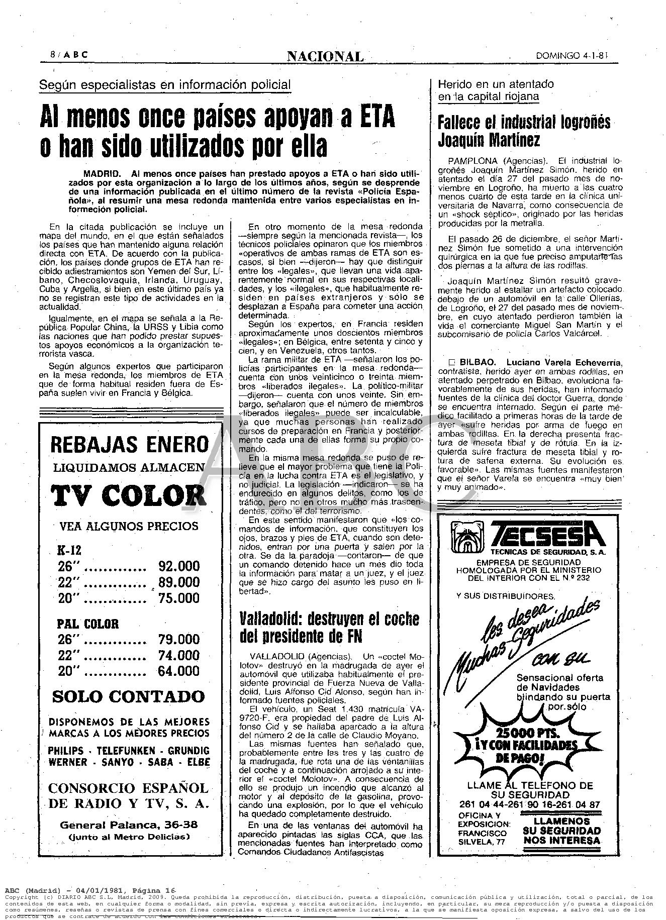 El 3 de enero de 1981 fallece el industrial JOAQUÍN MARTÍNEZ SIMÓN, que no pudo superar las graves heridas que le produjo el brutal atentado cometido el 27 de noviembre de 1980 en Logroño.