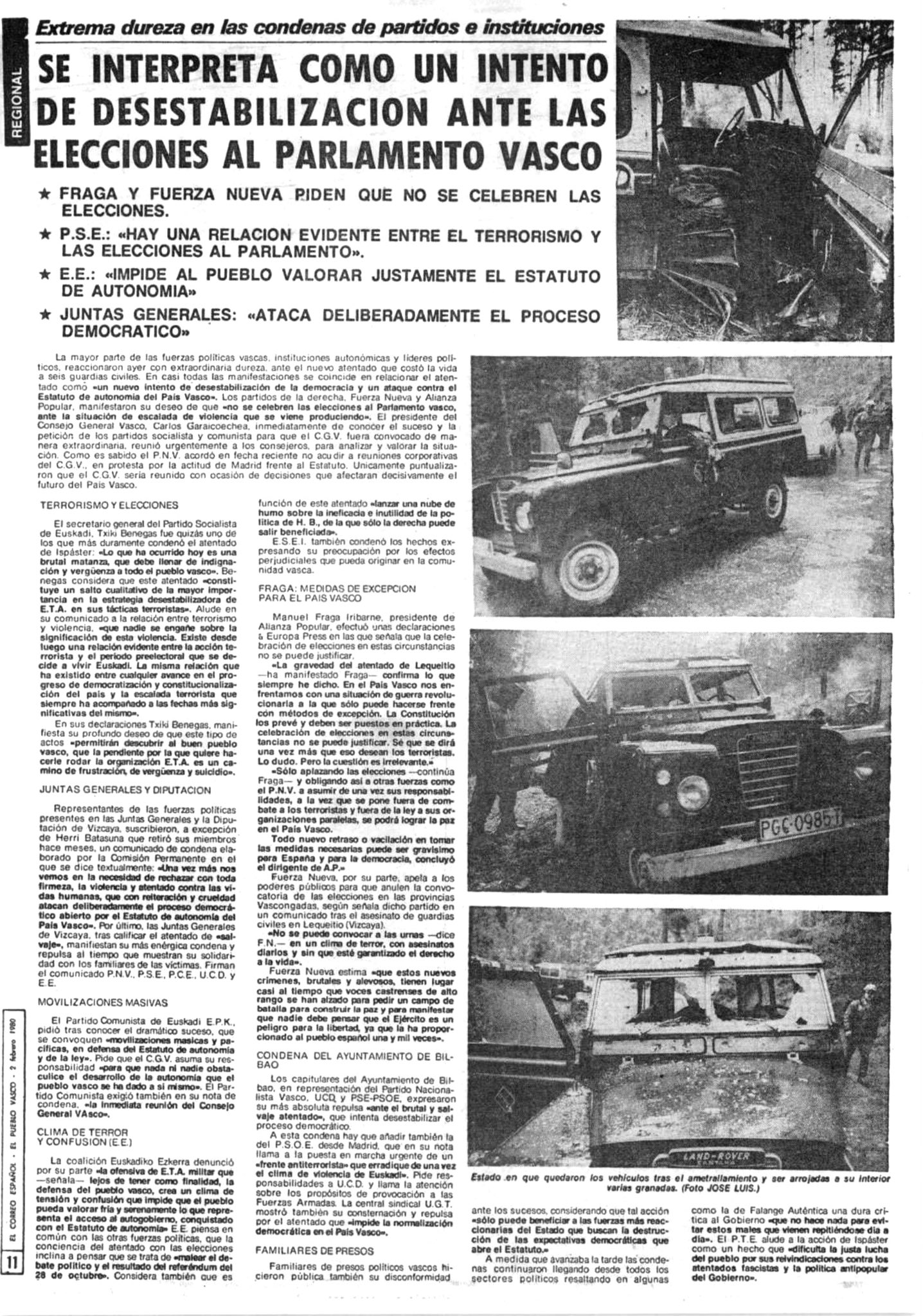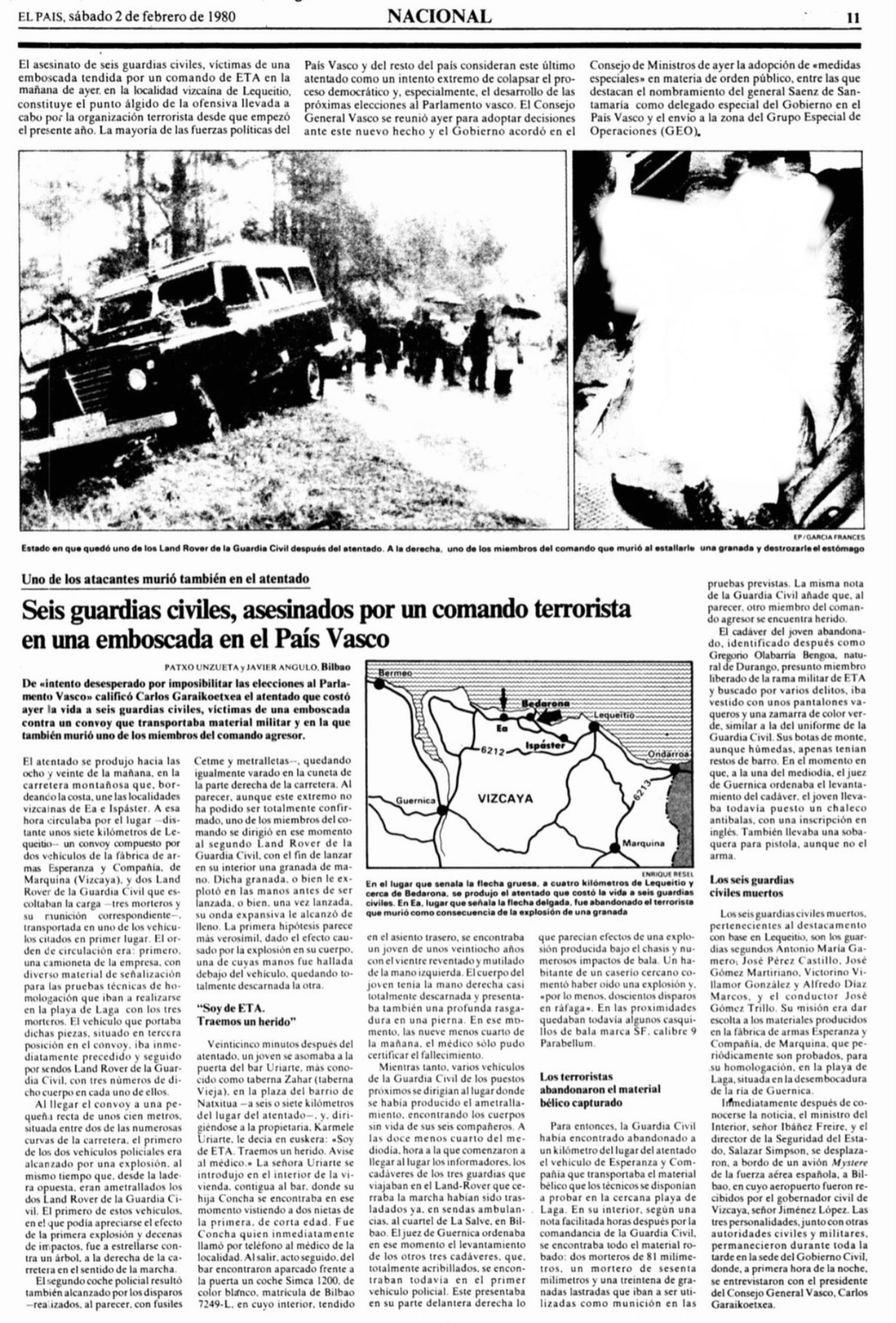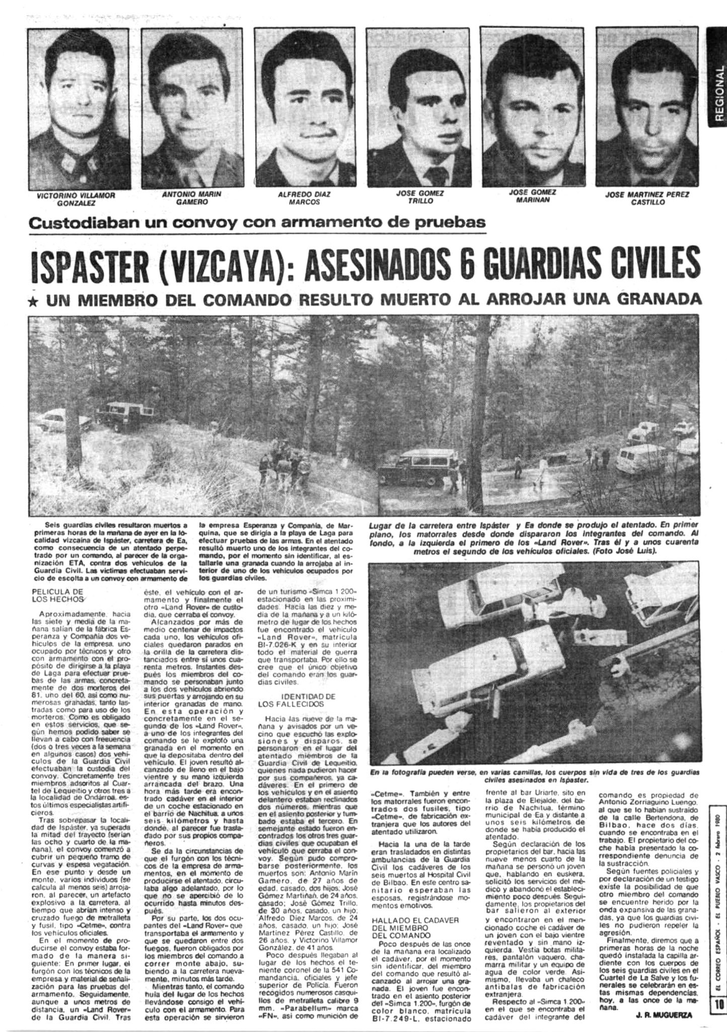 El 1 de febrero de 1980 fueron asesinados en Ispáster (Vizcaya) seis guardias civiles destinados en Lekeitio y Ondarroa, algunos de ellos muy jóvenes y recién salidos de la Academia de Valdemoro. Los seis agentes asesinados eran originarios de diferentes provincias españolas: ALFREDO DÍEZ MARCOS (de Zamora), JOSÉ GÓMEZ MARTIÑÁN (de Cádiz), JOSÉ GÓMEZ TRILLO (de Valencia), ANTONIO MARÍN GAMERO (de Badajoz), JOSÉ ANTONIO MARTÍNEZ PÉREZ-CASTILLO (de Almería) y VICTORINO VILLAMOR GONZÁLEZ (de Burgos).