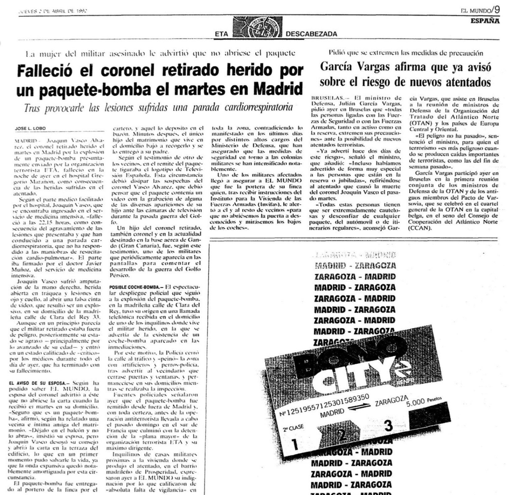 El 1 de abril de 1992 fallece en la UVI del Hospital Gregorio Marañón de Madrid AQUILINO JOAQUÍN VASCO ÁLVAREZ, coronel retirado del Ejército del Aire. Había resultado herido de gravedad al explotarle un paquete-bomba en su casa de la calle Clara de Rey, en Madrid, en torno a las ocho de la tarde del día anterior, martes 31 de marzo, poco después de que uno de sus hijos recogiese del buzón la correspondencia, entre la que se hallaba un paquete sellado por correos y remite de TVE-2 que simulaba ser una cinta de vídeo. Aunque al coronel y a su mujer les resultó sospechoso ese paquete, él decidió finalmente abrirlo en la terraza. Al hacerlo allí, la onda expansiva salió proyectada hacia el exterior, evitando más daños personales. Pese a eso, sufrió amputación de tres dedos de la mano derecha, además de quemaduras en la cara y lesiones en el ojo derecho, el cuello y el tórax.