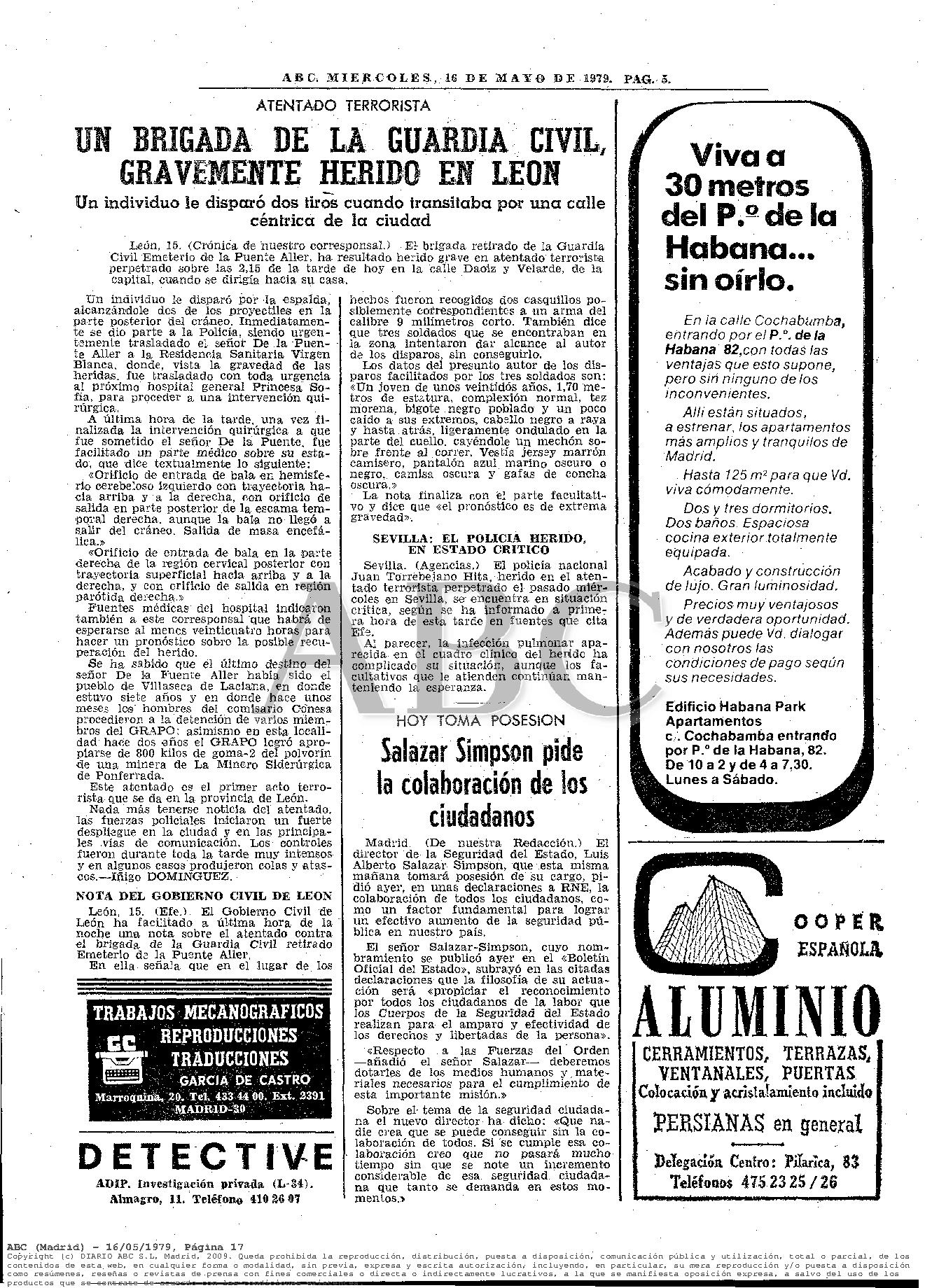 EMETERIO DE LA PUENTE ALLER, fallecido el 1 de julio de 1.979 a consecuencia de las heridas sufridas por el atentado del Grapo del 15 de Mayo en León.