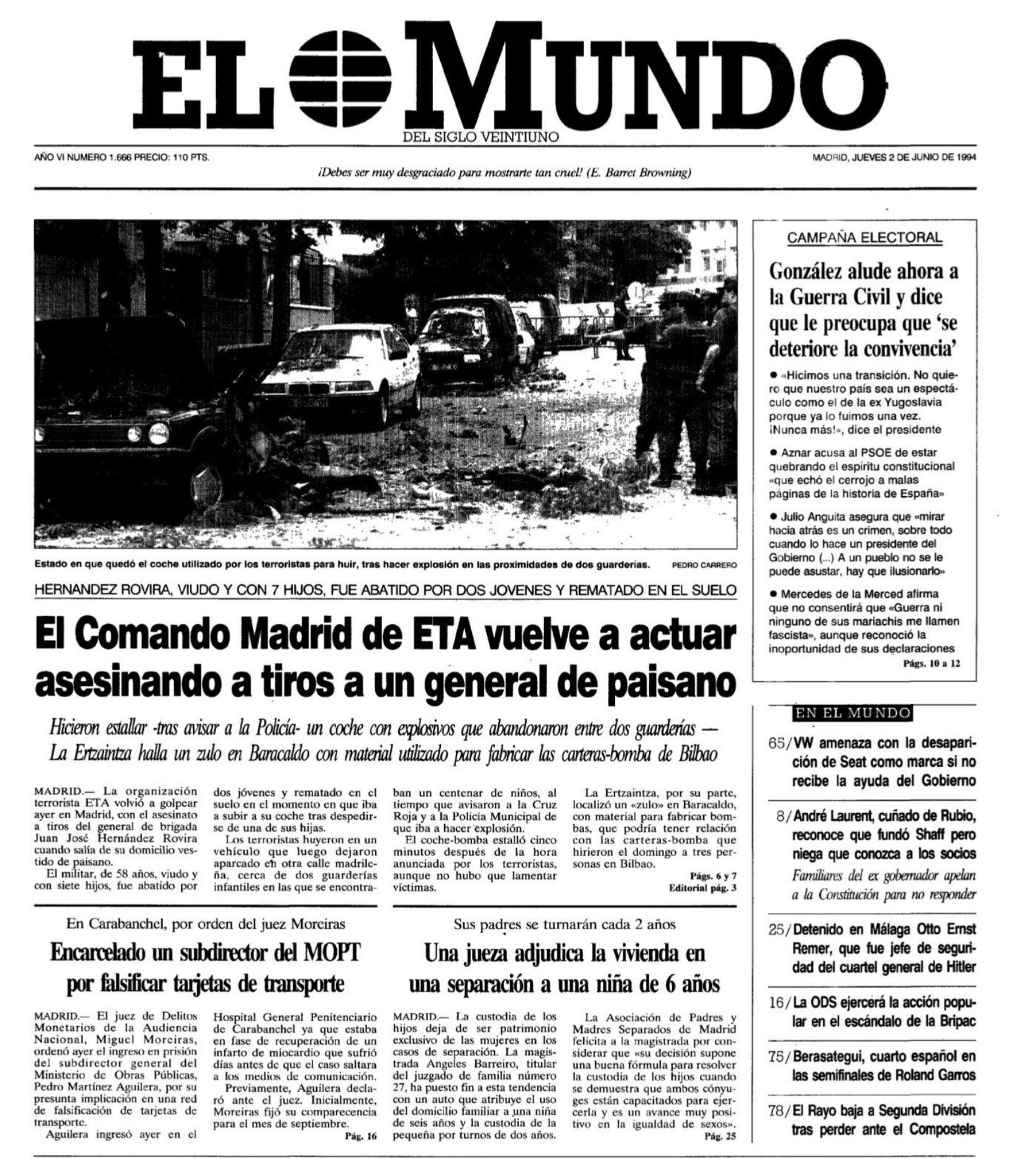 En torno a las 8:40 horas del 1 de junio de 1994, días antes de la celebración de las elecciones al Parlamento Europeo, la banda terrorista ETA asesinaba en Madrid al general de Brigada del Ejército de Tierra JUAN JOSÉ HERNÁNDEZ ROVIRA. Minutos antes el militar había salido de su domicilio, cerca de El Retiro, con su hija Lourdes, de 25 años. Tras despedirse de ella, se dirigió a la calle Ibiza donde le esperaba su chófer a bordo de un coche blindado para dirigirse a su puesto de trabajo en el Ministerio de Defensa. Cuando se disponía a subir al vehículo, un etarra lo asaltó por la espalda y le disparó varios tiros con una pistola. Una vez que el militar cayó al suelo, el pistolero de ETA lo remató «con total tranquilidad» con dos disparos más, según testigos presenciales. Después disparó al conductor del vehículo oficial, un joven que realizaba el Servicio Militar, pero las balas no le alcanzaron.