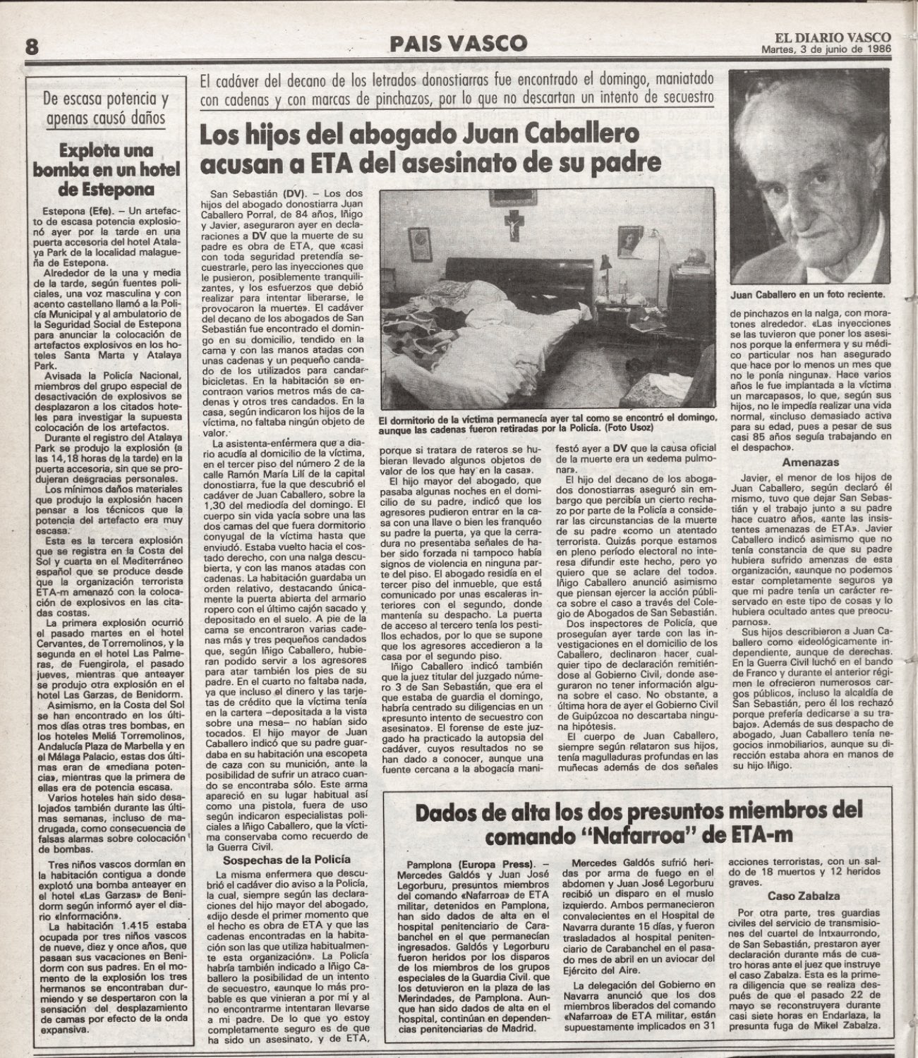 El domingo 1 de junio de 1986 muere a manos de la banda terrorista ETA en su domicilio de San Sebastián JUAN CABALLERO PORRAL. El caso de este prestigioso abogado es un ejemplo de la indefensión judicial en la que se han encontrado muchos familiares de víctimas de la banda asesina.