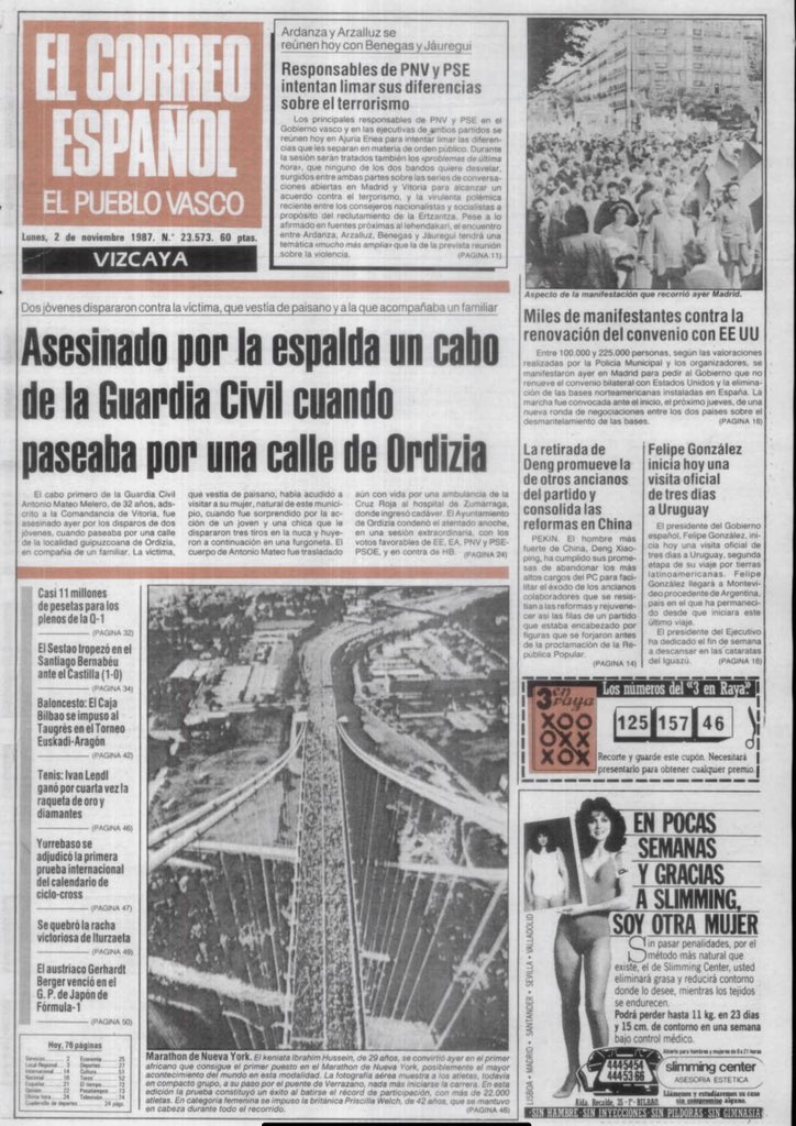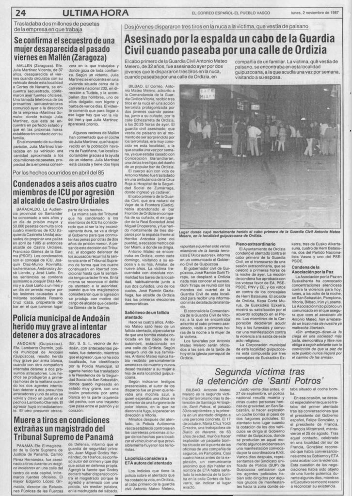 A las ocho y media de la noche del 1 de noviembre de 1987 la banda terrorista ETA asesinaba en Villafranca de Ordicia (Guipúzcoa) al cabo primero de la Guardia Civil ANTONIO MATEO MELERO mientras paseaba, de paisano y acompañado por varios familiares, por la zona de bares de la localidad guipuzcoana. Allí sus suegros regentaban el Bar Miami, por lo que era frecuente que visitase el pueblo, como ese fin de semana de Todos los Santos que tenía libre.