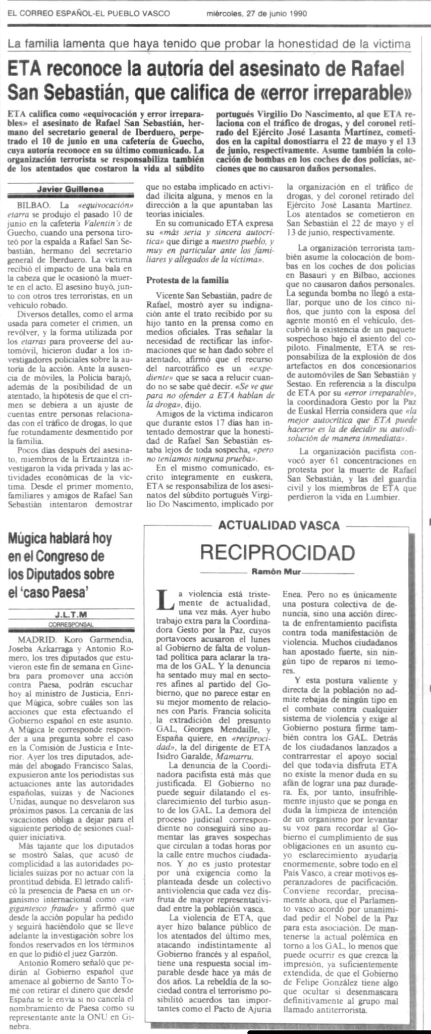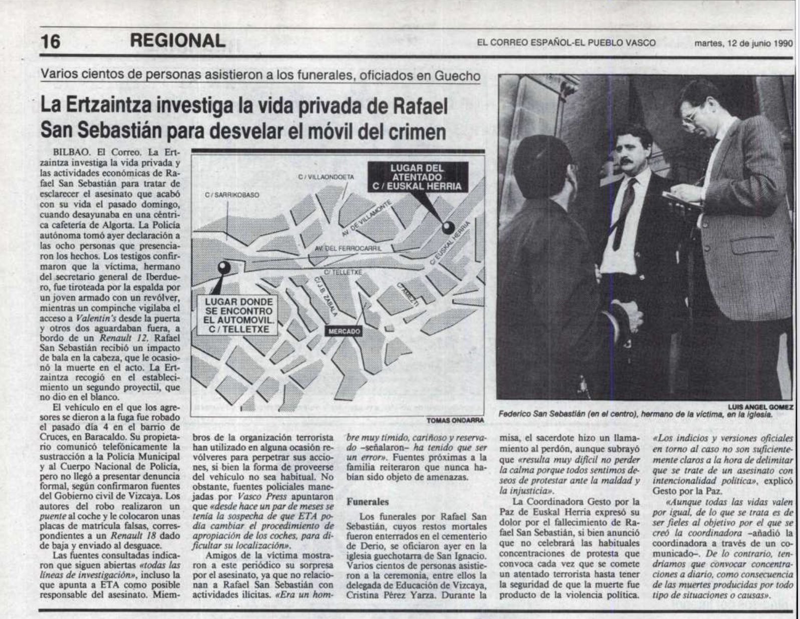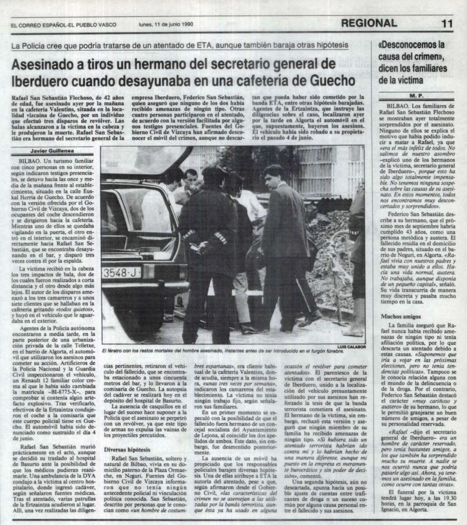 En torno a las 11:30 horas del 10 de junio de 1990, la banda terrorista ETA asesina en la cafetería Gwendolyne de Guecho (Vizcaya) a RAFAEL SAN SEBASTIÁN FLECHOSO. Dos etarras entraron en el local y efectuaron dos disparos a escasa distancia en la cabeza de la víctima, que murió prácticamente en el acto.