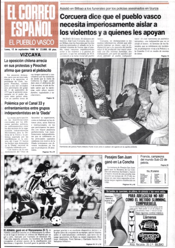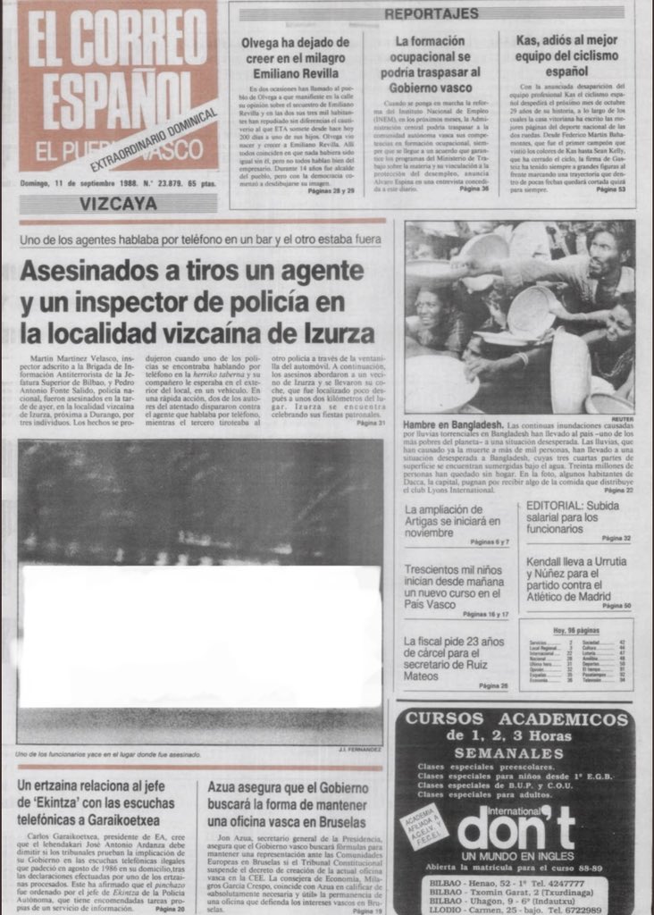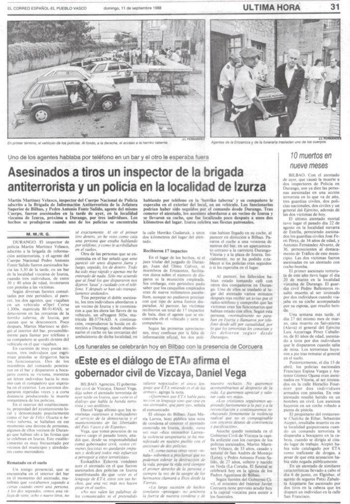 A las cinco y media de la tarde del sábado 10 de septiembre de 1988 la banda terrorista ETA asesinaba a tiros en Izurza (Vizcaya) al agente de policía, PEDRO ANTONIO FONTE SALIDO, y al inspector MARTÍN MARTÍNEZ VELASCO. El agente Fonte Salido fue acribillado mientras esperaba en un vehículo camuflado a que su compañero saliera del Bar Ozaeta, situado en la carretera que va de Vitoria a Durango. El inspector Martínez Velasco fue asesinado segundos antes mientras hablaba por teléfono dentro del bar, donde en esos momentos jugaban a las cartas una docena de personas. Ambos estaban adscritos a la Brigada de Información Antiterrorista de la Jefatura Superior de Policía de Bilbao.