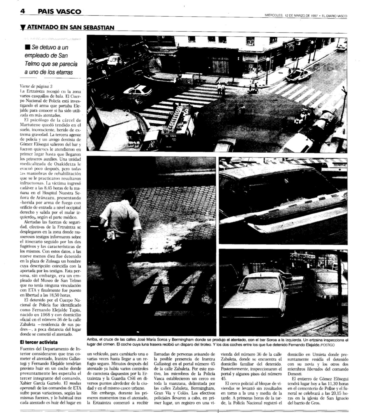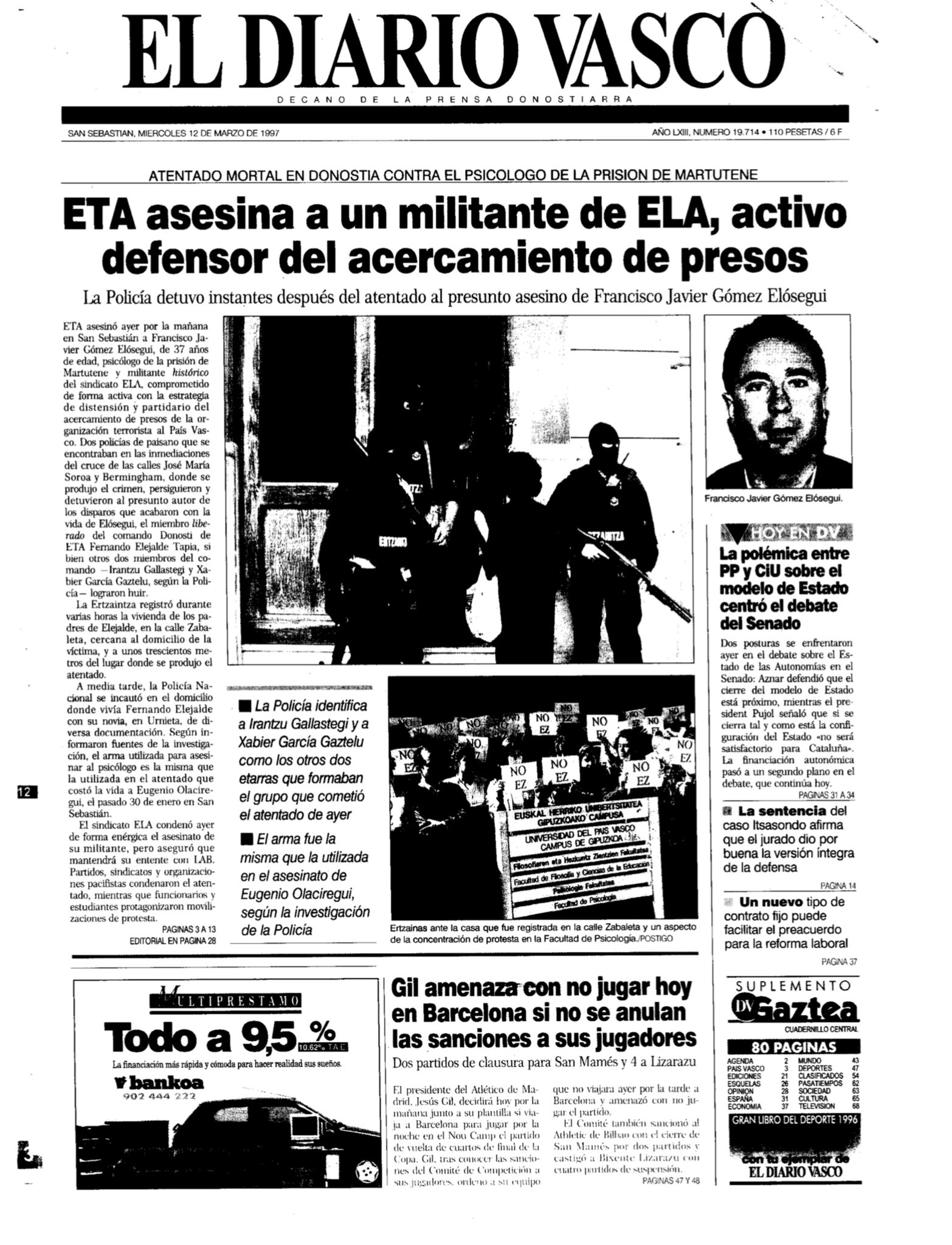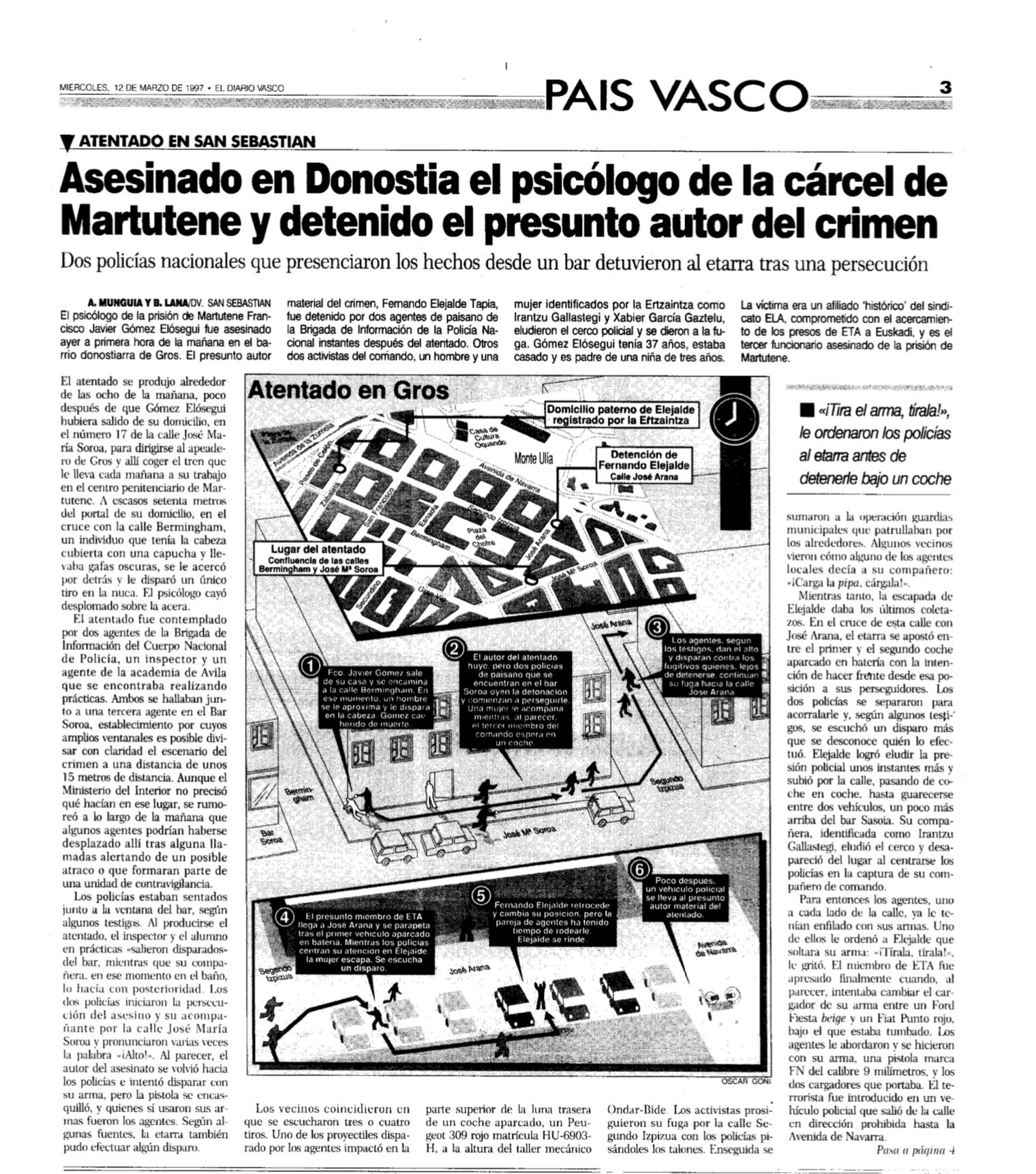 Poco antes de las ocho de la mañana del martes 11 de marzo de 1997, ETA asesinaba en San Sebastián de un tiro en la nuca a FRANCISCO JAVIER GÓMEZ ELOSEGUI, psicólogo de la cárcel de Martutene y afiliado al sindicato ELA-STV.