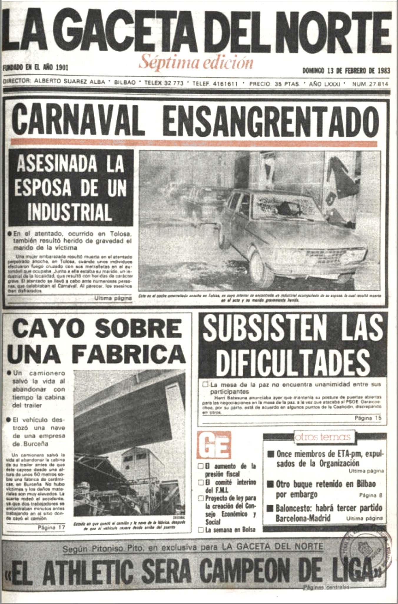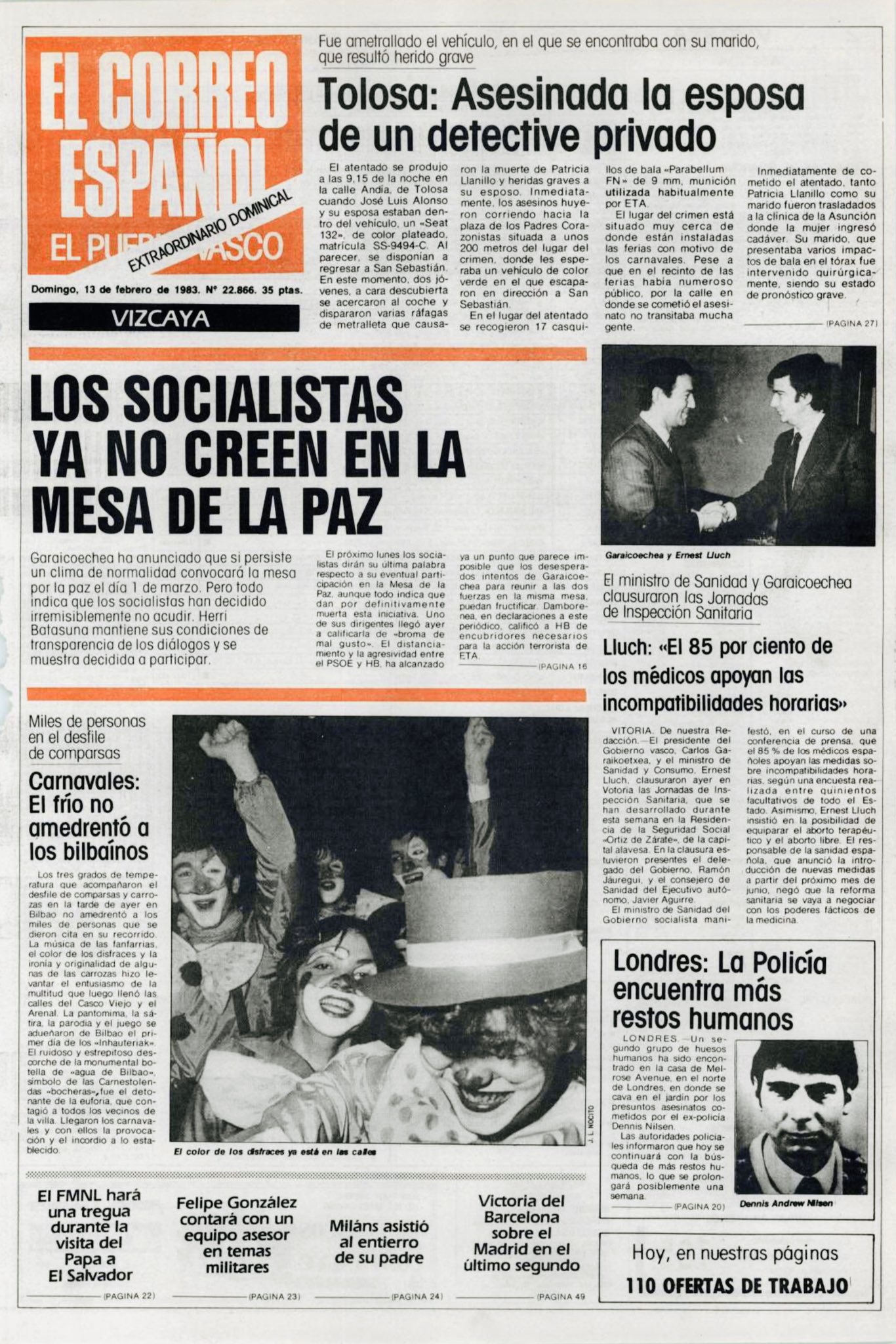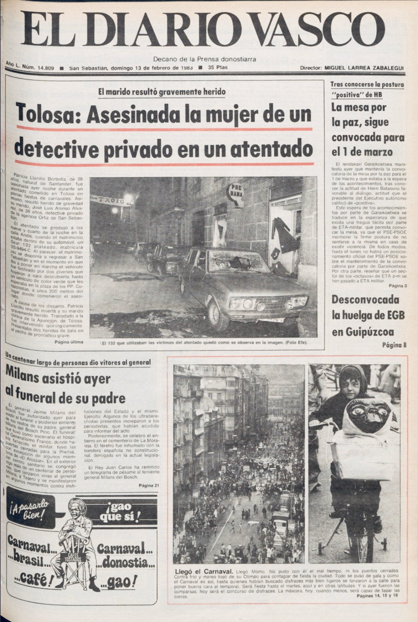 El 12 de febrero de 1983, en torno a las 21:30 horas, PATRICIA LLANILLO BORBOLLA es ametrallada en Tolosa. Era una noche muy concurrida por celebrarse en esos momentos los Carnavales de la localidad, como ocurrió 14 años después con Patxi Arratibel, mediador en el pago del rescate de Emiliano Revilla.