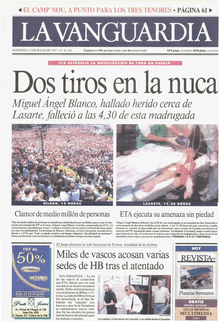 Al mediodía del viernes 10 de julio de 1997, la banda terrorista ETA secuestraba en la estación guipuzcoana de Éibar al concejal del Partido Popular en la localidad de Ermua MIGUEL ÁNGEL BLANCO GARRIDO, e imponía un plazo de 48 horas al Gobierno para que trasladara al País Vasco a los presos de ETA o, de lo contrario, lo ejecutarían.