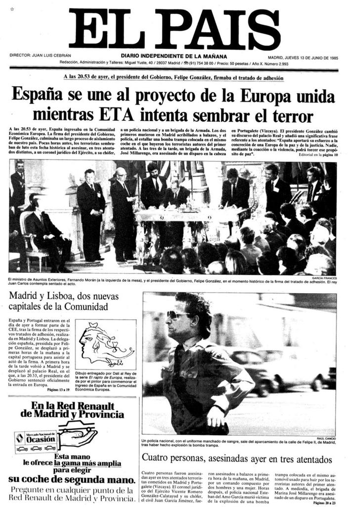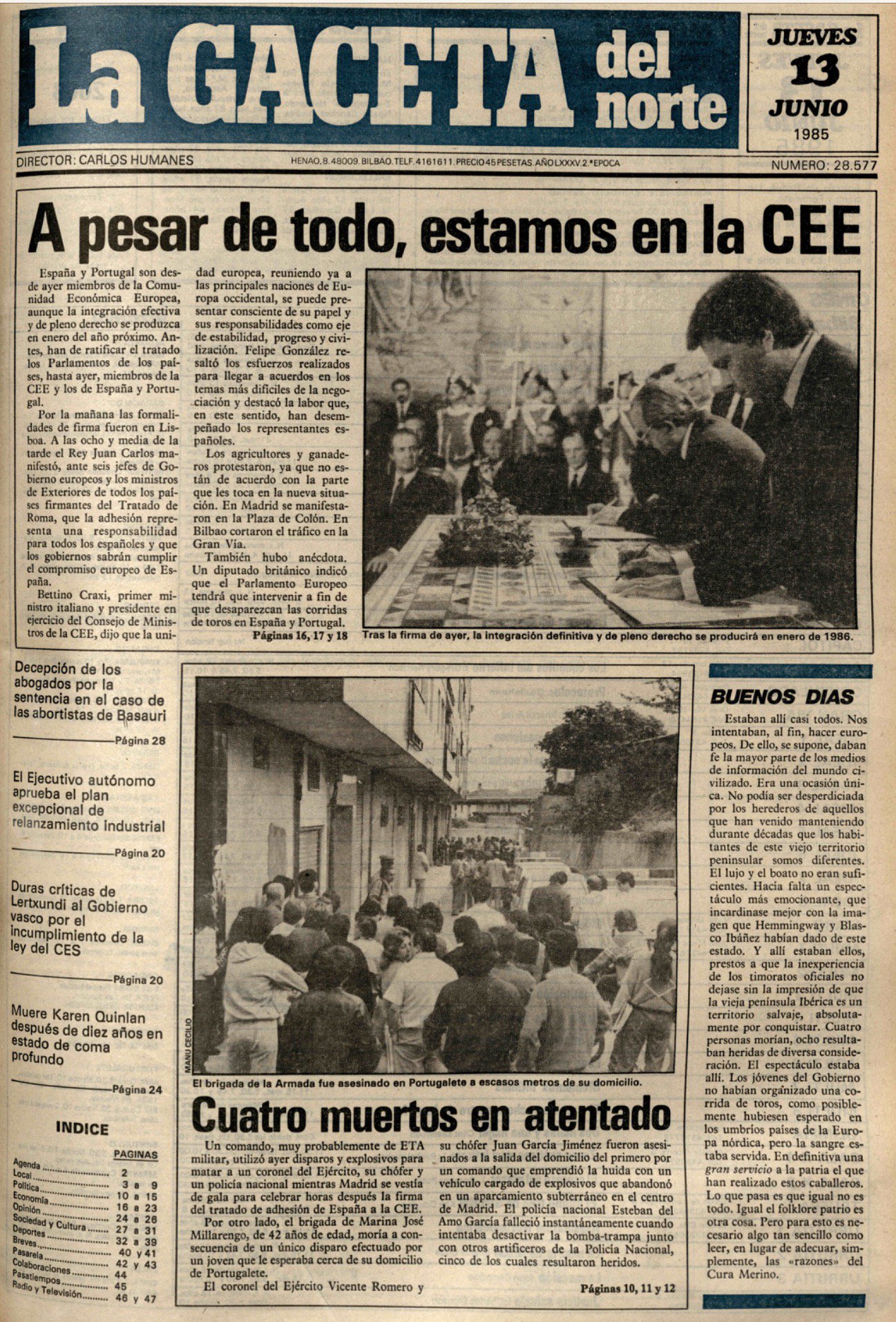 El 12 de junio de 1985 la banda terrorista ETA asesinaba,en menos de cinco horas, a cuatro personas, tres de ellas en Madrid y una en Portugalete (Vizcaya). Ese fue un día histórico en el que España firmó el Tratado de Adhesión a la Comunidad Económica Europea, y ETA quiso que fuese recordado por otros motivos.