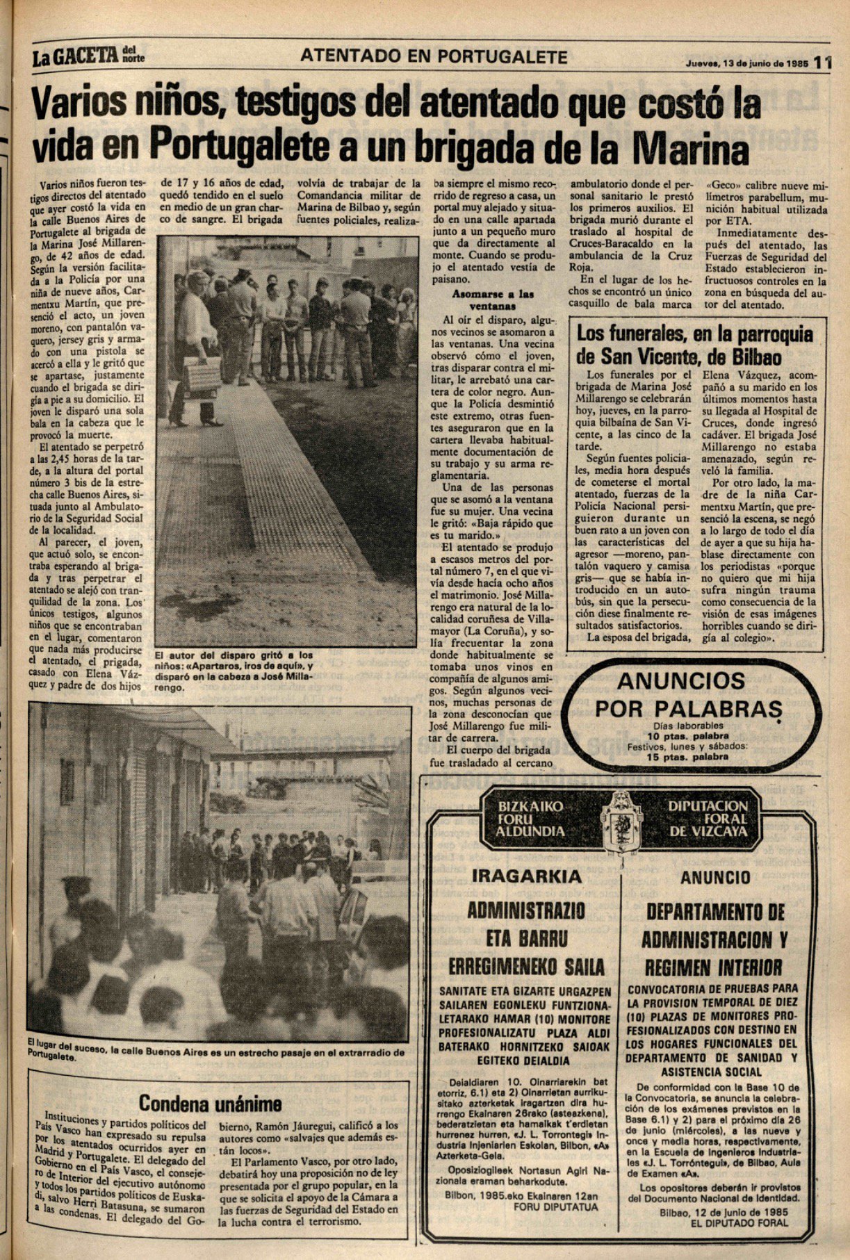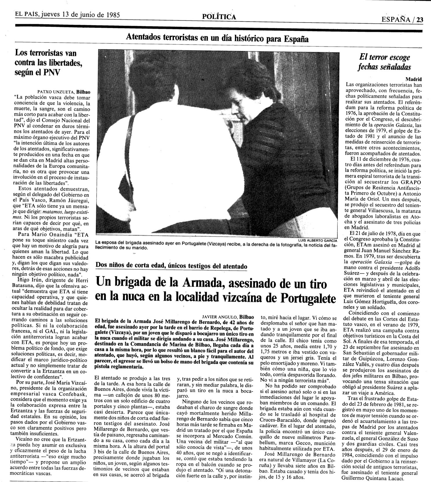 Pocas horas después del triple asesinato en Madrid, el mismo 12 de junio de 1985, la banda terrorista ETA acababa con la vida de José Millarengo Bernardo en Portugalete (Vizcaya). Un etarra lo abordó por la espalda cuando el brigada volvía a su domicilio, después de acabar su jornada laboral en la Comandancia de Marina de Bilbao. Eran aproximadamente las 15:00 horas y Millarengo caminaba a pie por el barrio de Repelaga de la localidad vizcaína cuando el etarra le pegó un tiro en la nuca que acabó con su vida.