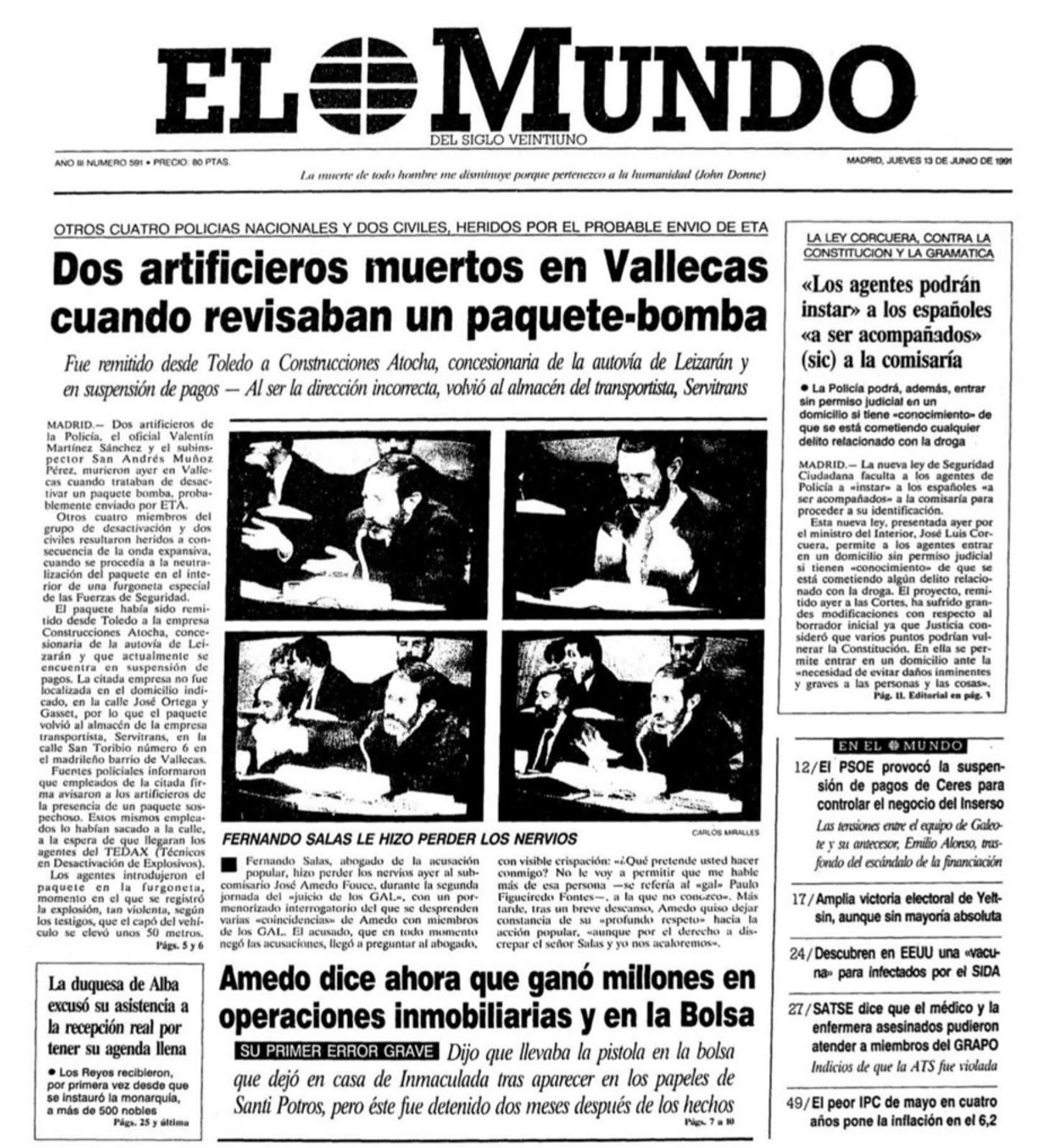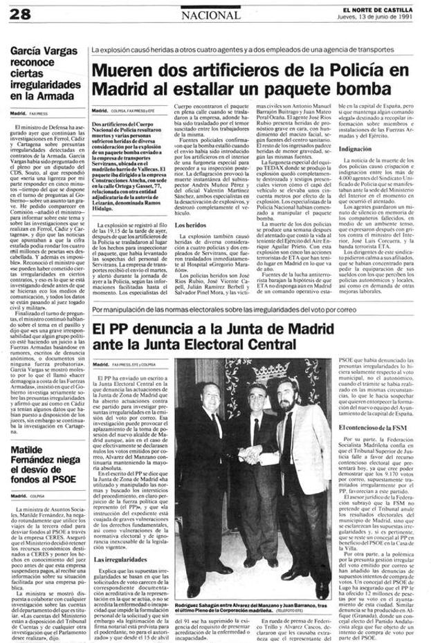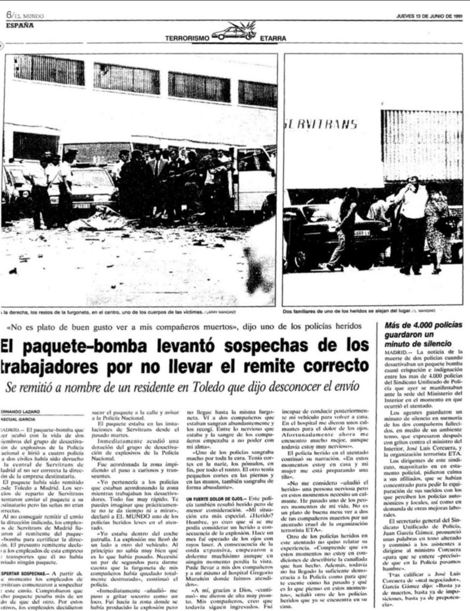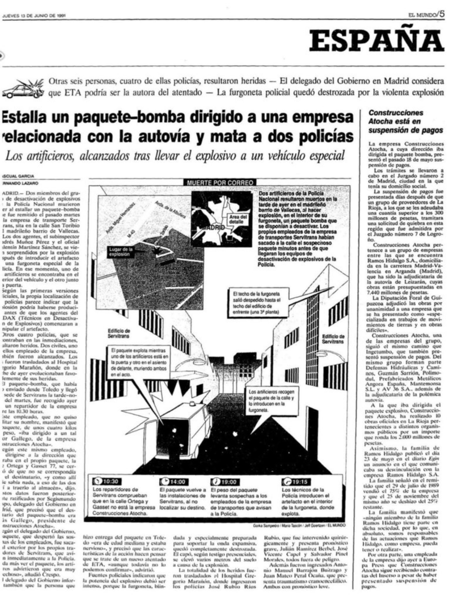 El 12 de junio de 1991 el subinspector del Cuerpo Nacional de Policía ANDRÉS MUÑOZ PÉREZ y el agente VALENTÍN MARTÍN SÁNCHEZ, ambos artificieros, resultaron muertos cuando trataban de desactivar un paquete-bomba enviado por la banda terrorista ETA, localizado en un almacén de la empresa Servitrans en el barrio de Vallecas. El paquete-bomba iba inicialmente destinado al presidente de Construcciones Atocha S.A., Jesús Gallego. La empresa era una de las adjudicatarias de la autovía de Leizarán, a cuyo trazado se oponía ETA por su supuesto impacto medioambiental.