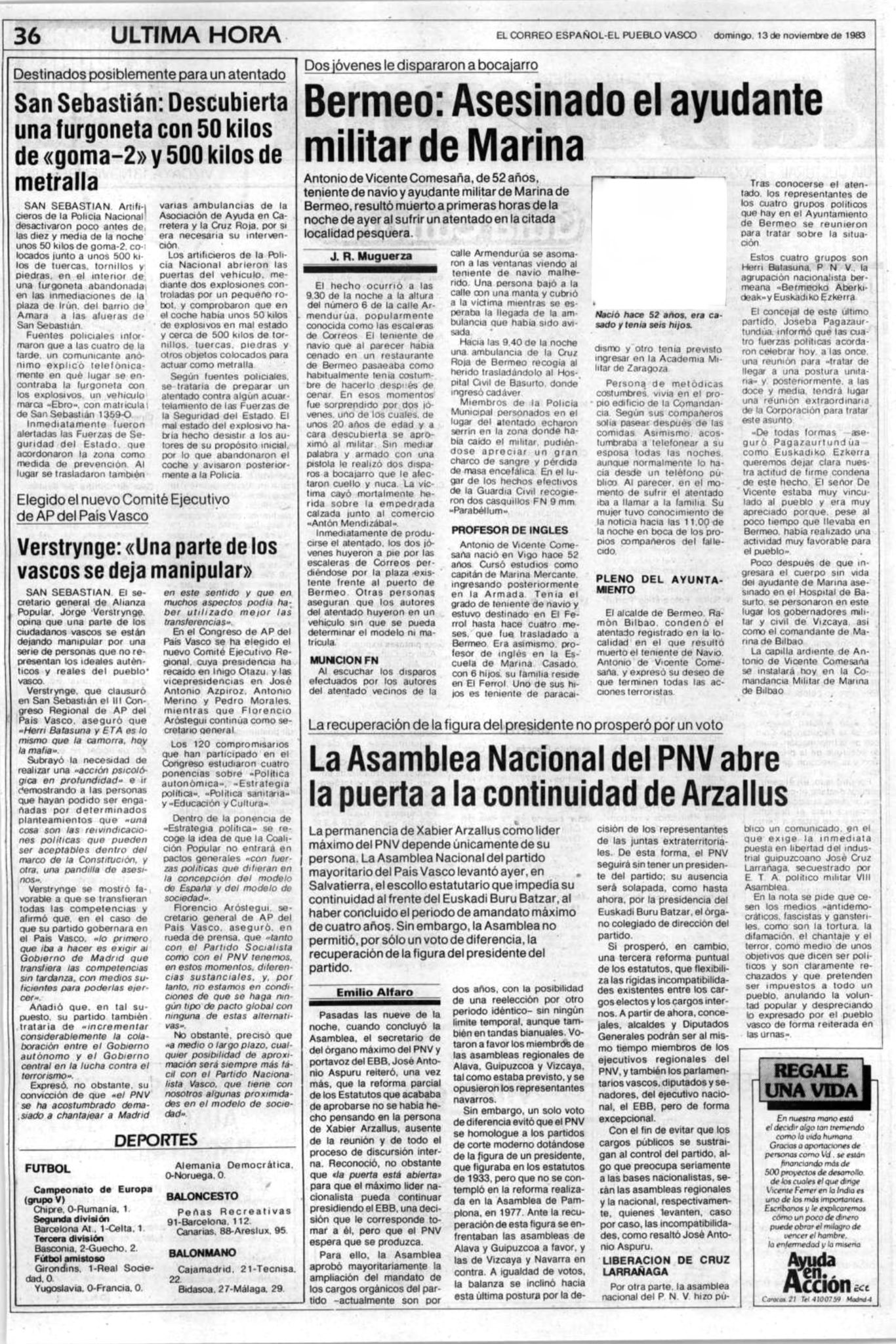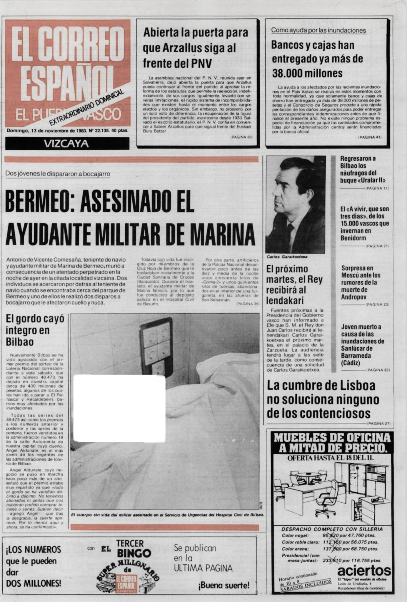 A las diez menos cuarto de la noche del 12 de noviembre de 1983 la banda terrorista ETA asesinaba en Bermeo (Vizcaya) al teniente de Navío ANTONIO DE VICENTE COMESAÑA, que trabajaba como ayudante de la Comandancia de Marina de la localidad vizcaína. Antonio se encontraba en una plaza de Bermeo, junto a la estafeta de Correos y cerca de la sede de la Ayudantía de Marina. Era sábado y la plaza se encontraba muy concurrida. El militar iba de paisano de regreso a su domicilio cuando dos individuos le dispararon por la espalda a corta distancia. Antonio se desplomó en el suelo con heridas en el cráneo y el maxilar y falleció durante su traslado en una ambulancia de la Cruz Roja al Hospital de Cruces de Baracaldo. En el lugar de los hechos se recogieron dos casquillos de bala del calibre 9 milímetros parabellum.