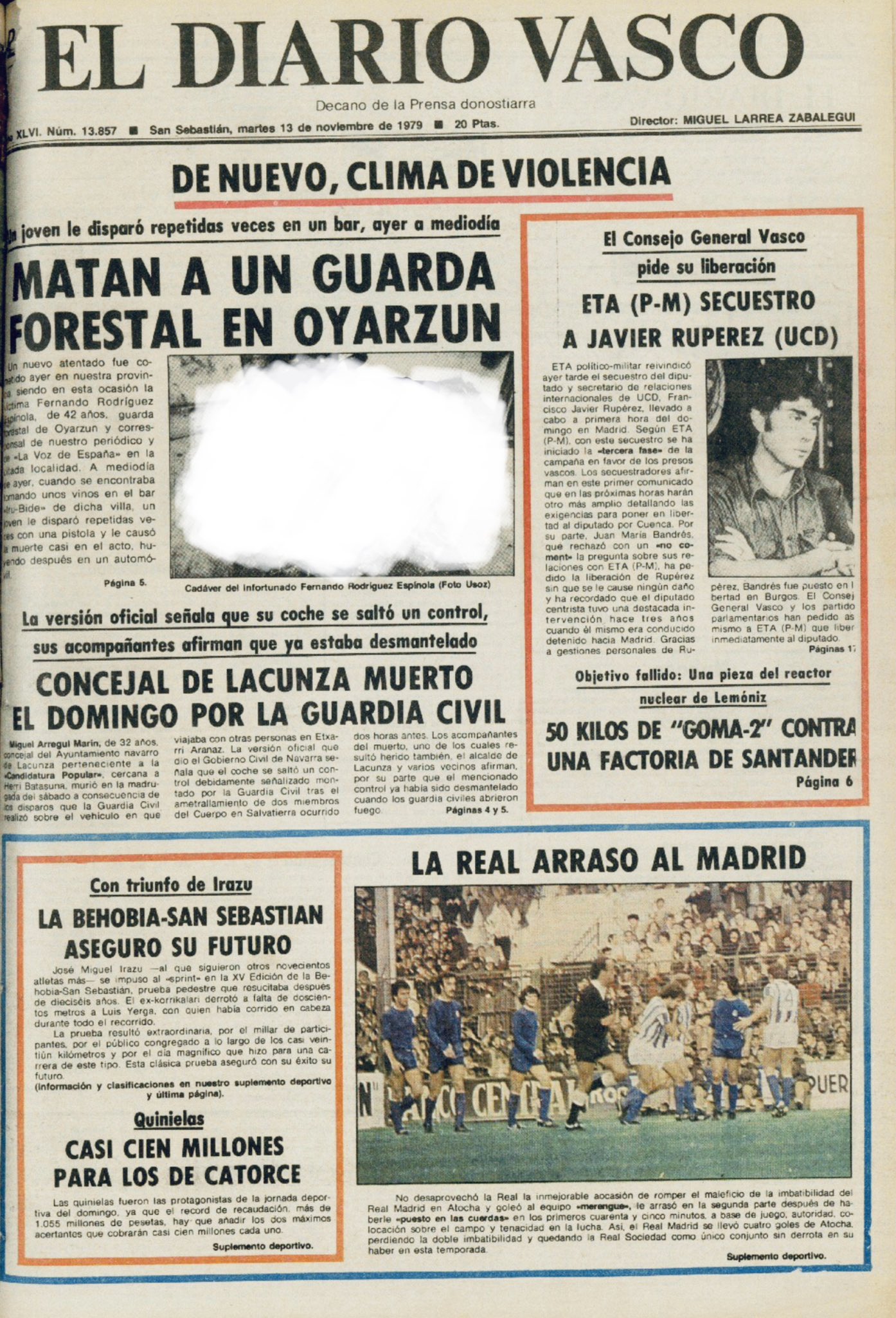 A la una menos cuarto del mediodía del 12 de noviembre de 1979 la banda terrorista ETA asesinaba al guarda forestal FERNANDO RODRÍGUEZ ESPÍNOLA, que fue tiroteado cuando se encontraba en el interior de un bar de la localidad guipuzcoana de Oyarzun (Guipúzcoa). Además de guarda forestal de Icona, Fernando colaboraba como corresponsal en El Diario Vasco y, posteriormente, en La Voz de España.