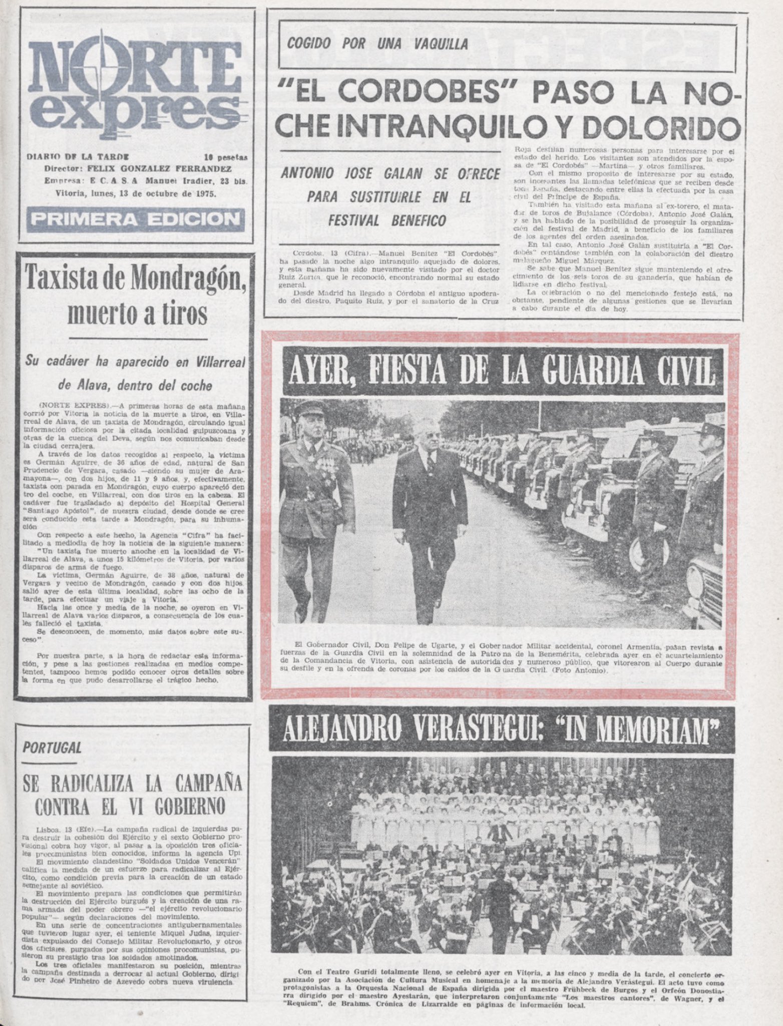 Minutos antes de llegar a la medianoche del domingo 12 de octubre de 1975, la banda terrorista ETA asesinaba en Villarreal de Álava, a quince kilómetros de Vitoria, al taxista GERMÁN AGUIRRE IRASUEGUI, disparándole tres tiros en la nuca.
