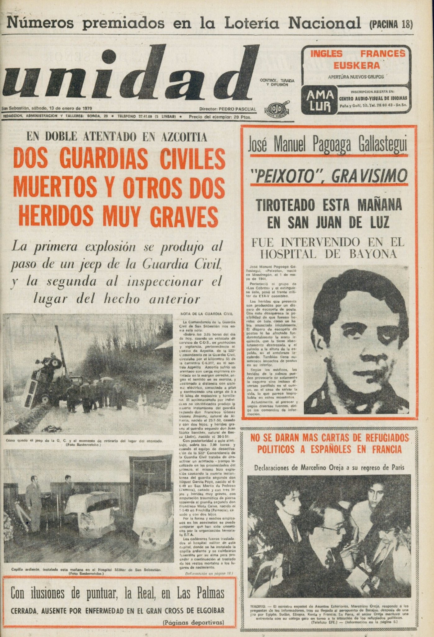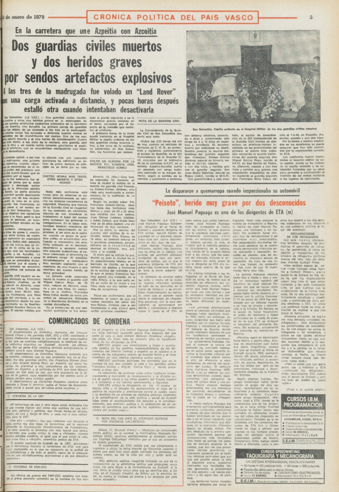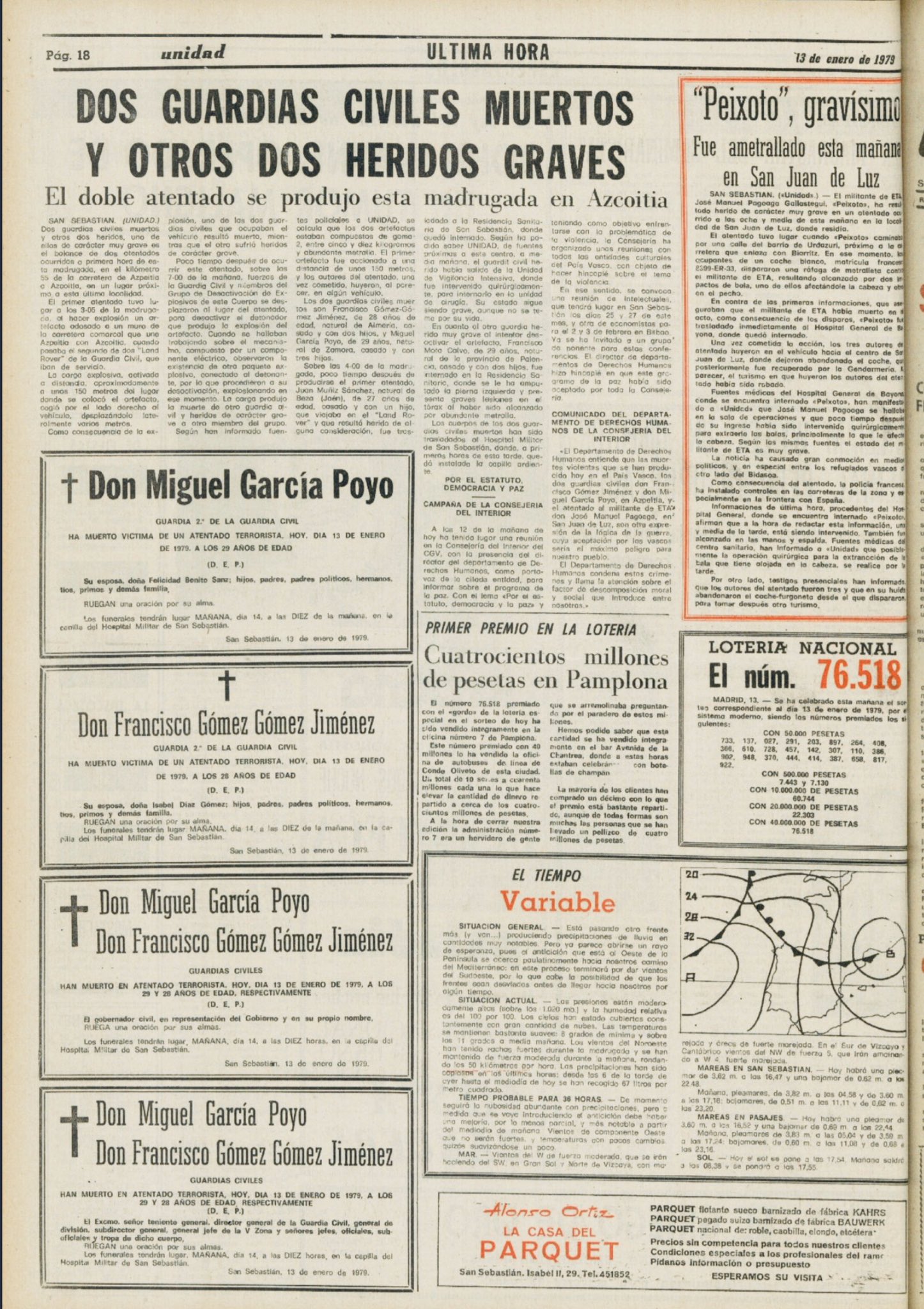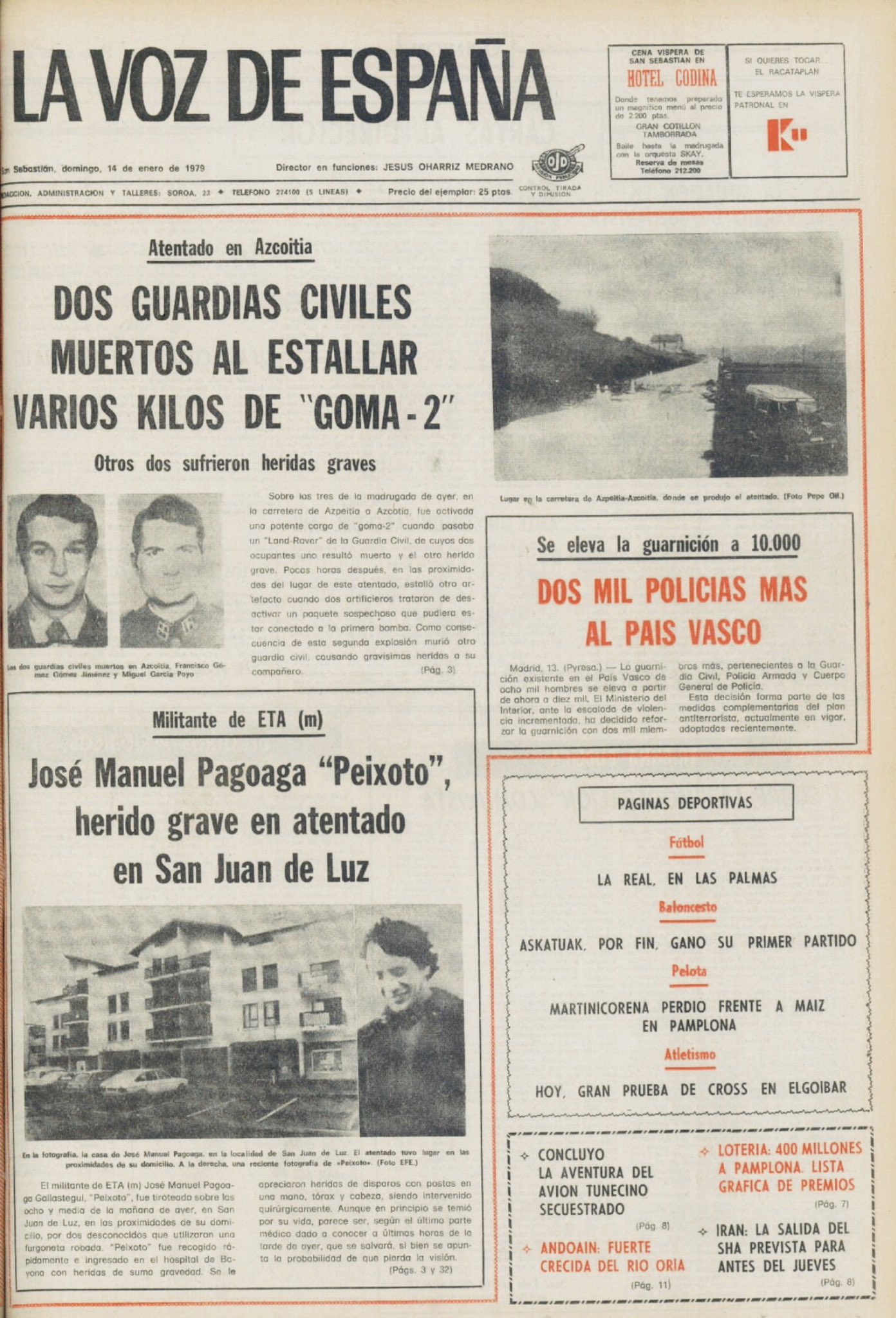 A las tres de la mañana del sábado 13 de enero de 1979, ETA asesinaba en la localidad guipuzcoana de Azpeitia a los guardias civiles FRANCISCO GÓMEZ GÓMEZ-JIMÉNEZ y MIGUEL GARCÍA POYO mediante la explosión de dos bombas. Un compañero de ambos, Francisco Mota Calvo, falleció dos días después.