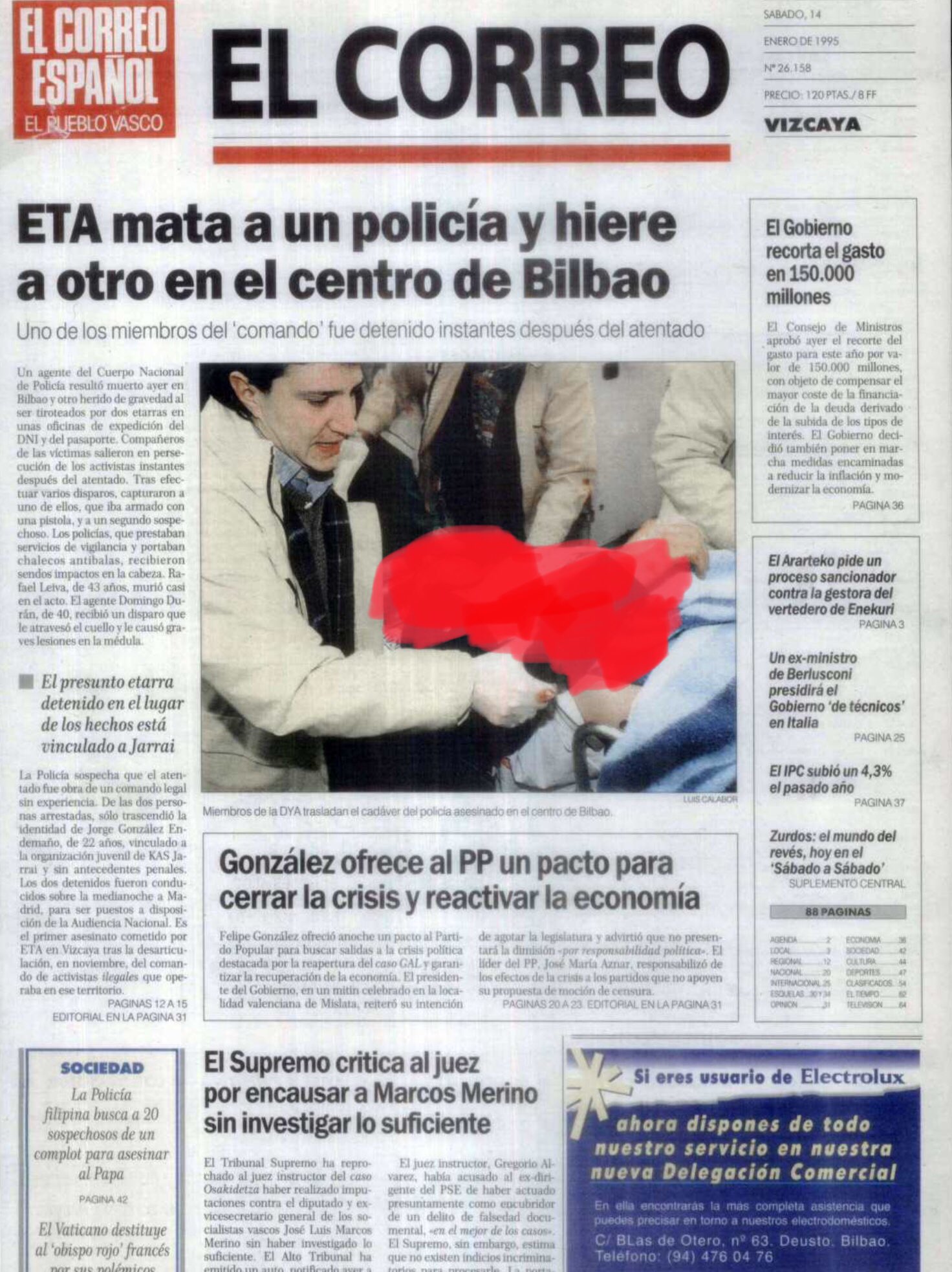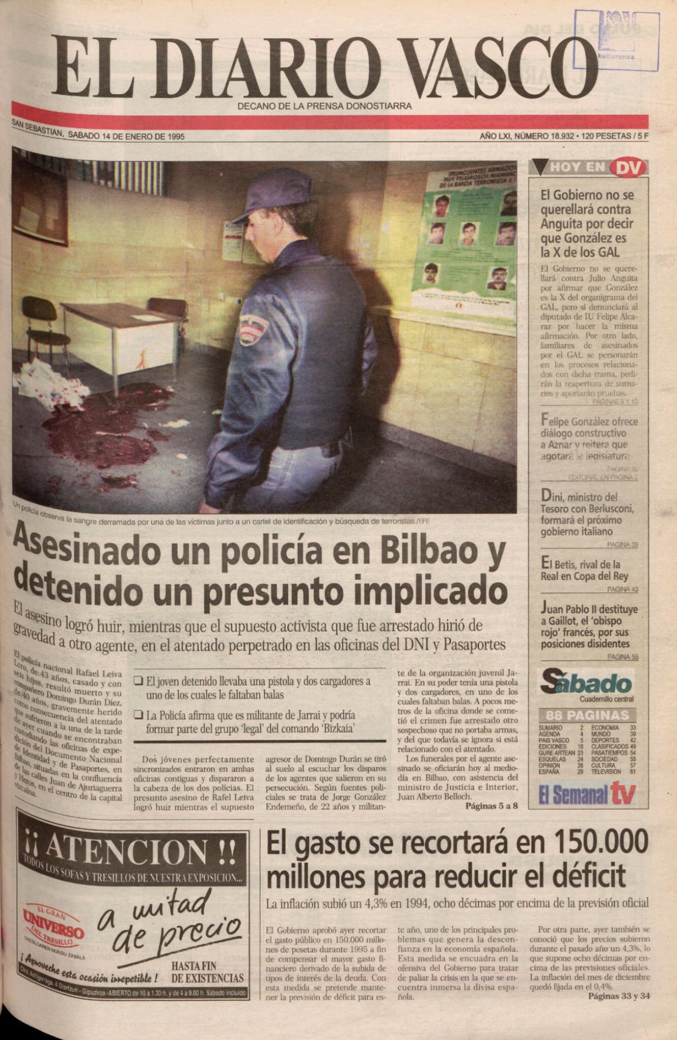Dieciséis años después, el 13 de enero de 1995, dos terroristas de ETA entraron en torno a las 13:00 horas en las oficinas de expedición de pasaportes y DNI situadas en pleno centro de Bilbao y dispararon repetidamente contra los policías nacionales RAFAEL LEIVA LORO y Domingo Durán Díez.