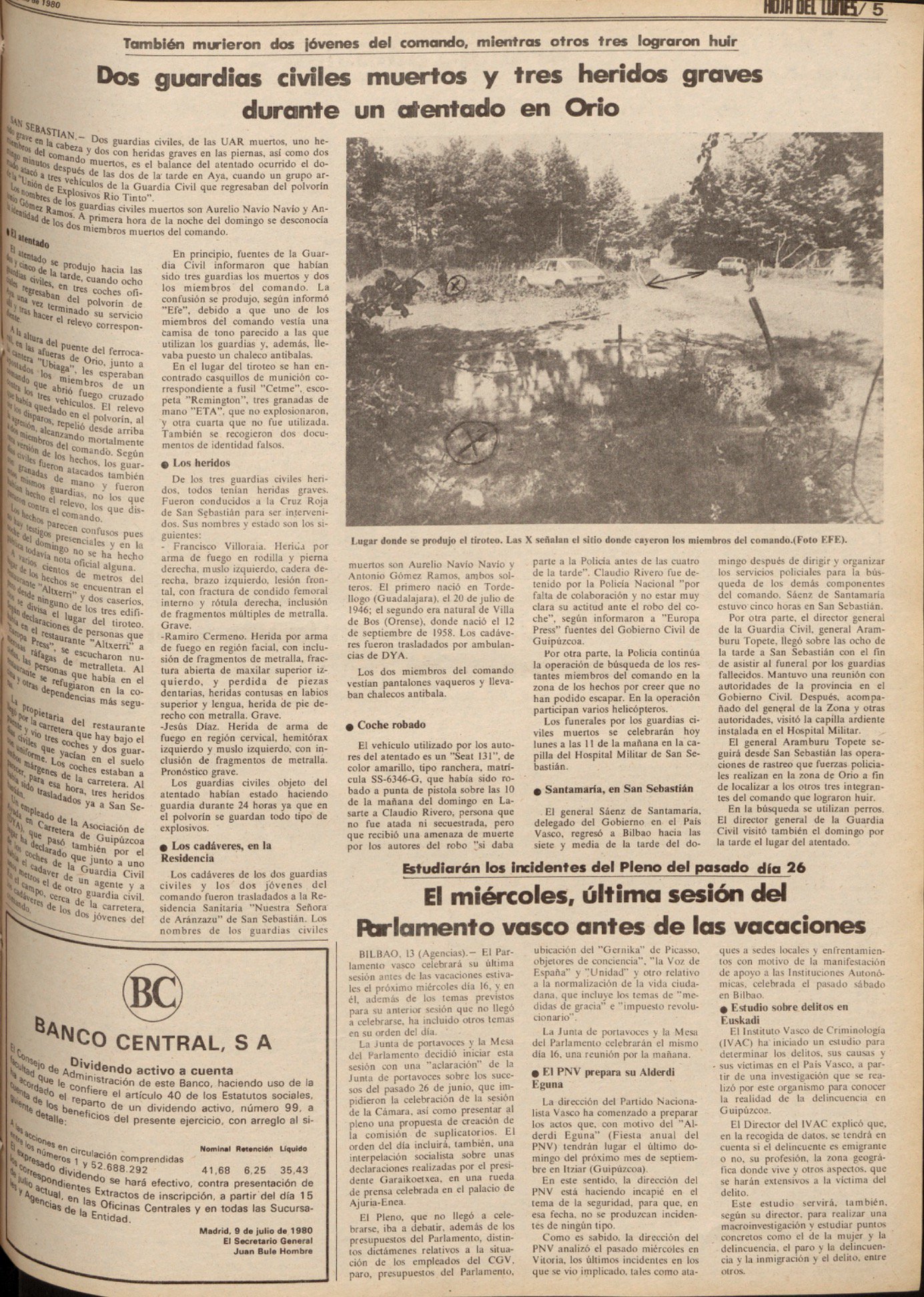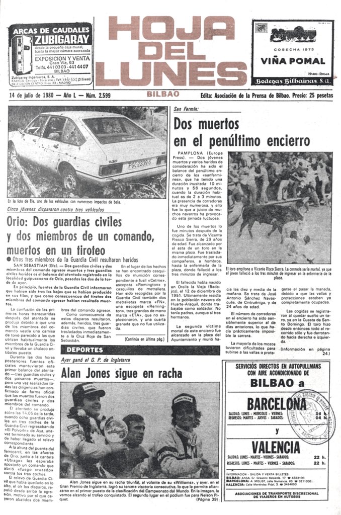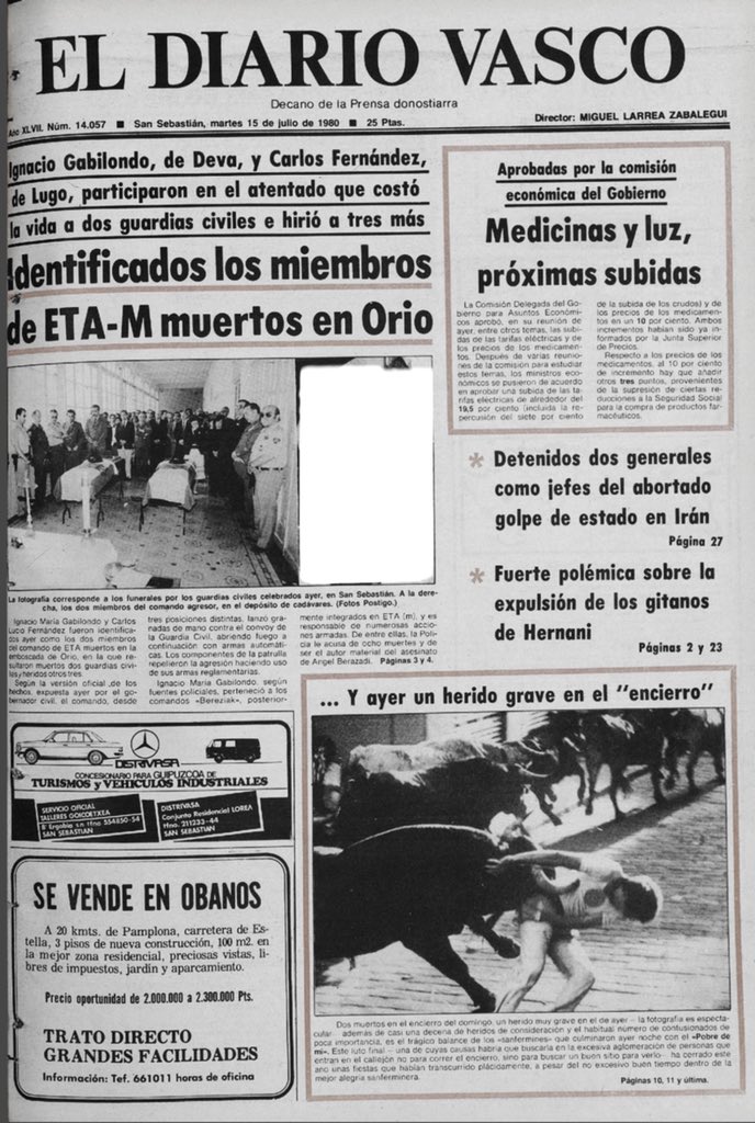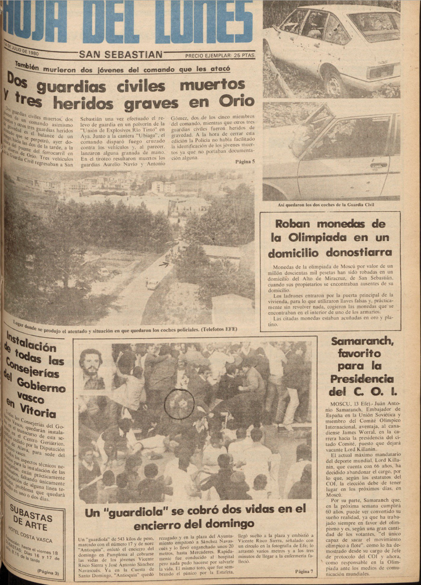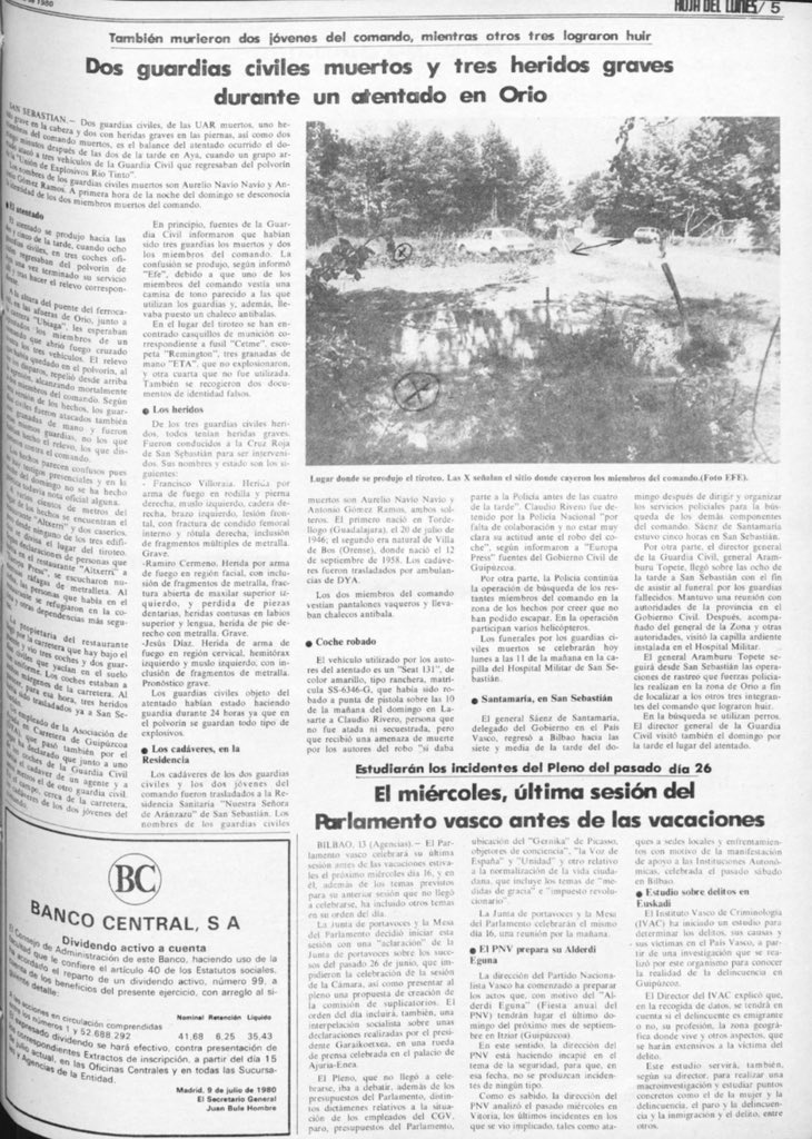 El 13 de julio de 1980 la banda terrorista ETA asesinaba en Orio (Guipúzcoa) a los guardias civiles ANTONIO GÓMEZ RAMOS y AURELIO NAVÍO NAVÍO. Las víctimas formaban parte de un convoy de la Guardia Civil de tres vehículos, con ocho agentes a bordo, que en torno a las 14:00 horas descendían hacia el acuartelamiento desde el polvorín de Explosivos Río Tinto en Aya (Guipúzcoa), después de que otro grupo de guardias civiles les hubiesen relevado en el servicio de vigilancia en el que habían estado las veinticuatro horas anteriores.