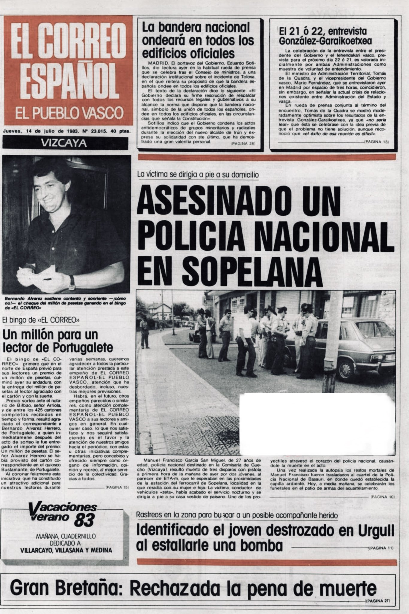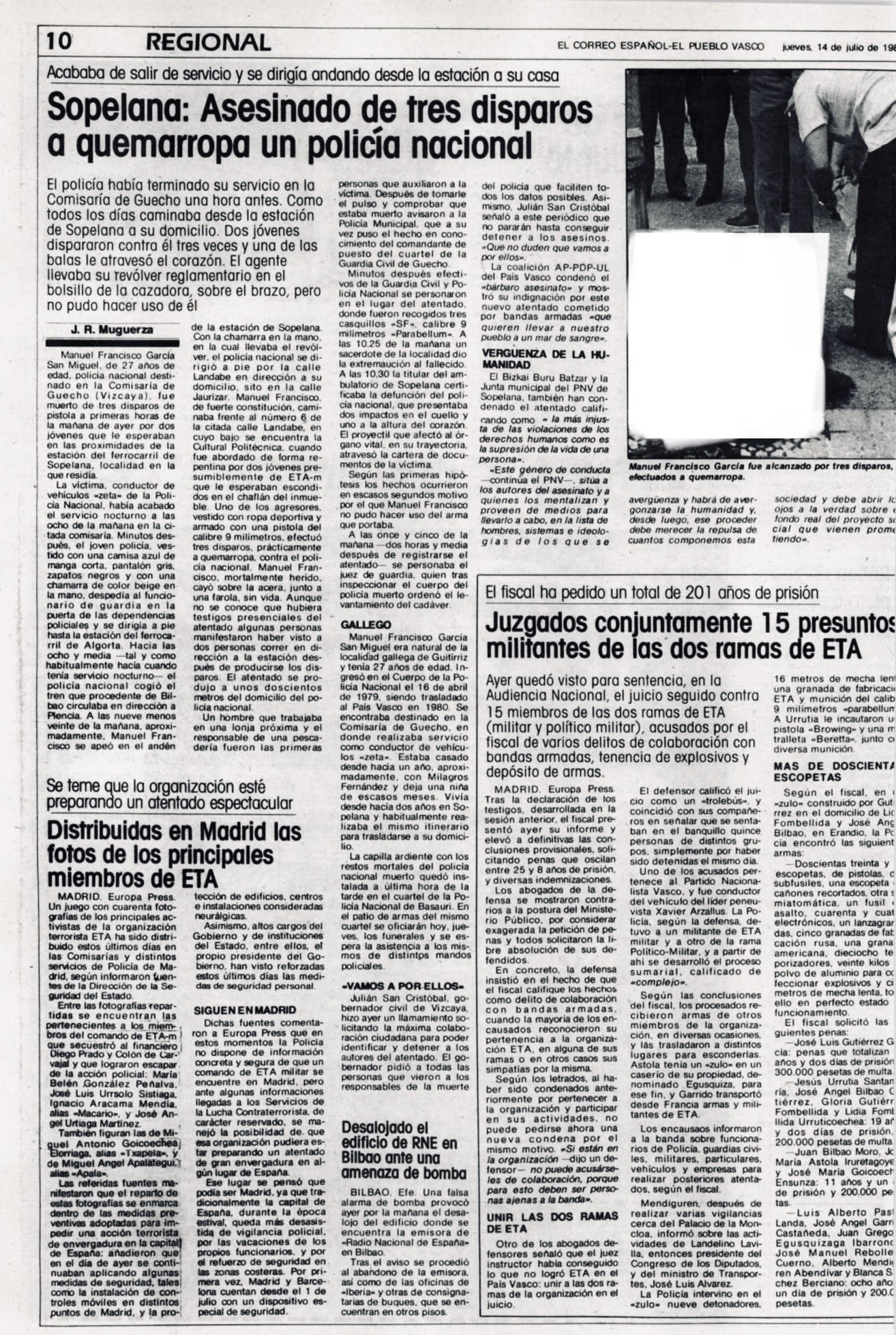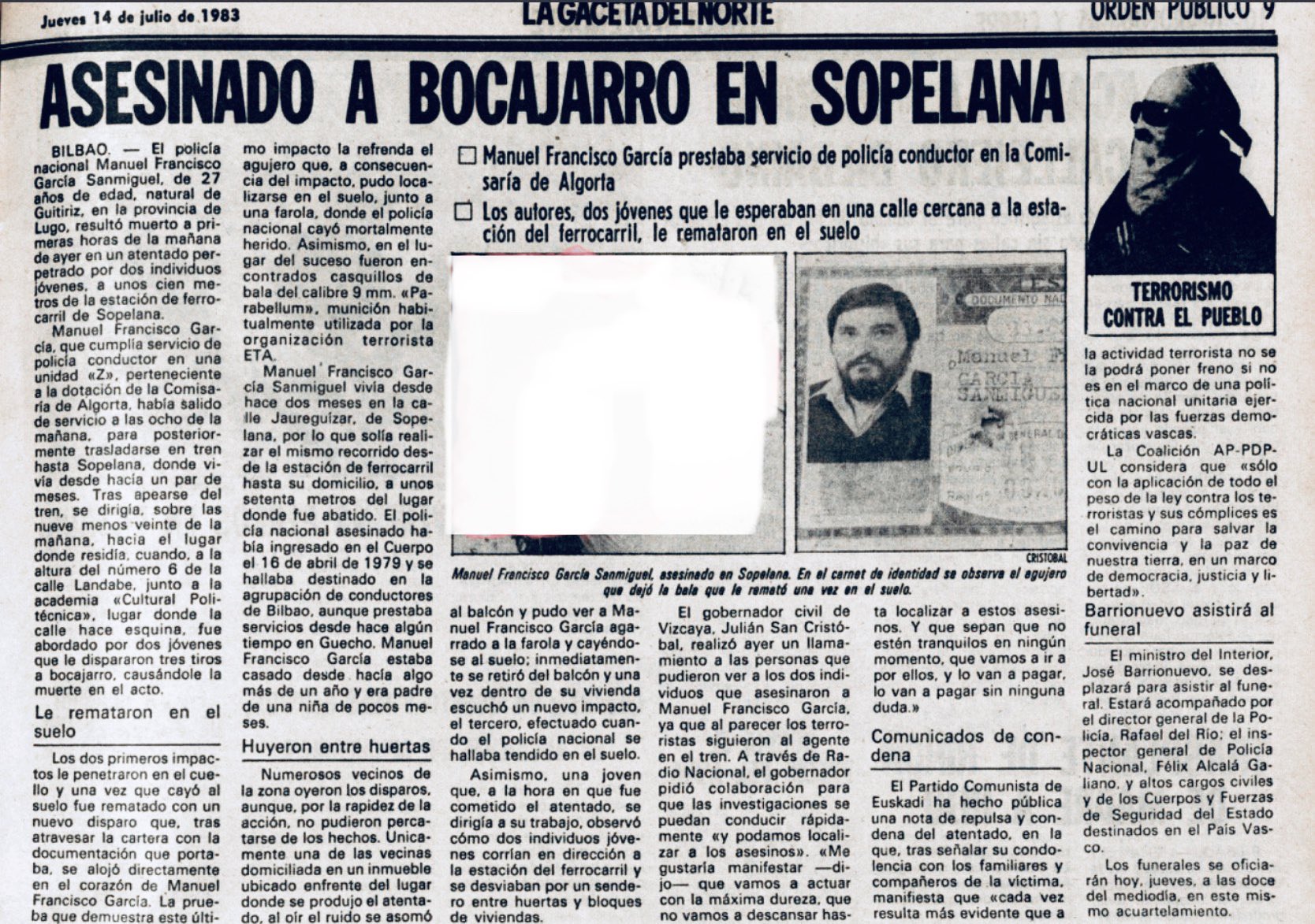 A las nueve menos cuarto de la mañana del 13 de julio de 1983, ETA asesinaba a tiros en las inmediaciones de la estación del ferrocarril de la localidad vizcaína de Sopelana al policía nacional MANUEL FRANCISCO GARCÍA SAN MIGUEL, cuando regresaba a su domicilio tras acabar su servicio como conductor de un coche celular del 091 en Guecho.