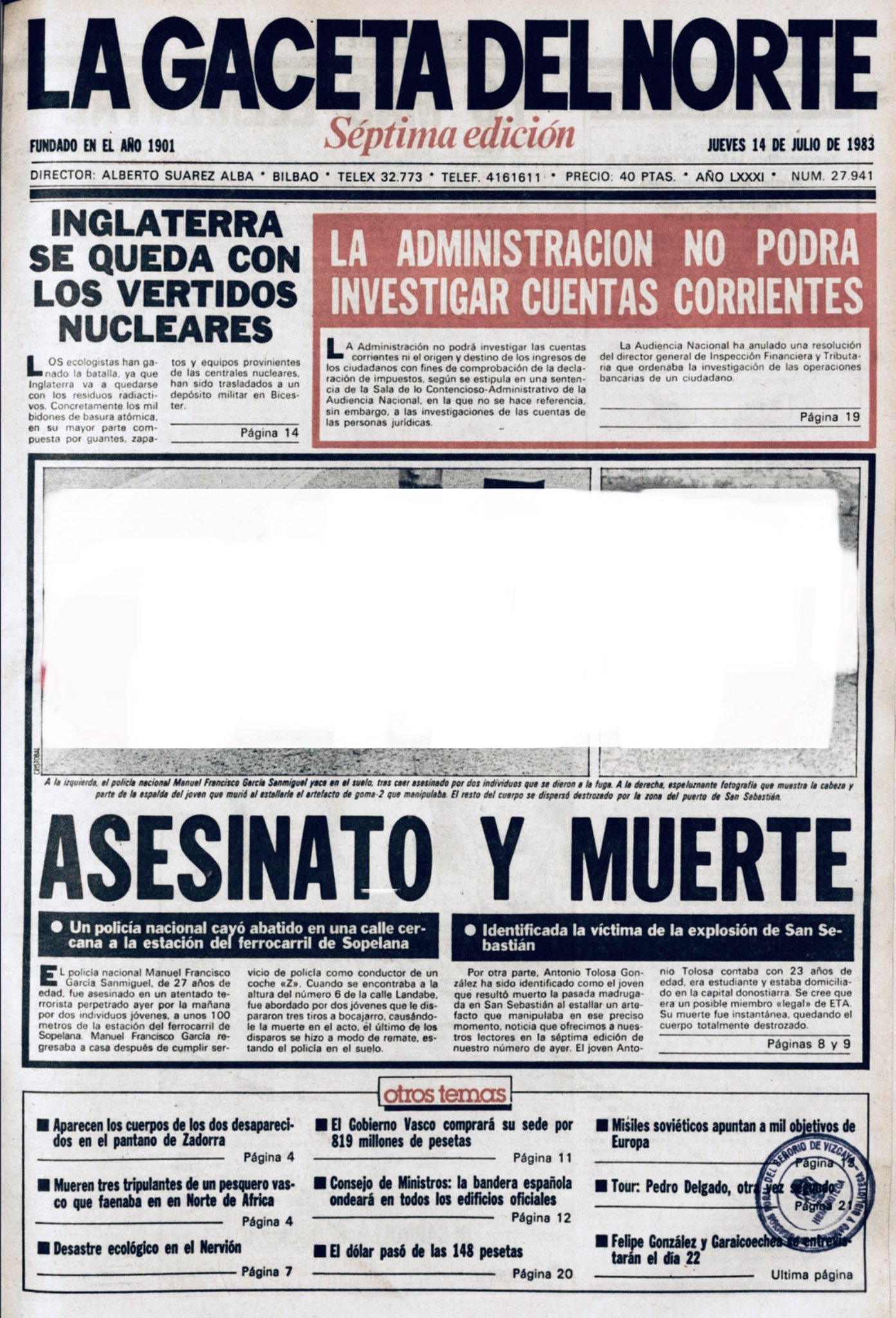 AURELIO NAVÍO NAVÍO asesinado el 13 de julio de 1980 en Orio