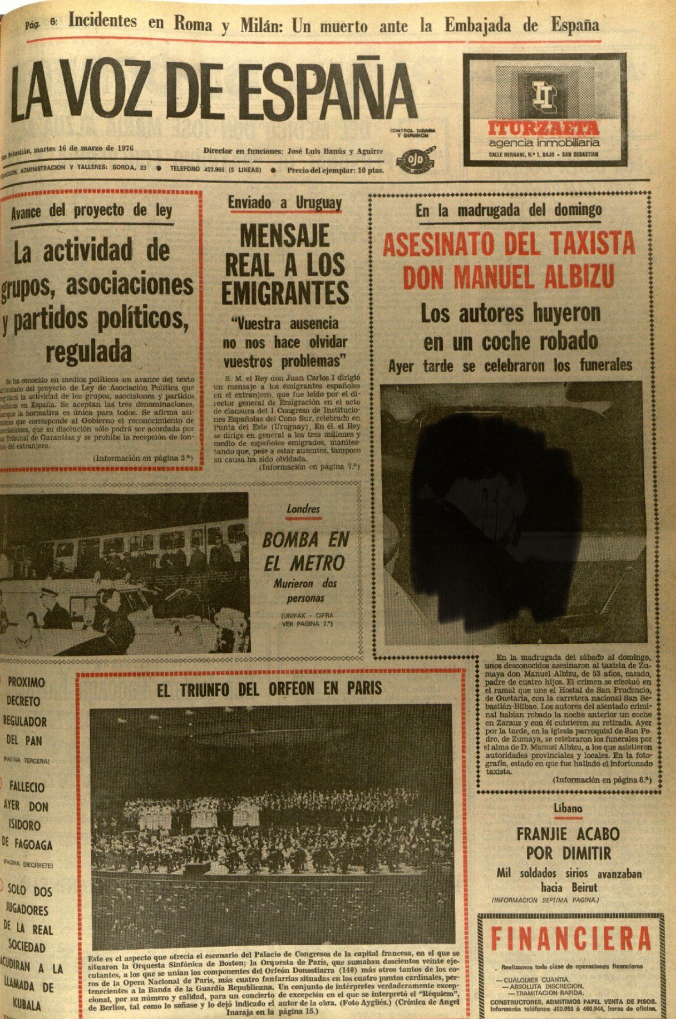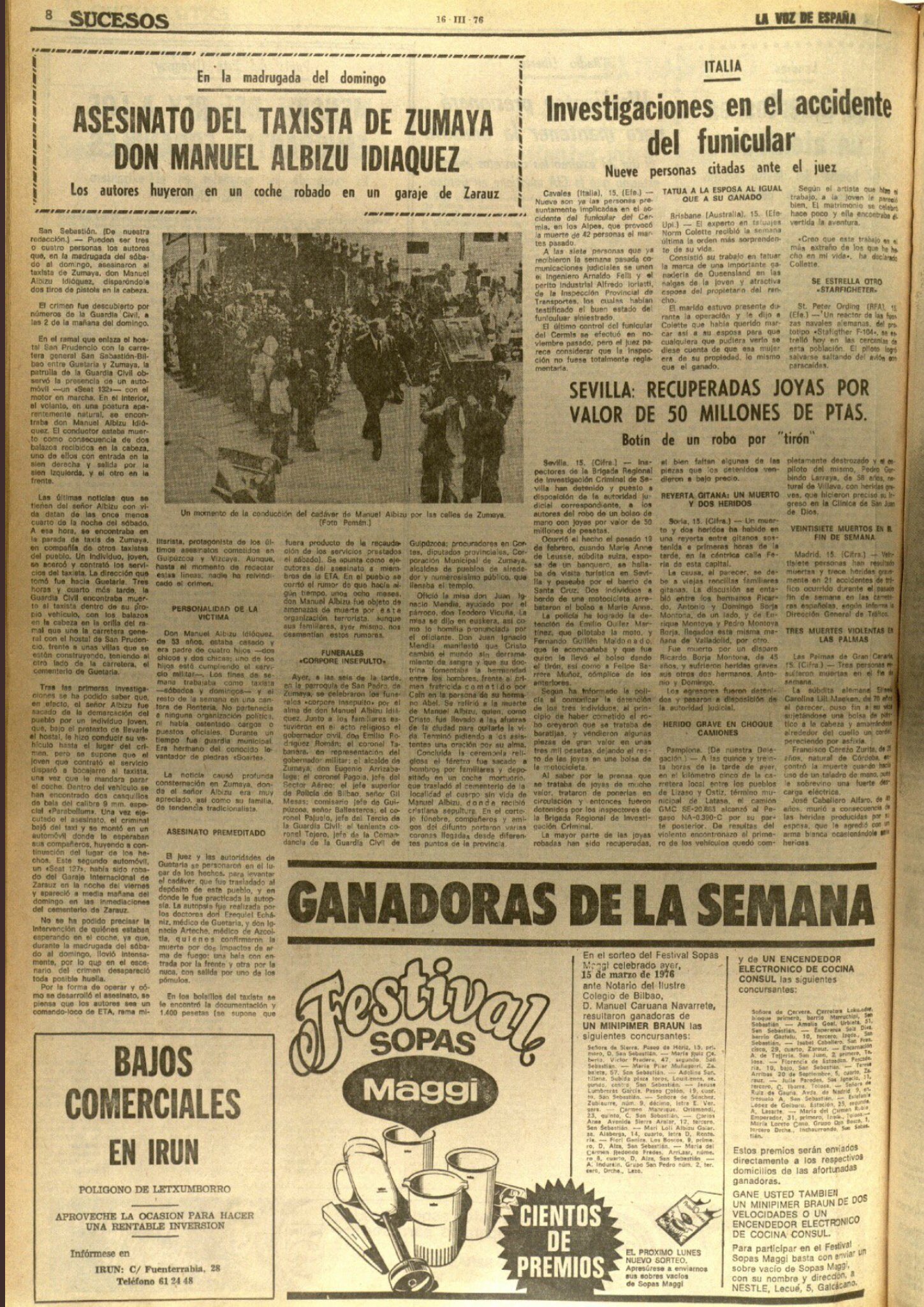 El 13 de marzo de 1976 ETA asesinaba en la localidad guipuzcoana de Guetaria (Guipúzcoa) a MANUEL ALBIZU IDIÁQUEZ cuando conducía su taxi por la carretera general de Bilbao a San Sebastián. Un terrorista se había subido al taxi en Zumaya e hizo que se desviara en un cruce existente a mano derecha de esta carretera. Allí mismo, le disparó dos tiros en la cabeza y lo dejó dentro del taxi. Así lo encontraron poco después, en torno a las 8:30 horas, una pareja de novios, que se extrañó al ver un coche con las luces encendidas y el motor en marcha en un paraje alejado de la carretera. Al acercarse descubrieron el cuerpo sin vida de Manuel con el rostro ensangrentado.