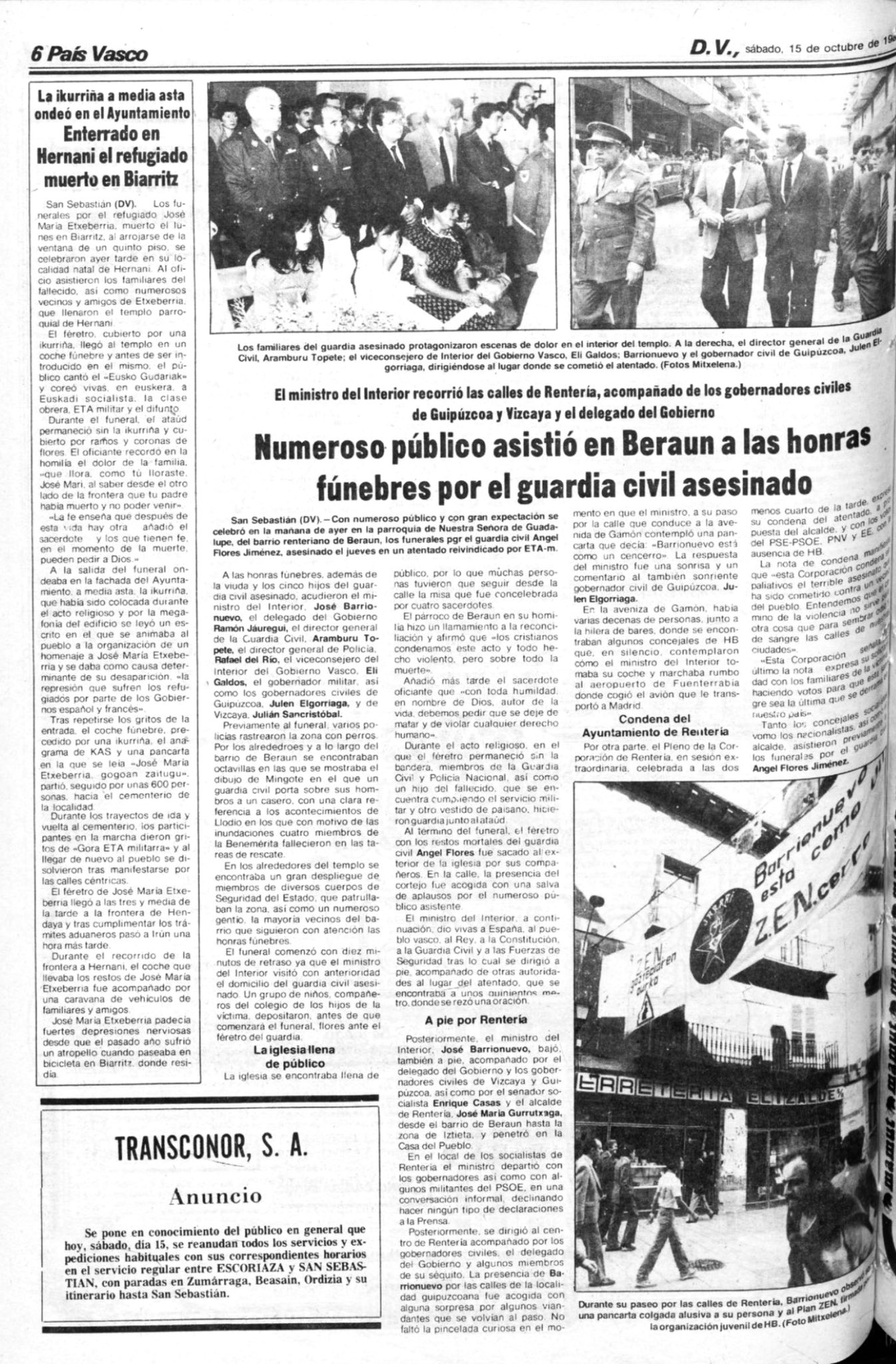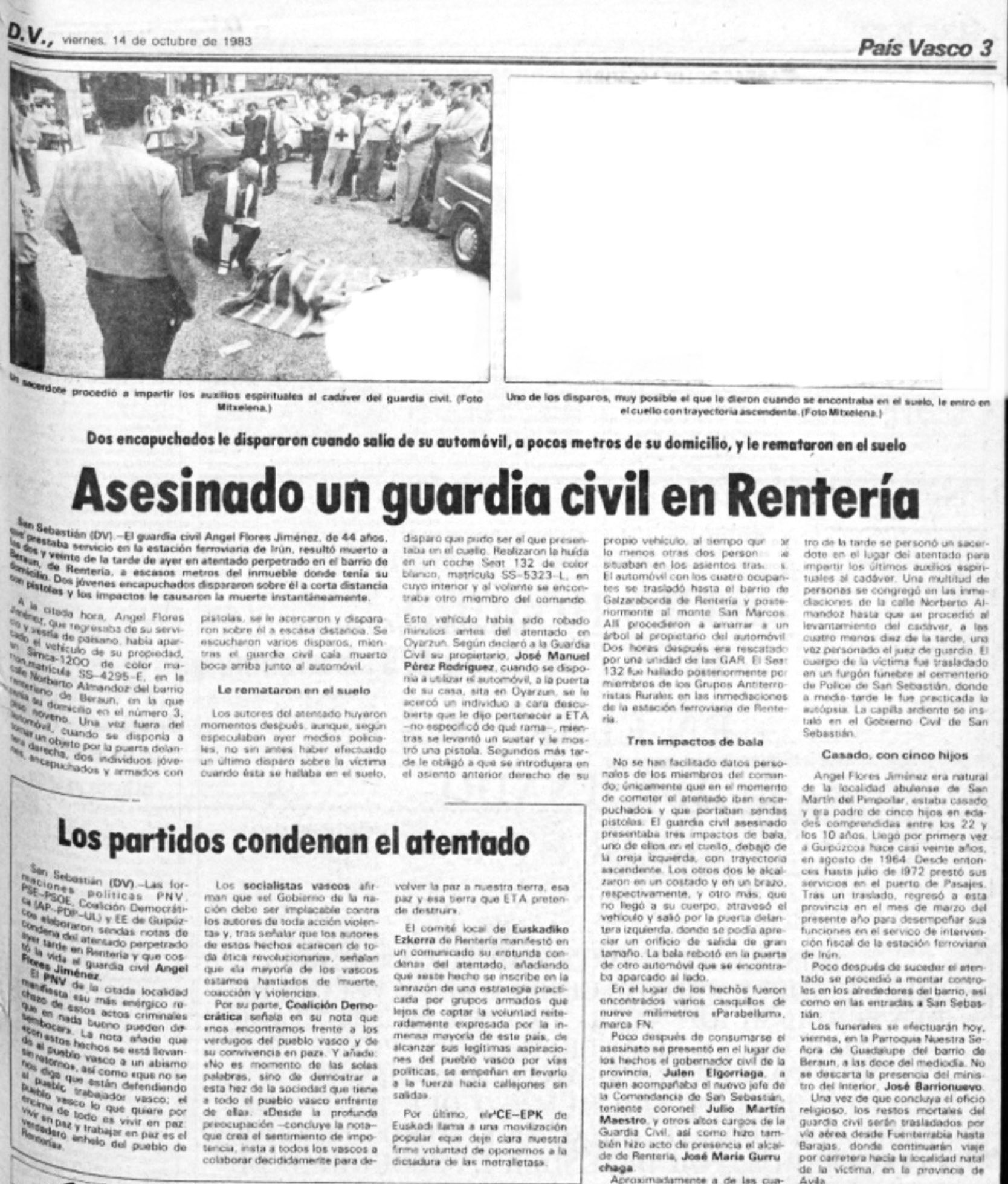 A las 14:30 horas del 13 de octubre de 1983, la banda terrorista ETA asesinaba en la localidad guipuzcoana de Rentería al guardia civil ÁNGEL FLORES JIMÉNEZ. A esa hora el agente se dirigía a su casa para comer. Cuando descendía de su coche, sin uniforme y desarmado, dos terroristas a cara descubierta le dispararon a bocajarro, alcanzándole tres disparos, uno de ellos en el cuello que le provocó la muerte en el acto. Los pistoleros huyeron a continuación en un vehículo estacionado en las inmediaciones, a cuyo volante esperaba, a cara descubierta, un tercer individuo. En el lugar de los hechos se recogieron tres casquillos del calibre 9 milímetros parabellum.