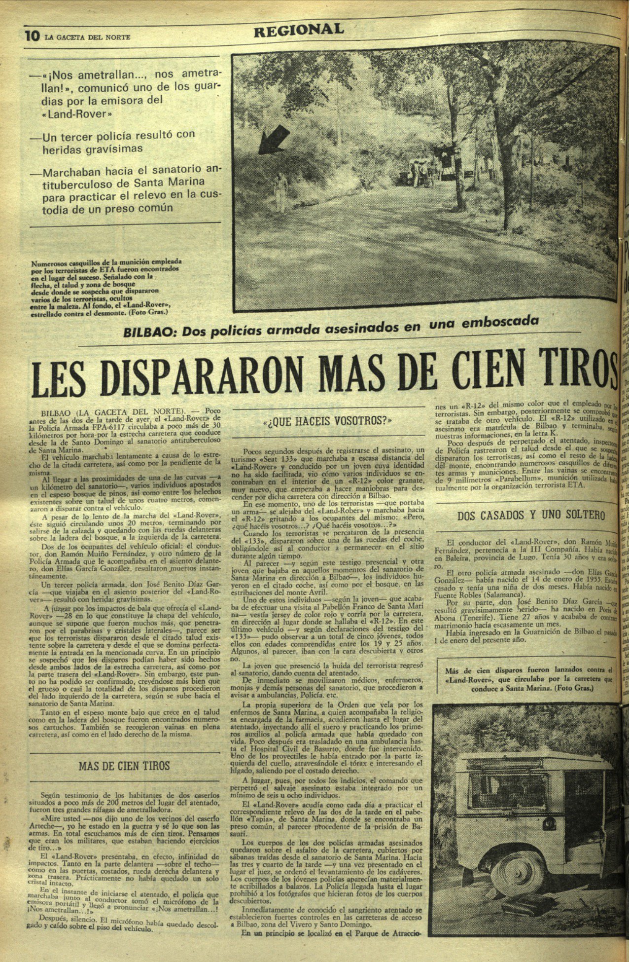 Elías García y Ramón Muiño consiguieron salir del Jeep, que se había desviado de su trayectoria chocando contra un talud, por su propio pie, aunque cayeron materialmente uno encima del otro junto a la puerta derecha, con el pecho y la cara cubiertos de sangre por los impactos recibidos. José Benito, que viajaba en la parte trasera del vehículo, fue trasladado gravemente herido al Hospital Civil de Bilbao.