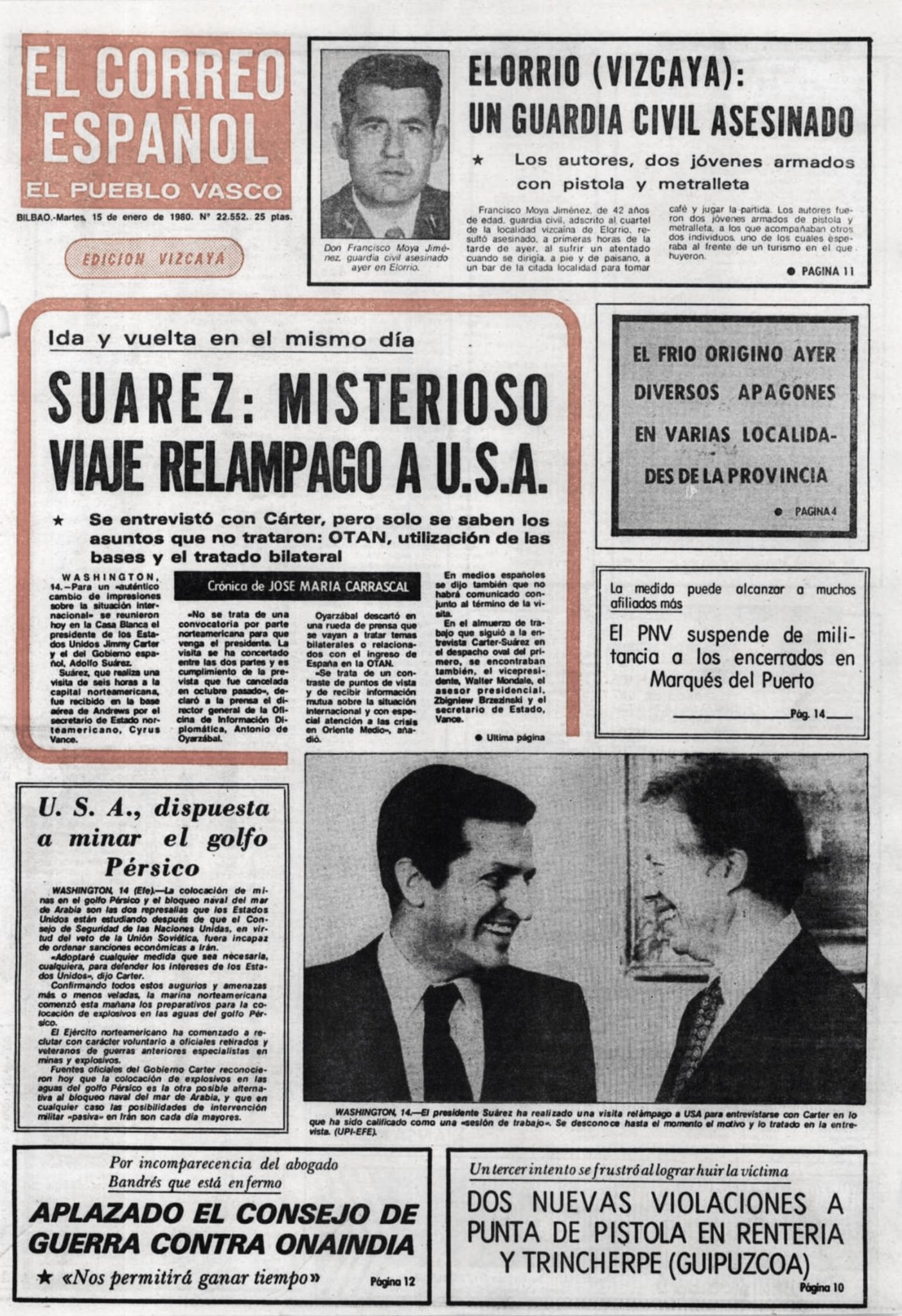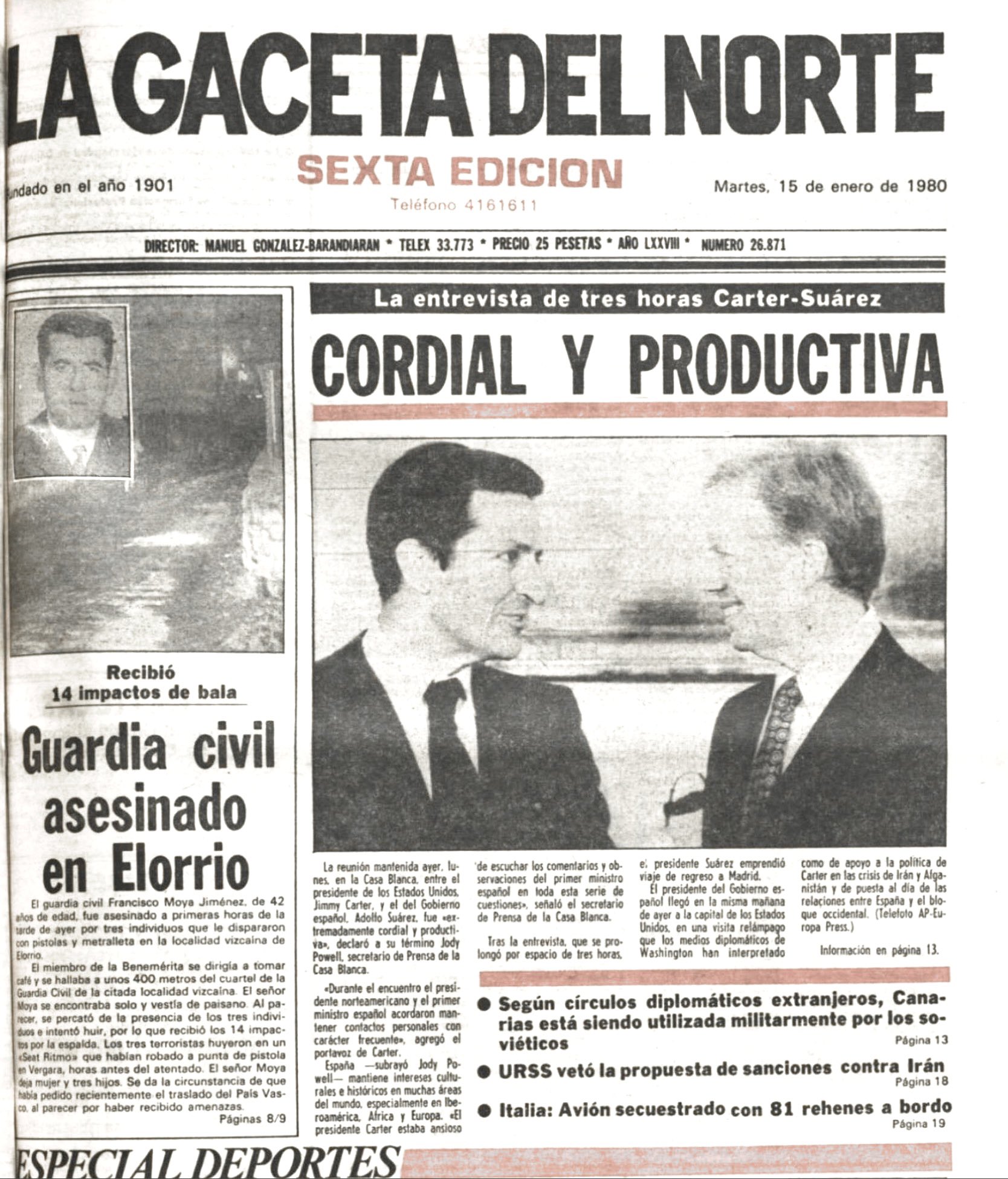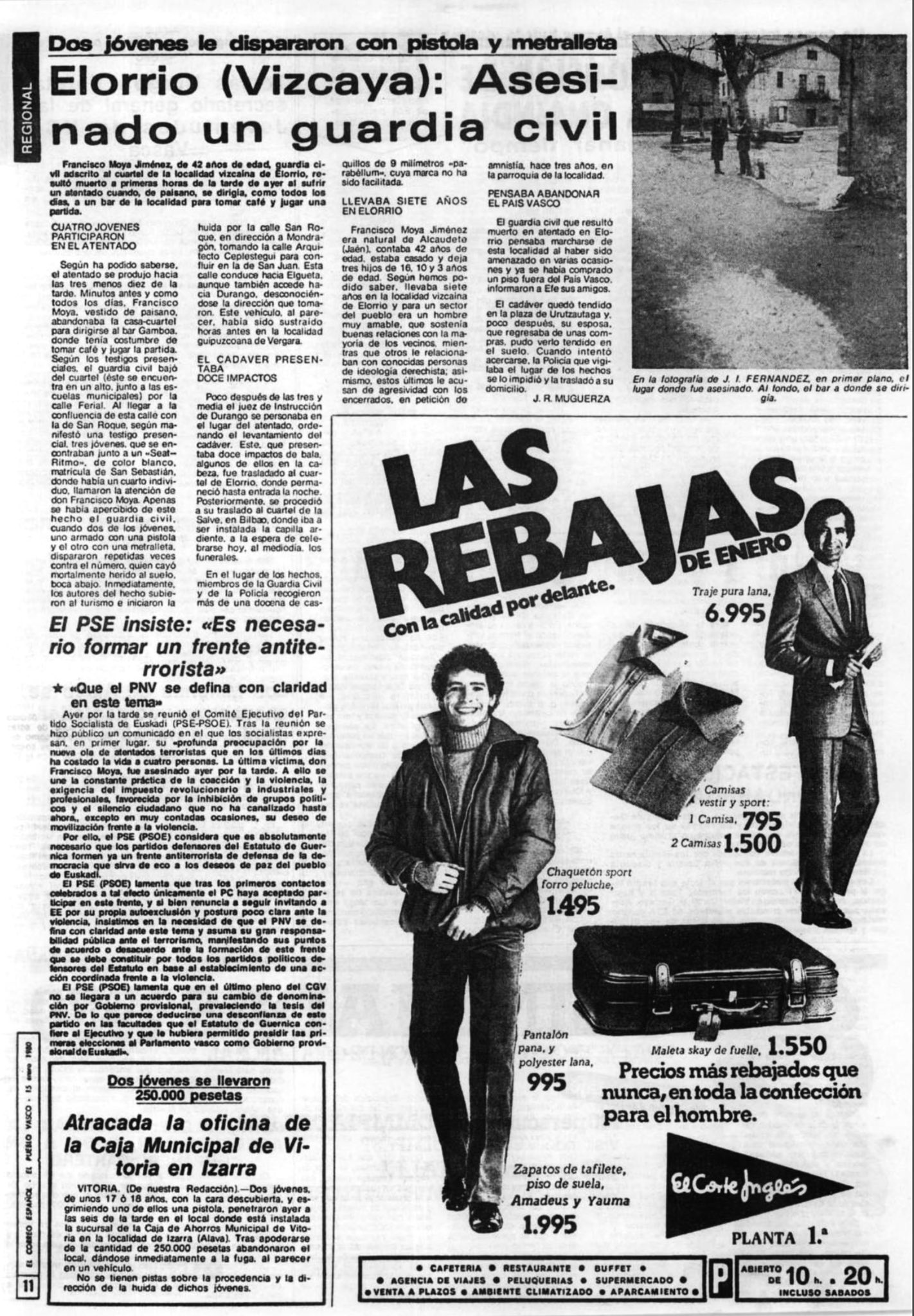 Hacia las tres de la tarde del 14 de enero de 1980, tres terroristas de ETA asesinaban a tiros en Elorrio al guardia civil FRANCISCO MOYA JIMÉNEZ, a cuatrocientos metros de la casa cuartel de esa localidad vizcaína.