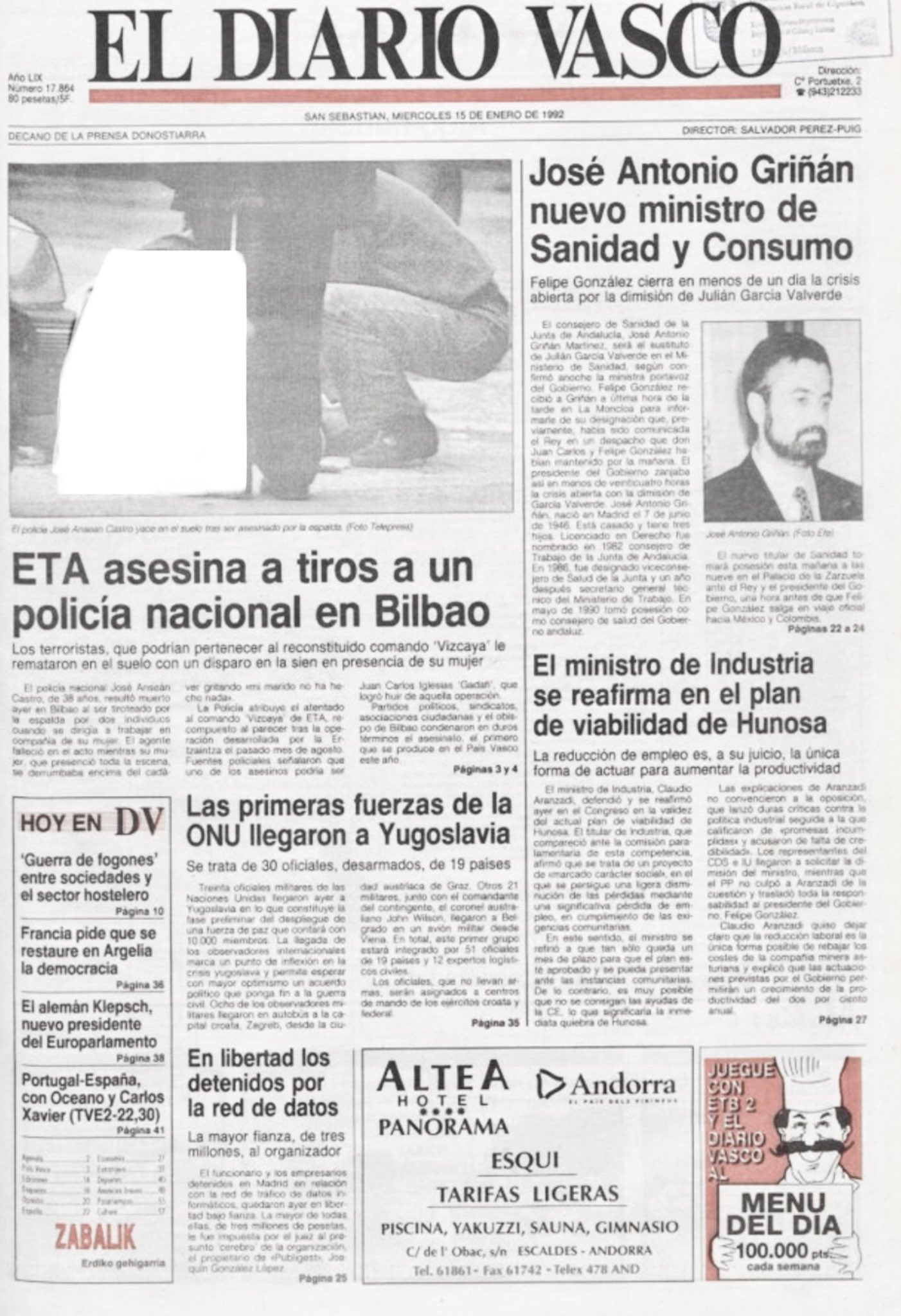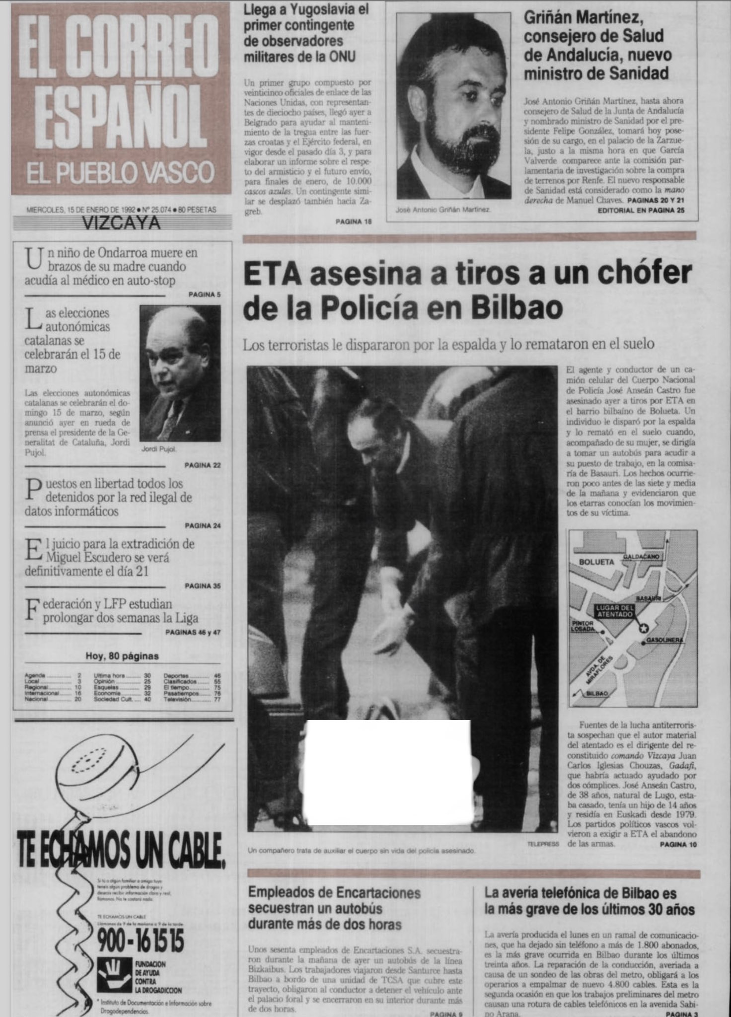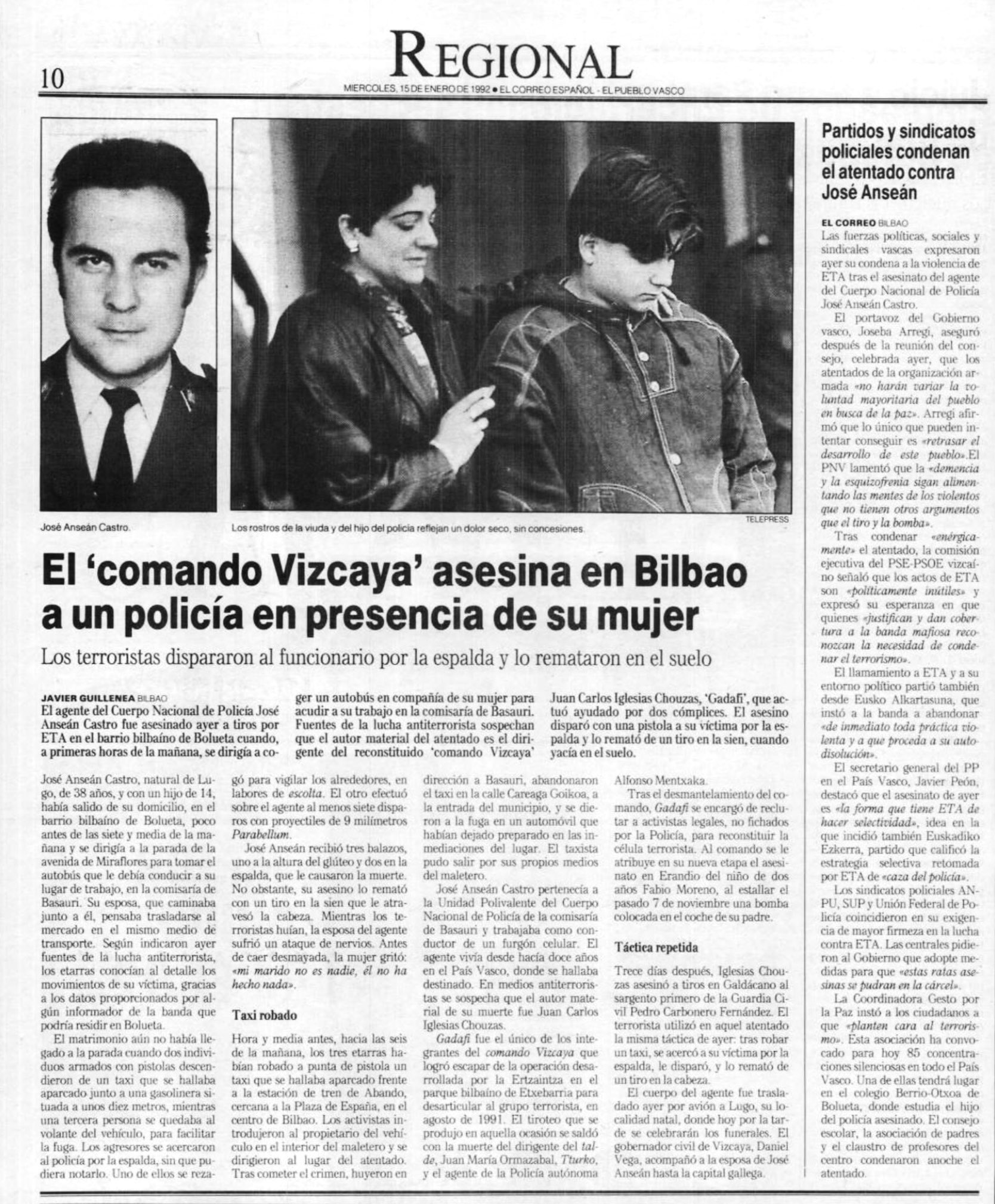 14 de enero de 1992 el policía nacional JOSÉ ANSEÁN CASTRO fue abatido a tiros en torno a las 7:30 de la mañana. José se dirigía con su mujer a coger el autobús que debería haberlo llevado hasta su trabajo en el cuartel de la Policía Nacional de Basauri. Dos individuos descendieron de un taxi robado y realizaron un número indeterminado de disparos que acabaron con la vida del policía.