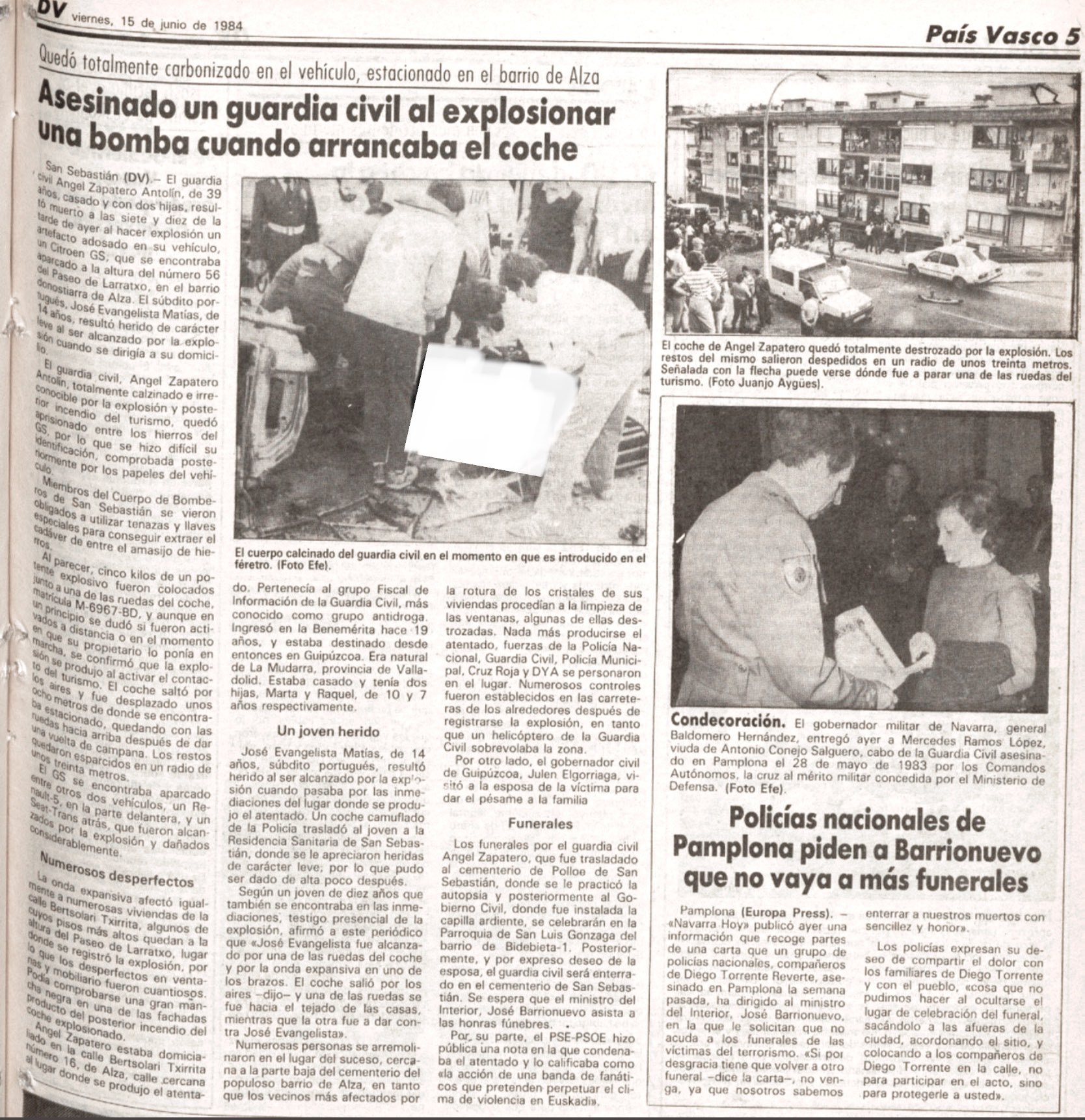 A las 19:20 horas del jueves 14 de junio de 1984, el guardia civil ÁNGEL ZAPATERO ANTOLÍN moría en el Paseo de Larracho de San Sebastián destrozado por la explosión de una bomba colocada por ETA, que estalló en el momento en que accionaba la llave de contacto de su coche. La onda expansiva despidió el vehículo del guardia civil a varios metros de distancia, envuelto en una columna de humo y fuego. Ángel falleció en el acto y su cuerpo, calcinado por las llamas, quedó atrapado en el amasijo de chatarra en que quedó convertida la estructura de su vehículo, un Citroën GS con matrícula de Madrid.