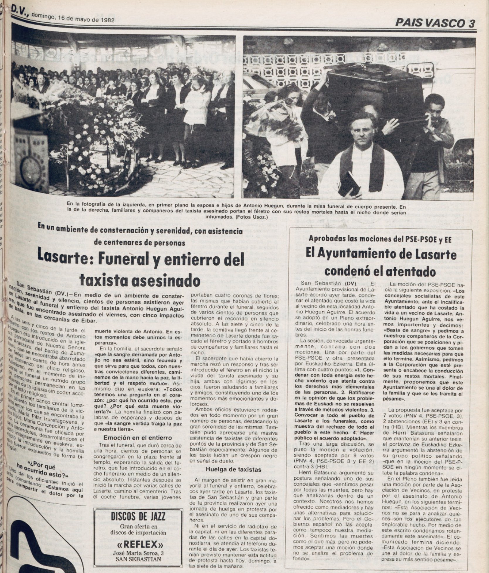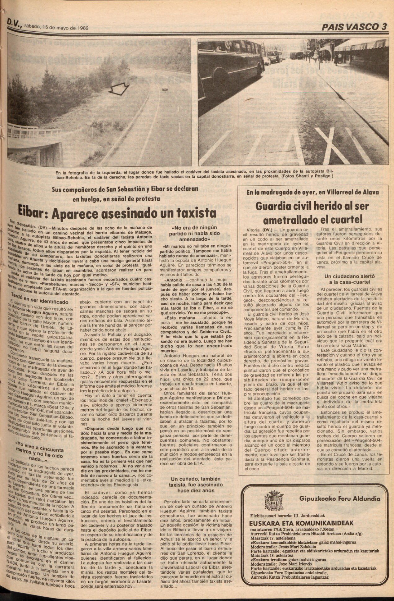 Un año después del asesinato de los dos guardias civiles en Lemona, el 14 de mayo de 1982 la banda terrorista ETA asesinaba en Éibar (Guipúzcoa) al taxista ANTONIO HUEGUN AGUIRRE, vecino de Lasarte. Fue encontrado muerto a las ocho y cinco de la mañana en un pequeño camino contiguo a la autopista Bilbao-Behobia a la altura del kilómetro 62, en las inmediaciones de Éibar. Fue descubierto por dos vecinos de un caserío que, en un primer momento, pensaron que la víctima estaba durmiendo. Se dirigieron a él en términos jocosos, pero al acercarse comprobaron que estaba muerto, por lo que dieron aviso inmediatamente a la Policía Municipal de Éibar. La víctima no llevaba documentación alguna, pero sí cinco mil pesetas, probablemente el producto de su jornada de trabajo.