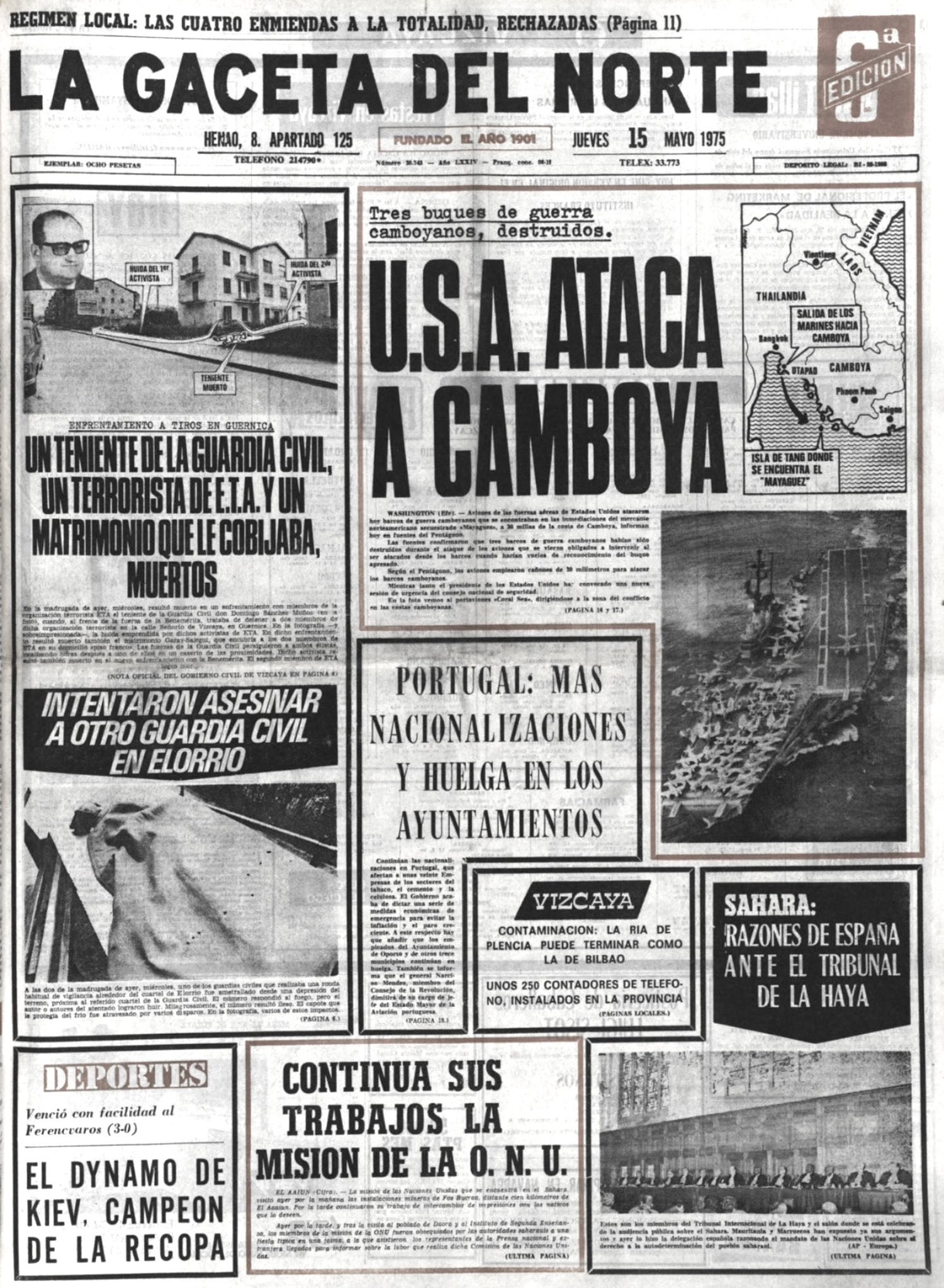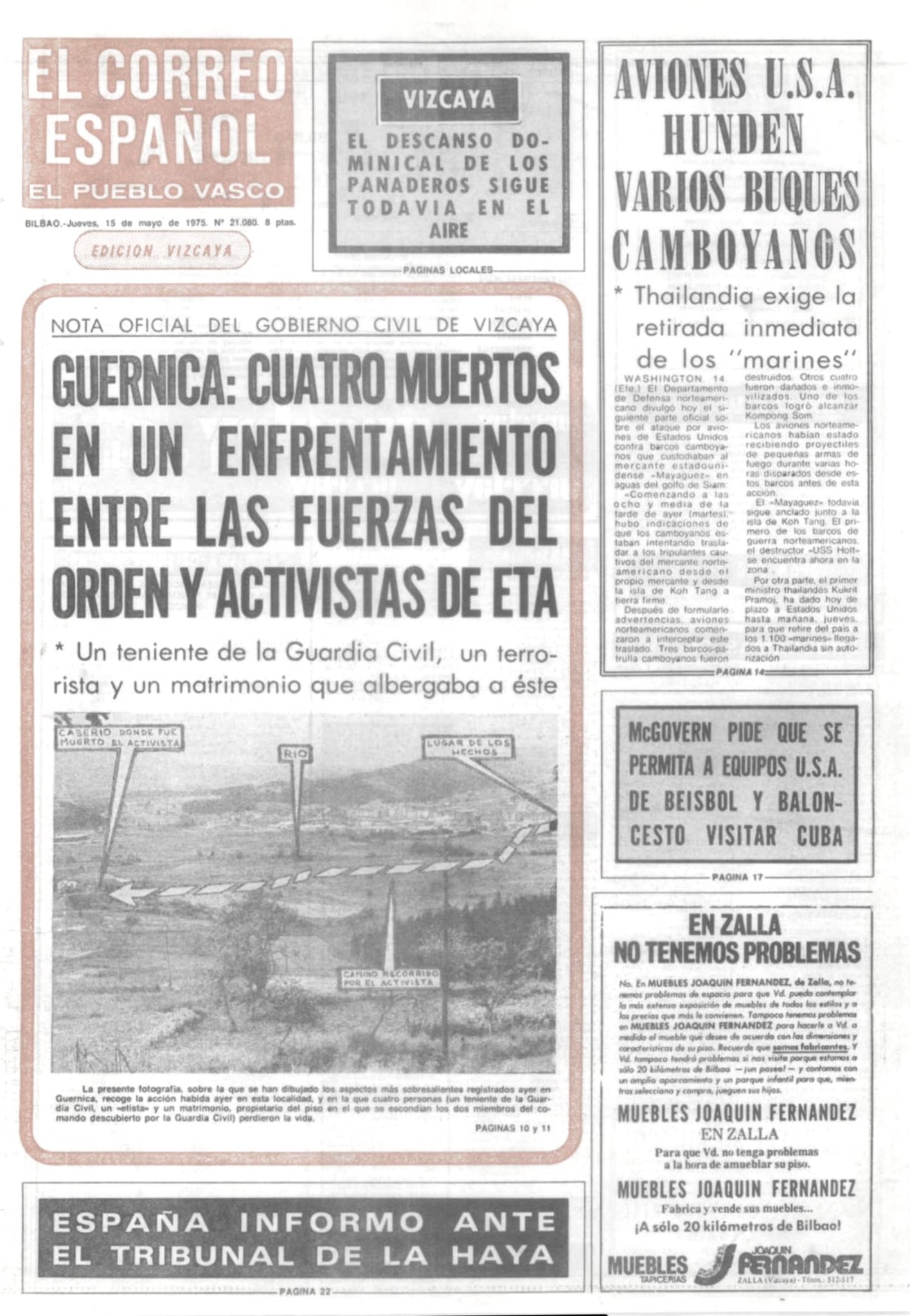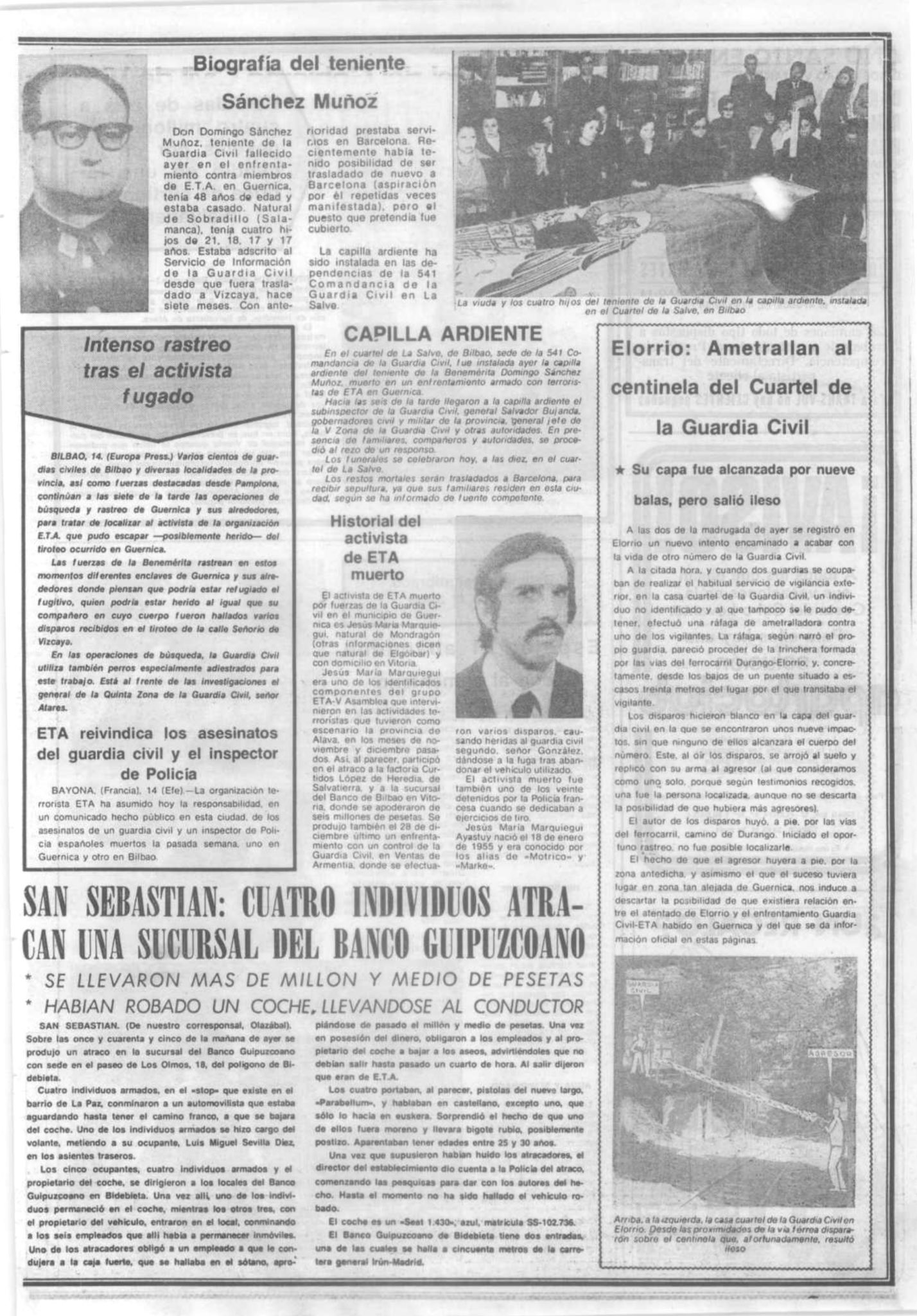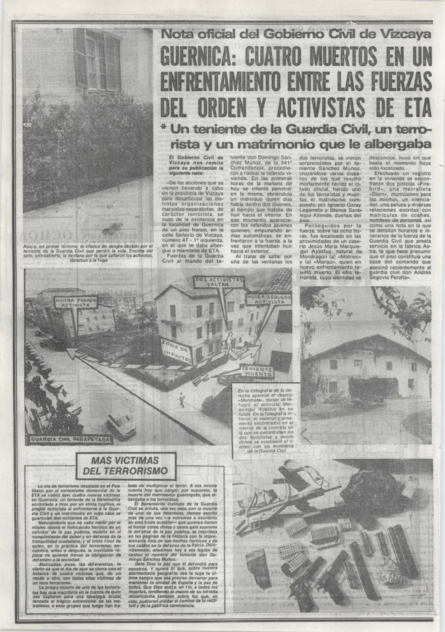 En la madrugada del 14 de mayo de 1975, durante el registro de un piso franco de la banda terrorista ETA en Guernica, resultó muerto el teniente de la Guardia Civil DOMINGO SÁNCHEZ MUÑOZ. Entre las cuatro y las cinco de la madrugada, efectivos de la Guardia Civil comenzaron a tomar posiciones en la carretera de acceso a Guernica desde Bilbao, así como en el interior de una zona verde bordeada por los bloques de las denominadas Casas del Estado -unas edificaciones situadas a la derecha de la calzada en dirección a Guernica- muy próximas al antiguo cuartel de la Guardia Civil.La Guardia Civil trataba de localizar a miembros de la banda terrorista en un piso franco de ETA situado en el número 47 de la calle Señorío de Vizcaya. Los etarras buscados eran, presuntamente, los autores del asesinato del agente Andrés Segovia Peralta, ocurrido ocho días antes.Hacia las seis de la mañana, cuando la manzana de casas había sido rodeada por los guardias civiles, varios agentes penetraron en el portal número 47 para proceder a un registro. Ascendieron primero al piso superior y, posteriormente, se dirigieron a la planta baja. Los agentes llamaron a la puerta: «Guardia Civil, ¡abran!». En el umbral de la puerta apareció el matrimonio formado por Ignacio Garay Lejarreta, de 53 años, y su esposa Blanca Saralegui Allende, de 42. Los miembros de la Guardia Civil preguntaron si había alguna persona más en el piso y respondieron que «dos chicos». En ese momento, los guardias civiles, que se encontraban frente al matrimonio, oyeron varias detonaciones que procedían de una de las ventanas del piso por la que trataban de huir los dos etarras.