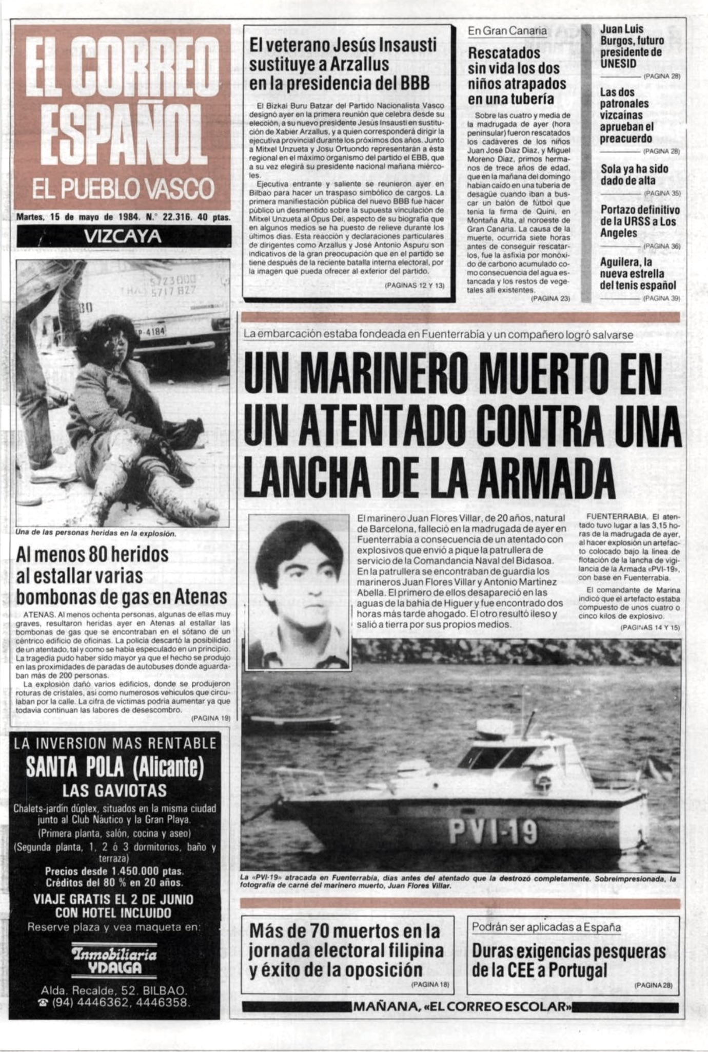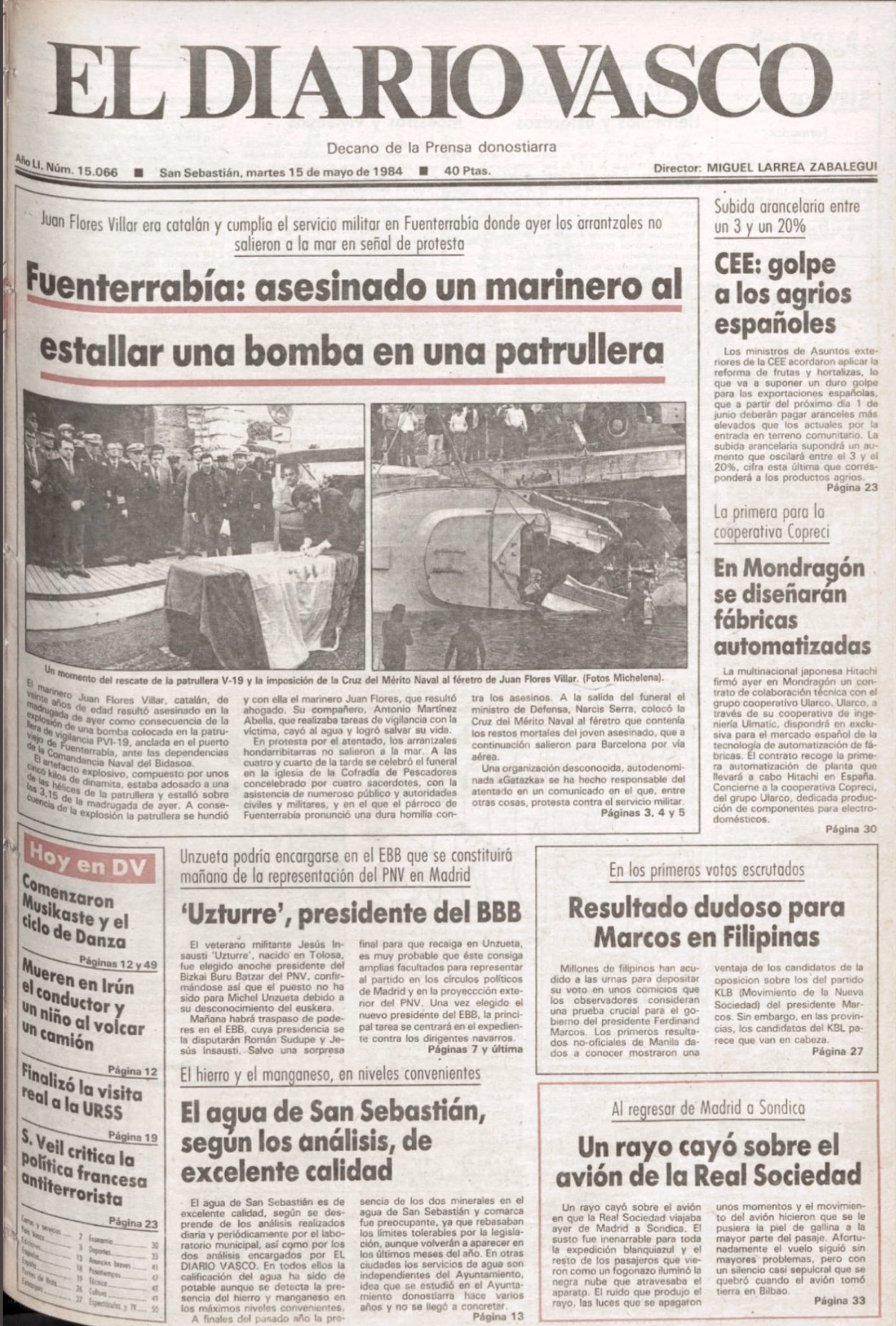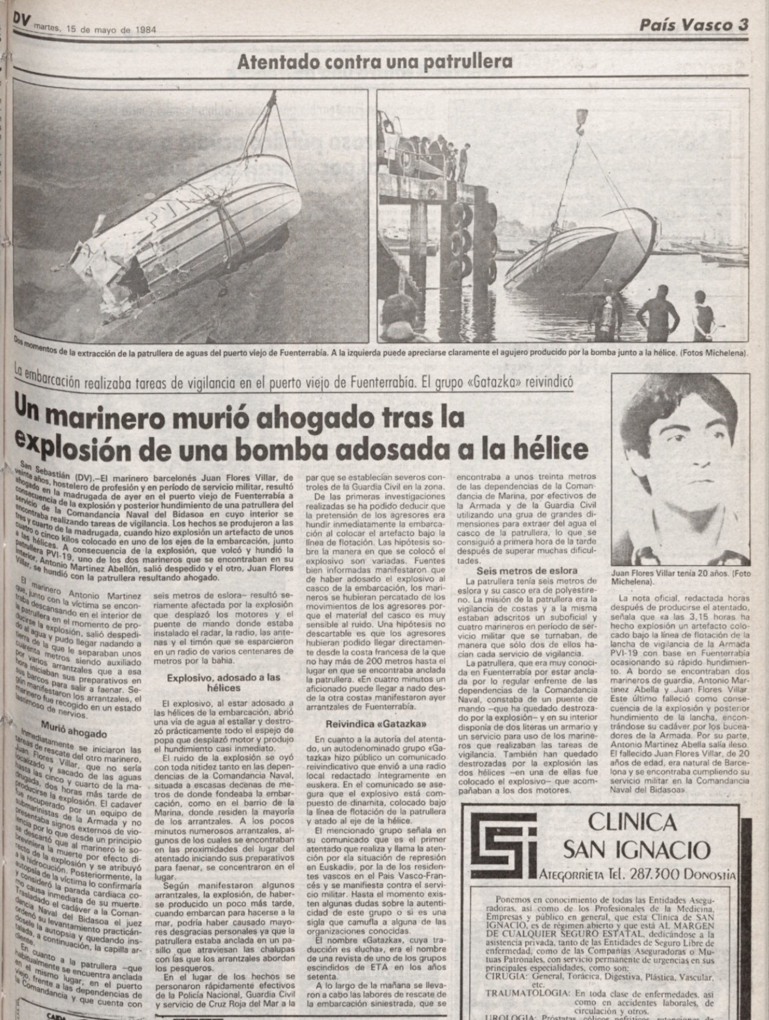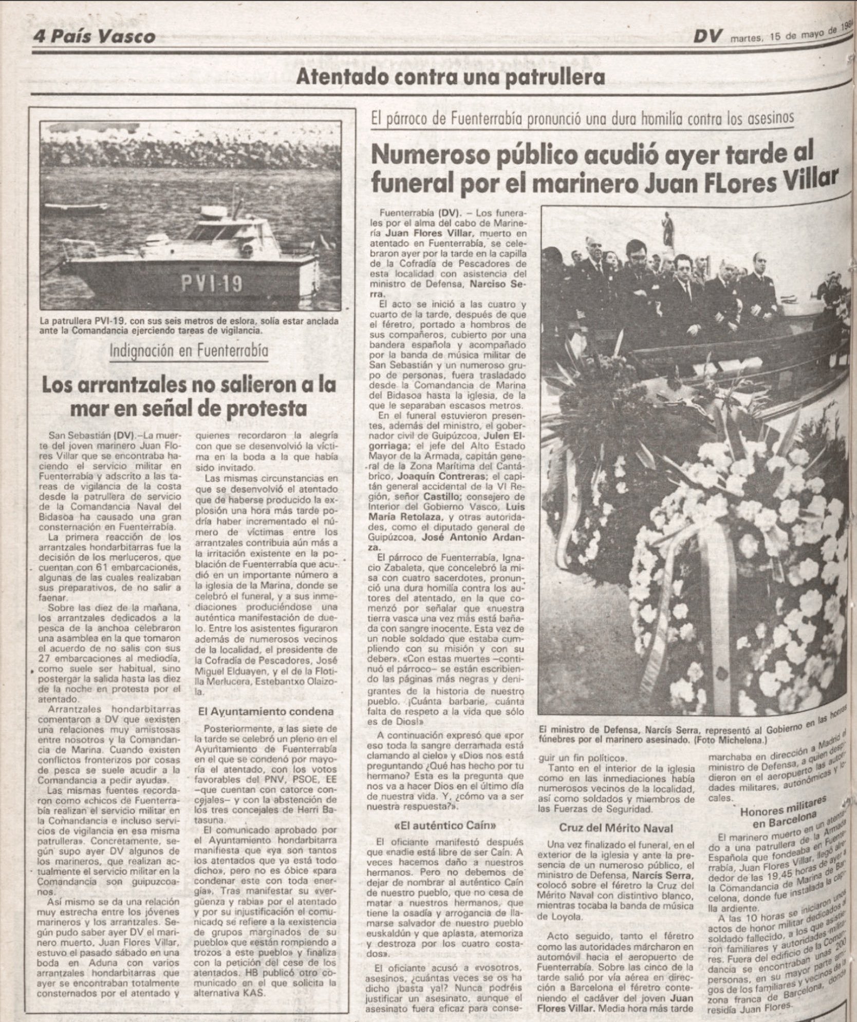 Durante la madrugada del día 14 de mayo de 1984 ETA atentaba en Fuenterrabía (Guipúzcoa) contra una lancha de vigilancia portuaria de la Armada Española, mediante la colocación de una bomba que provocó su hundimiento y la muerte del cabo JUAN FLORES VILLAR. La embarcación se hallaba anclada a unos treinta metros de la orilla, en la desembocadura del río Bidasoa, no muy lejos de la Comandancia Naval.El cabo Flores murió ahogado en el interior de la embarcación atrapado en su camarote, y no por el efecto de la onda expansiva.