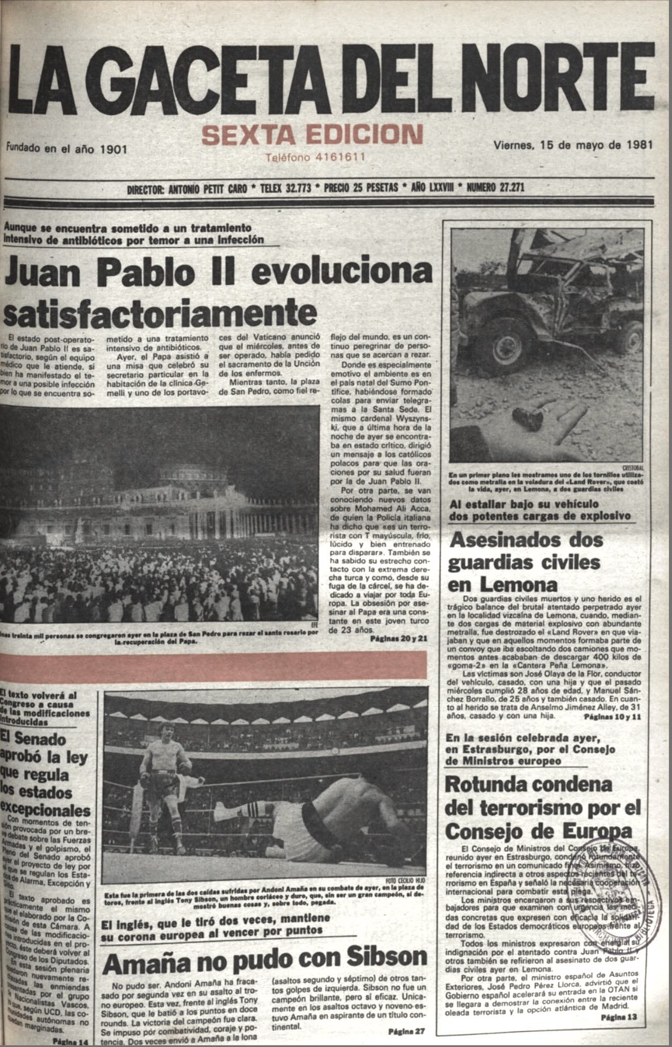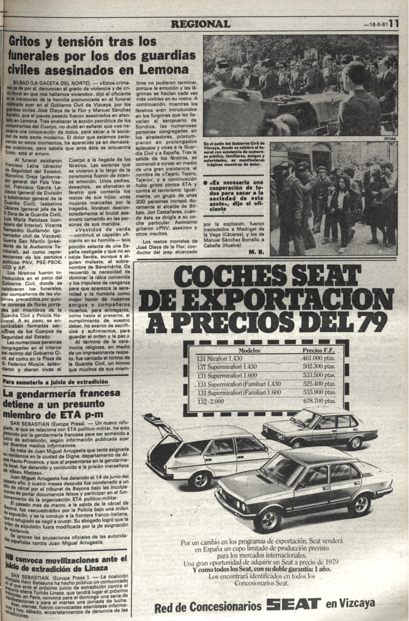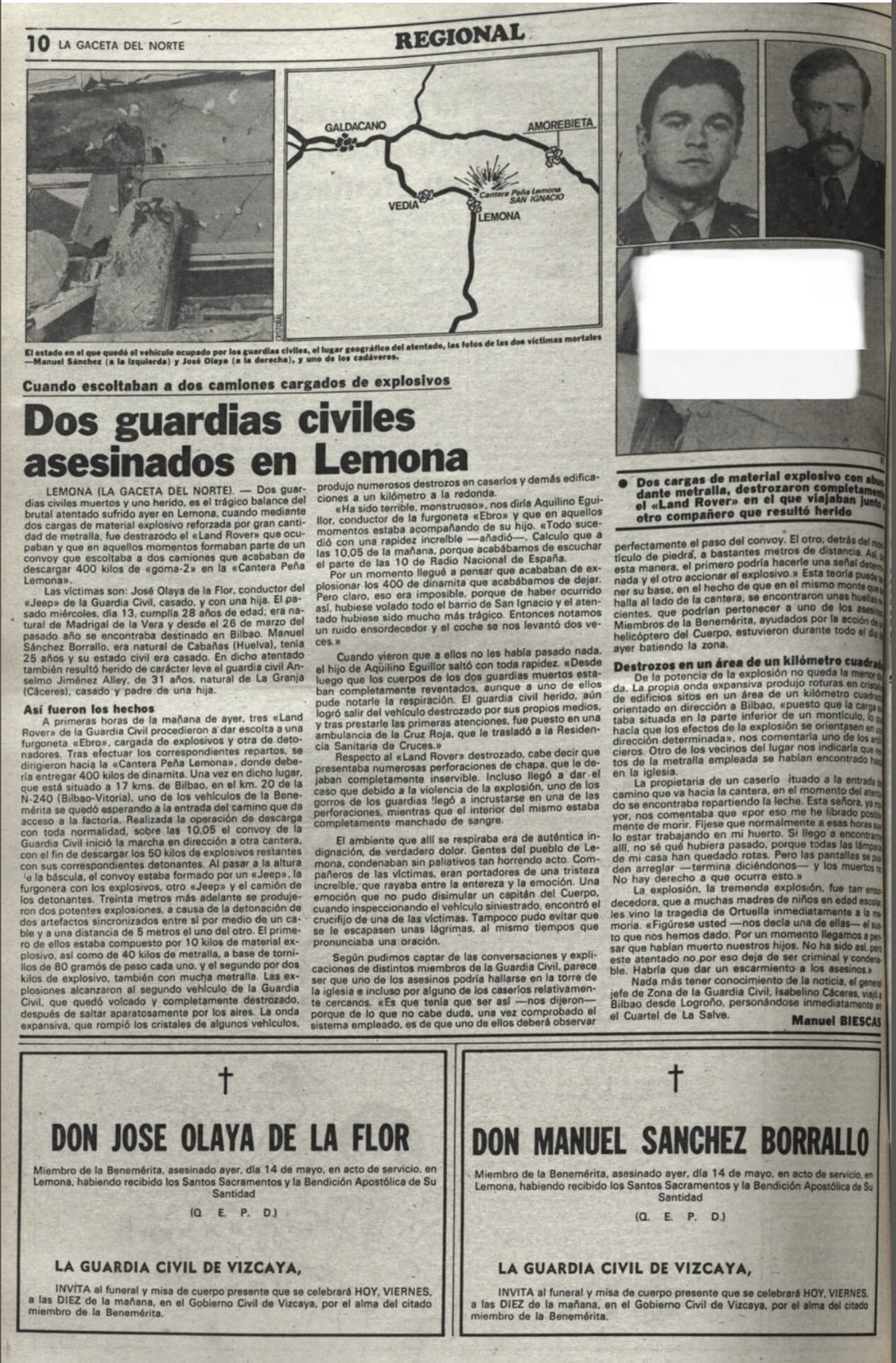 A las diez de la mañana del jueves 14 de mayo de 1981, dos guardias civiles resultaron muertos y un tercero herido en Lemona al ser alcanzado de lleno el vehículo en el que viajaban por la explosión de un potente artefacto, compuesto por diez kilos de Goma 2 y abundante metralla, que había sido colocado a un lado de la carretera por la que circulaban. La explosión provocó la muerte en el acto de JOSÉ OLAYA DE LA FLOR, conductor del vehículo. Pocos minutos después fallecía MANUEL SÁNCHEZ BARALLO, que ocupaba el otro asiento delantero. Anselmo Jiménez Allen, que iba sentado detrás, quedó atrapado entre los restos del vehículo, siendo necesario el uso de soplete para rescatarle. Fue trasladado gravemente herido al Hospital de Cruces de Bilbao