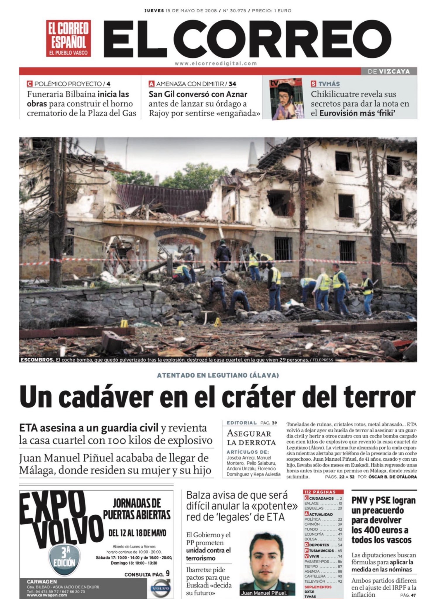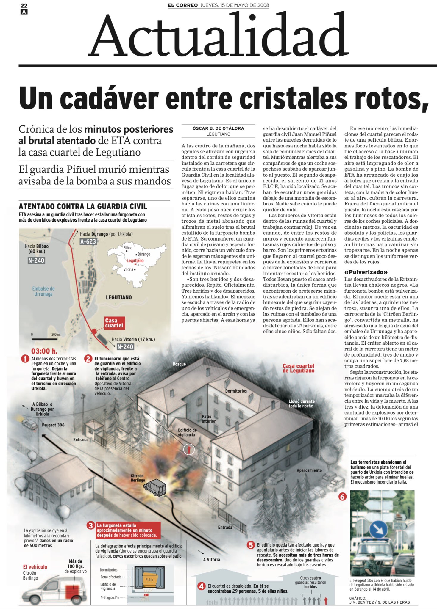 El guardia civil JUAN MANUEL PIÑUEL VILLALÓN, fue asesinado por ETA en Villarreal de Álava (Legutiano) el 14 de mayo de 2008. Juan Manuel ocupaba el puesto de vigilancia de la casa cuartel de la Guardia Civil en la localidad alavesa. En torno a las tres de la madrugada vio cómo unos individuos abandonaban una furgoneta a unos diez metros del cuartel, pegada al perímetro de seguridad. No le dio tiempo a nada, porque los terroristas habían programado la bomba para que estallase casi inmediatamente y sin dar tiempo a desalojar. Mientras avisaba, la furgoneta, cargada con cien kilos de explosivo, saltó por los aires. ETA buscaba una matanza, como otras cometidas anteriormente contra casas cuarteles. El terrorista que aparcó la furgoneta, que cubría su rostro con un pasamontañas, activó el temporizador y salió corriendo hacia otro coche en el que emprendió la huida.