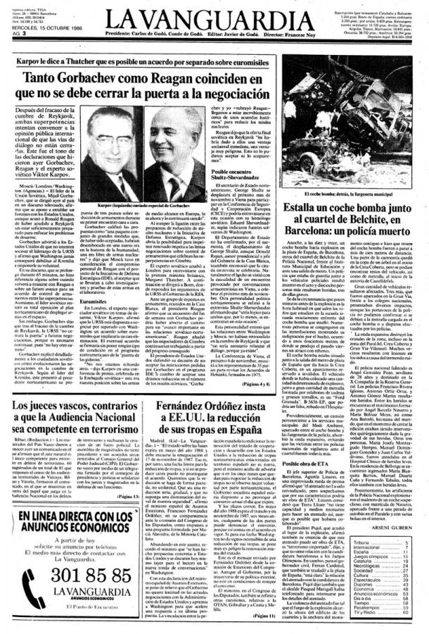 En torno a las 22:30 horas del 14 de octubre de 1986, la explosión de un coche-bomba colocado por la banda terrorista ETA frente al cuartel de la 411 Bandera de la Policía Nacional, en la plaza de España de Barcelona, asesinaba al policía ÁNGEL GONZÁLEZ DEL POZO y provocaba heridas a otras catorce personas, cuatro de ellas también policías.