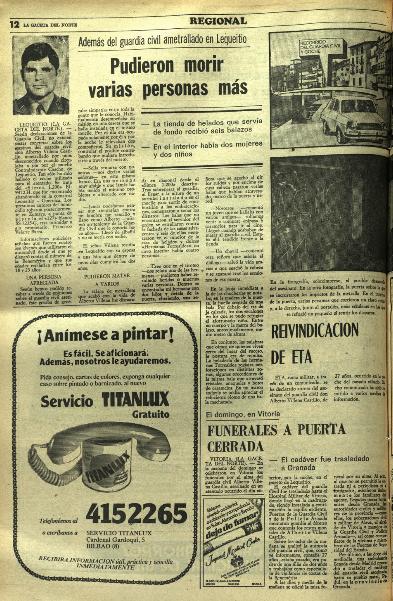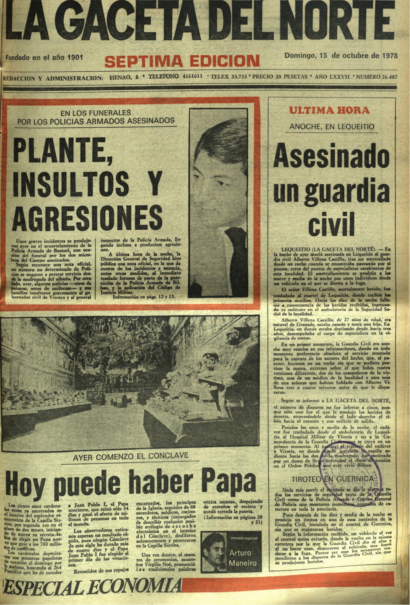 A las nueve y media de la noche del 14 de octubre de 1978, cuatro pistoleros de la banda terrorista ETA asesinaban en Lequeitio (Vizcaya) al guardia civil ALBERTO VILLENA CASTILLO. La víctima fue ametrallada desde un vehículo cuando paseaba por los muelles portuarios de la localidad vizcaína, muy cerca del puesto de especialistas fiscales de la Guardia Civil en el que estaba destinado.