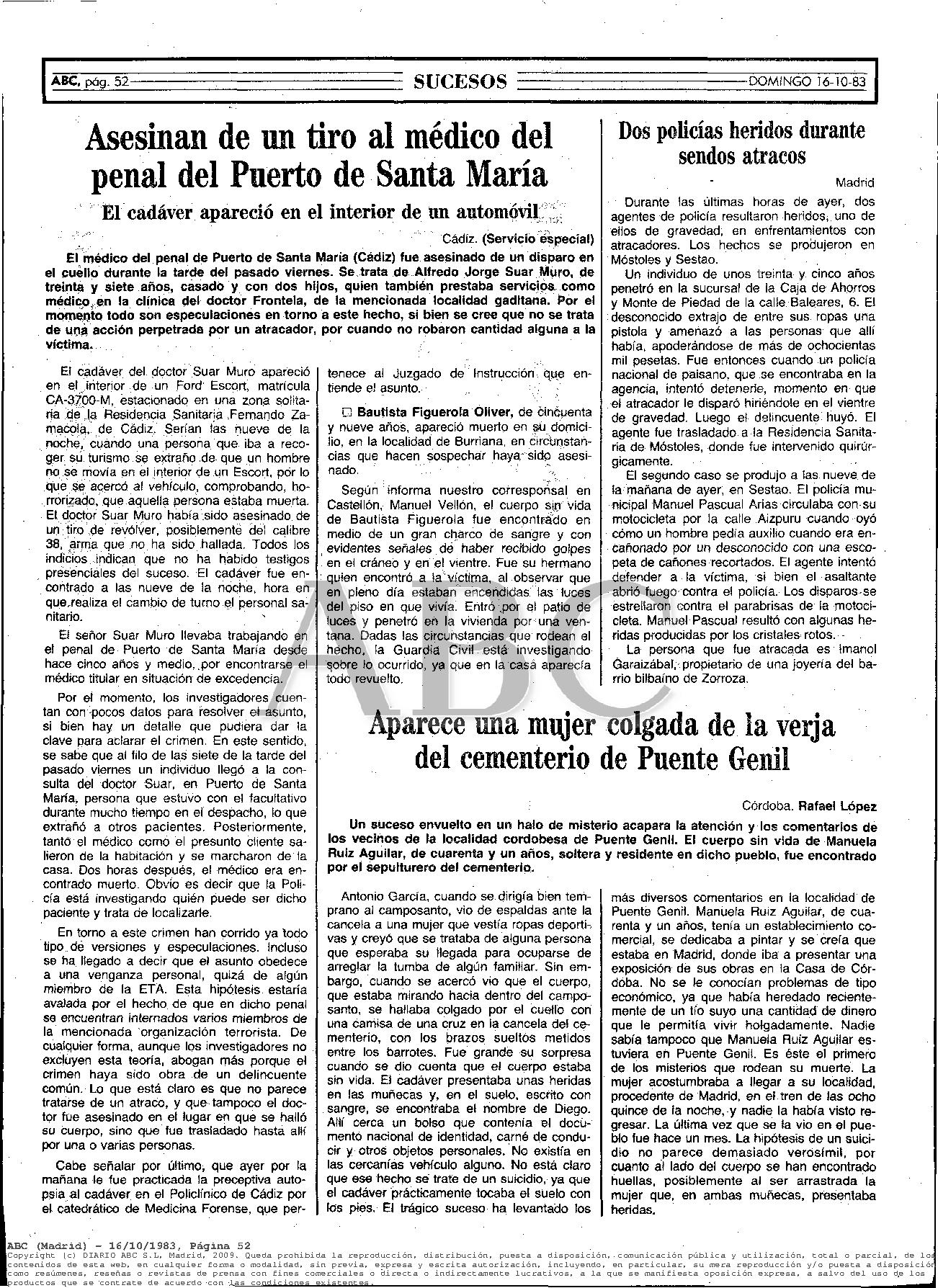 A las 18:00 horas del 14 de octubre de 1983, un individuo entró en la consulta del doctor ALFREDO JORGE SUAR MURO, médico pediatra y facultativo del penal de El Puerto de Santa María, saliendo con él a los pocos minutos en dirección desconocida. Testigos presenciales vieron entrar al doctor Suar Muro en un coche empujado por dos personas, mientras un tercer individuo también se introducía en el vehículo.