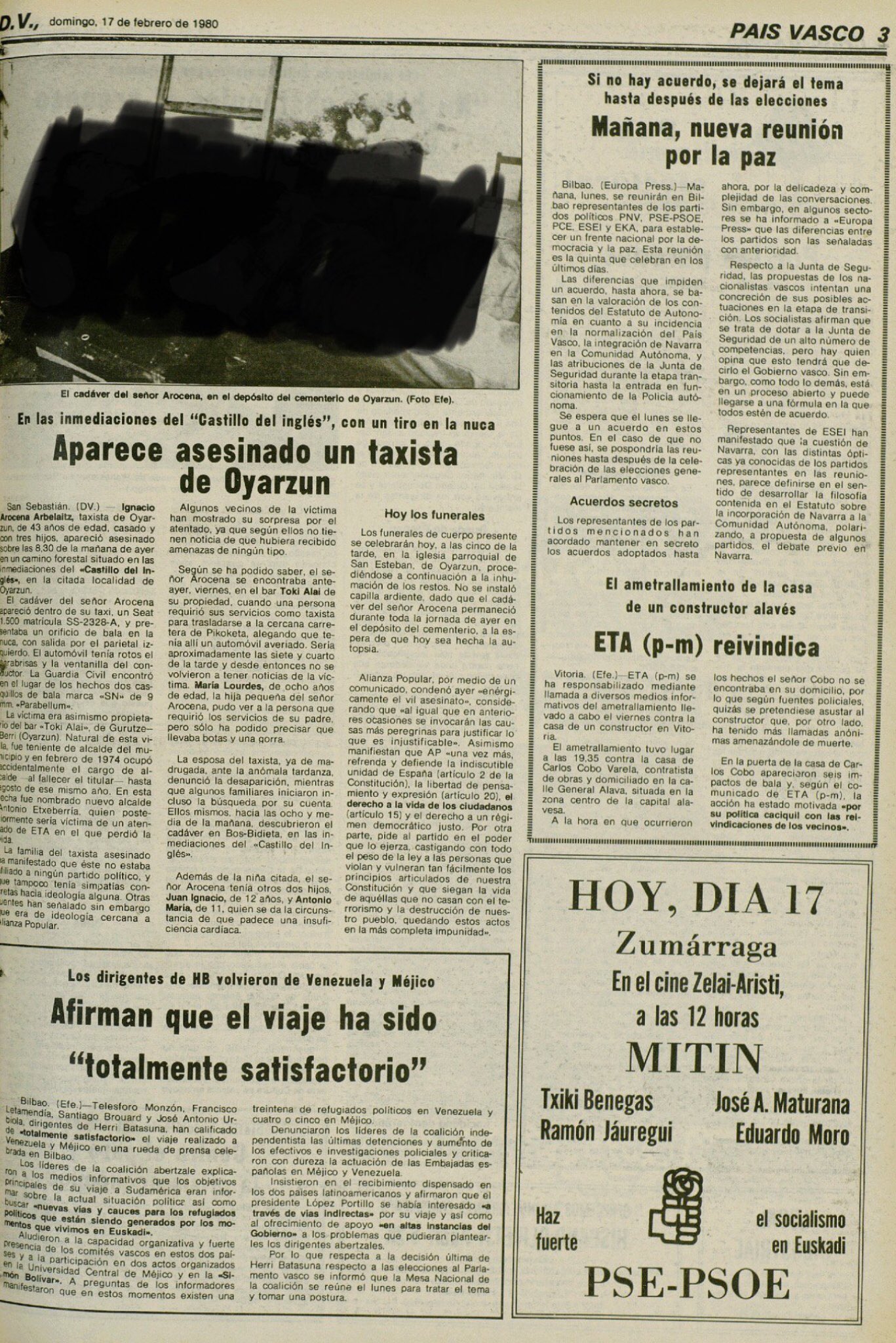 El viernes 15 de febrero de 1980 la banda terrorista ETA asesinaba en Oyarzun (Guipúzcoa) al taxista IGNACIO AROCENA ARBELÁIZ. Ignacio tenía posiciones ideológicas próximas a Alianza Popular y era amigo de Fernando Rodríguez Espínola, guarda forestal de Icona, que compatibilizaba su trabajo con colaboraciones con El Diario Vasco y La Voz de España. Rodríguez Espínola había sido asesinado por ETA el 12 de noviembre de 1979, y la banda terrorista lo acusó, en el comunicado de reivindicación, de ser confidente de la Guardia Civil. Lo mismo hicieron con Ignacio Arocena.