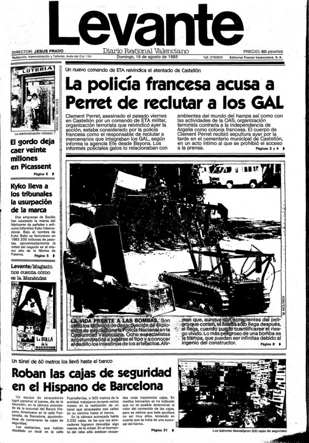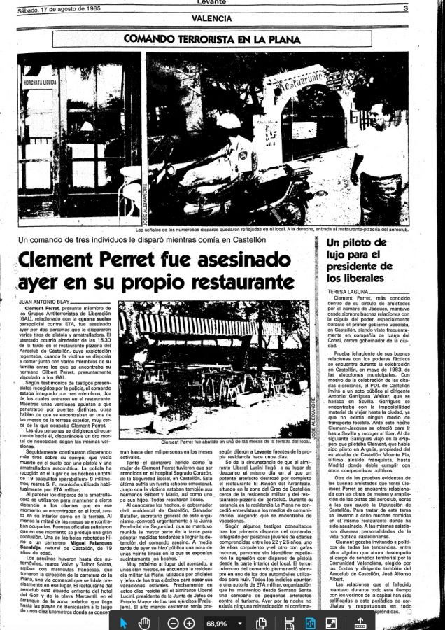 A las tres y cuarto de la tarde del viernes 16 de agosto de 1985, miembros del grupo Argala de ETA asesinaban en Benicasim (Castellón de la Plana) al empresario francés CLÉMENT PERRET. Dos etarras se presentaron en la pizzería que regentaba junto a su hermano Gilbert en la localidad castellonense y, tras localizarle, abrieron fuego contra él. Perret recibió trece impactos de bala que le provocaron la muerte en el acto, y Miguel Palanques Sanahuja, camarero de 19 años, resultó herido de bala en una pierna.