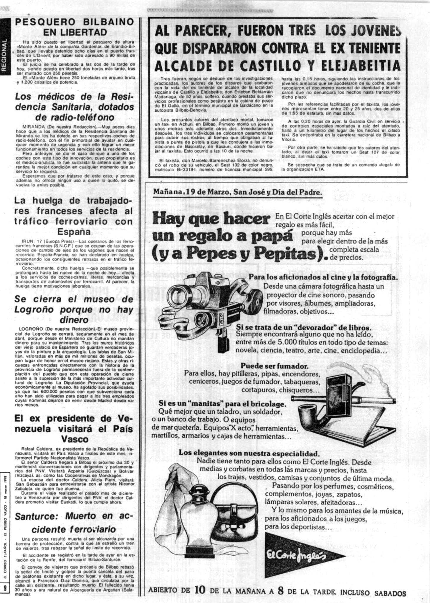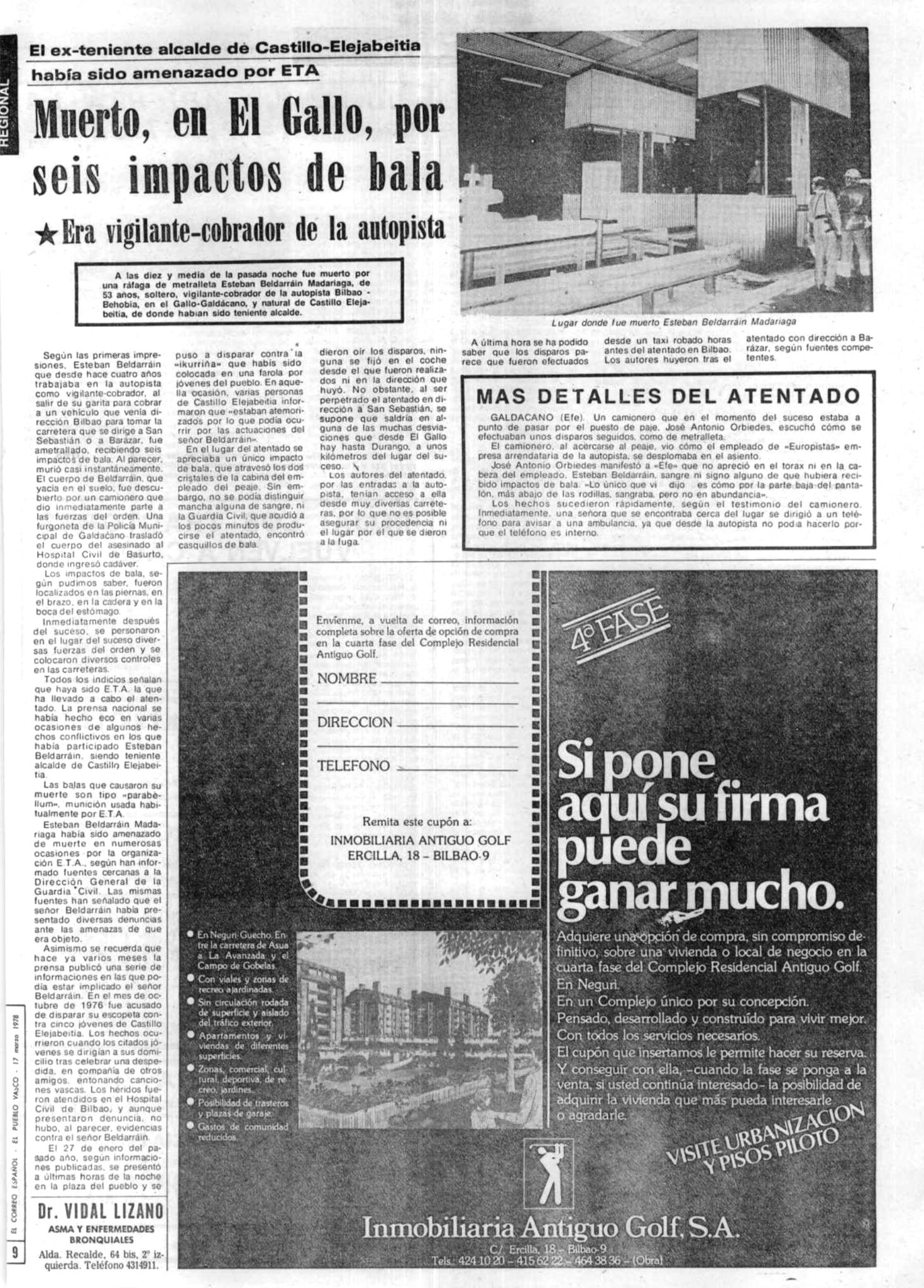 Hacia las diez y media de la mañana del jueves 16 de marzo de 1978, era asesinado ESTEBAN BELDARRAIN MADARIAGA, cobrador del Peaje de El Gallo de la autopista Bilbao-Behobia, tiroteado por varios miembros de la banda terrorista ETA.