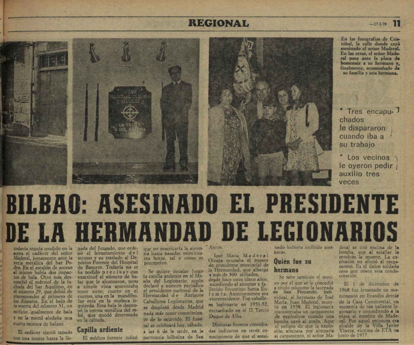 Un año después, a las ocho menos cuarto de la mañana del 16 de marzo de 1979, ETA asesinaba en Bilbao a JOSÉ MARÍA MADERAL OLEAGA, empleado de Iberduero y exlegionario. José María había salido de su domicilio, en la calle Urazurrutia, en torno a las 7:45 horas para dirigirse a pie hacia su trabajo en las instalaciones que la empresa Iberduero posee en la calle Tercio Ortiz de Zárate. A la altura del número 31 de la calle Bilbao la Vieja, tres encapuchados armados le salieron al paso. Al percatarse de la situación, el antiguo legionario pidió auxilio, momento en que uno de los agresores se adelantó, disparando varios tiros que lo alcanzaron en la cabeza y el tórax. Recibió siete impactos de bala y falleció casi en el acto.