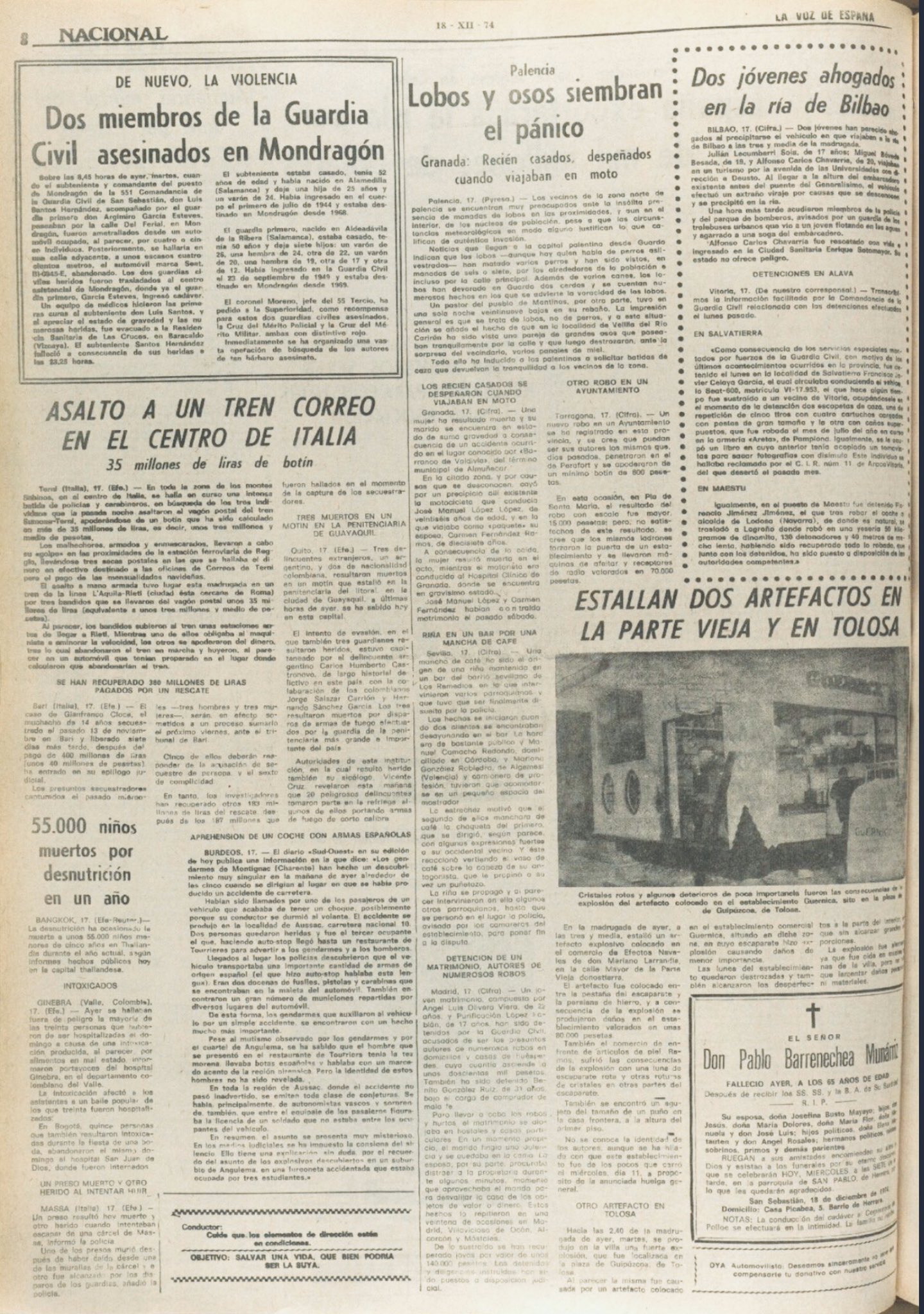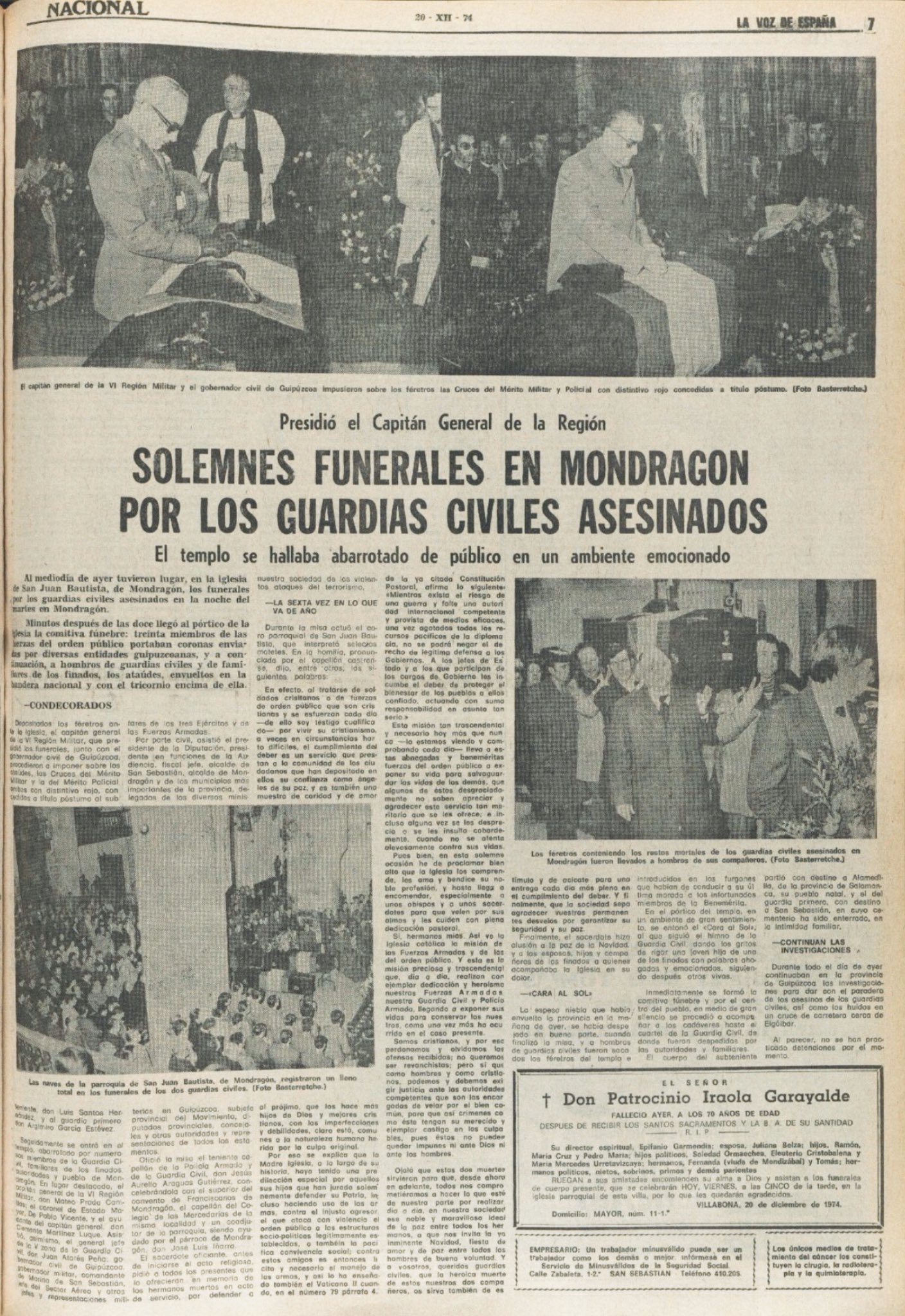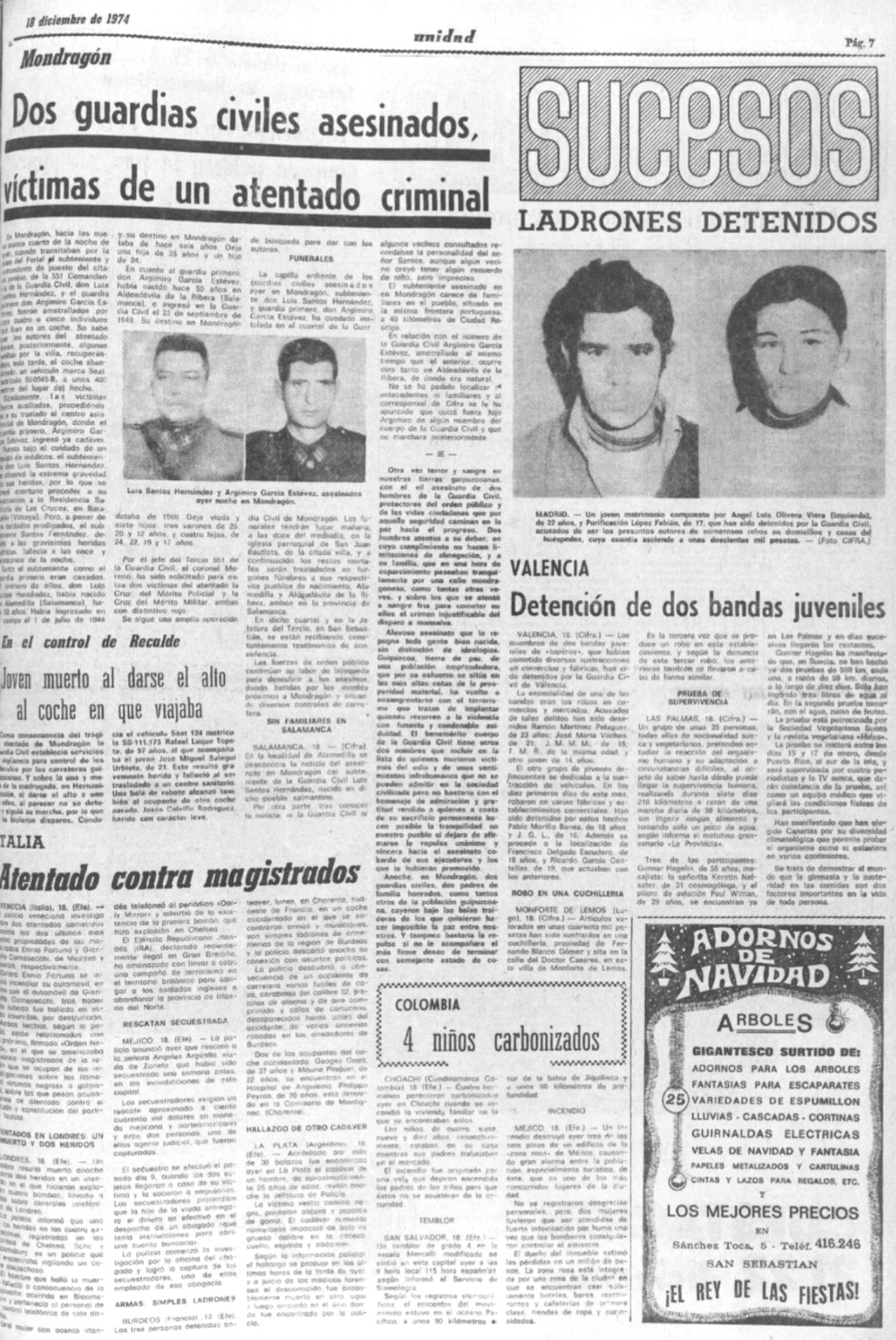 El martes 17 de diciembre de 1974 la banda terrorista ETA asesinaba en Mondragón (Guipúzcoa) al subteniente de la Guardia Civil LUIS SANTOS HERNÁNDEZ y al agente ARGIMIRO GARCÍA ESTÉVEZ en el que sería el último atentado con víctimas mortales de ese año. Con Santos Hernández y García Estévez sumaban diecinueve asesinados por ETA, de los que trece lo fueron en un solo atentado: el cometido en la cafetería Rolando de Madrid el 13 de septiembre.