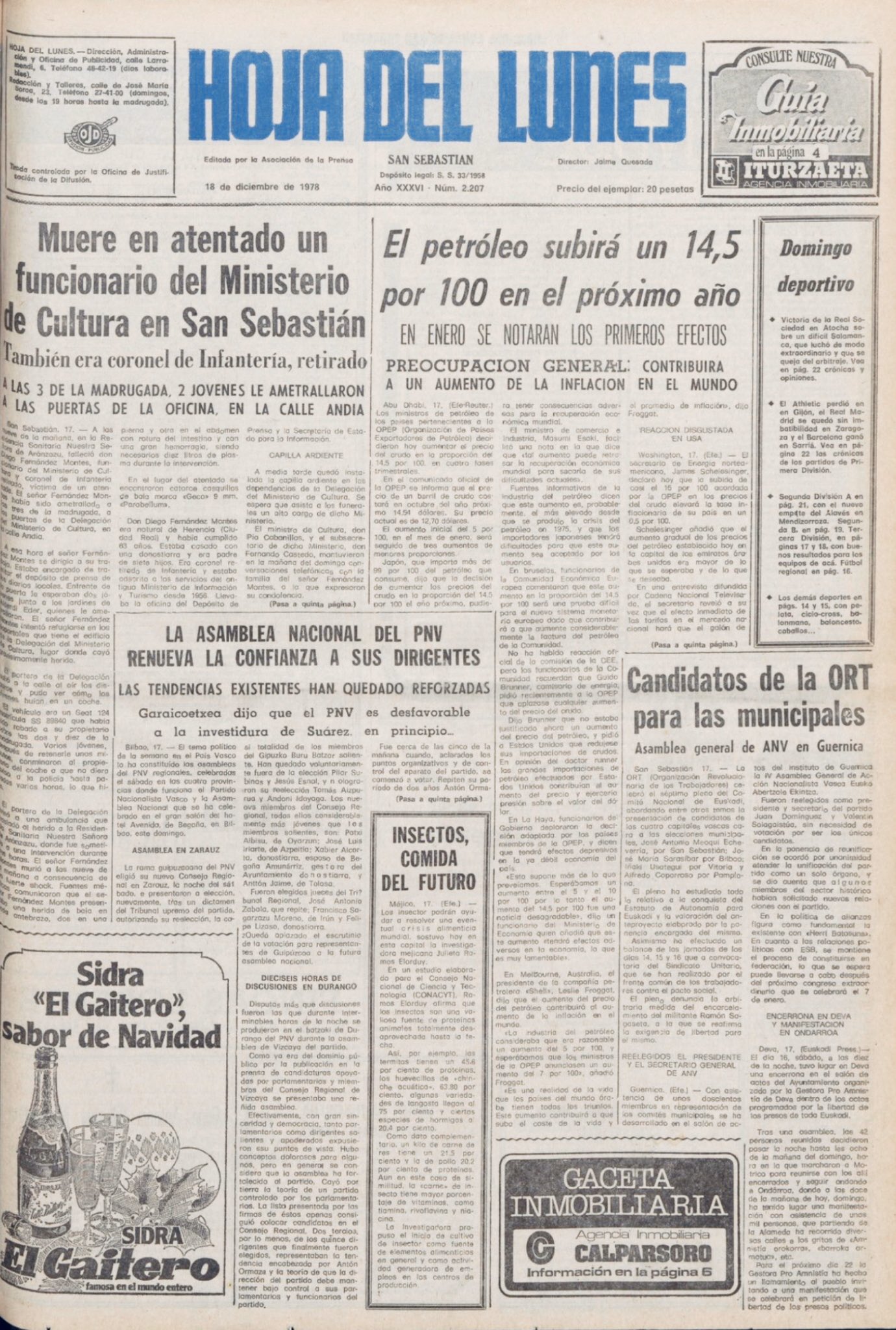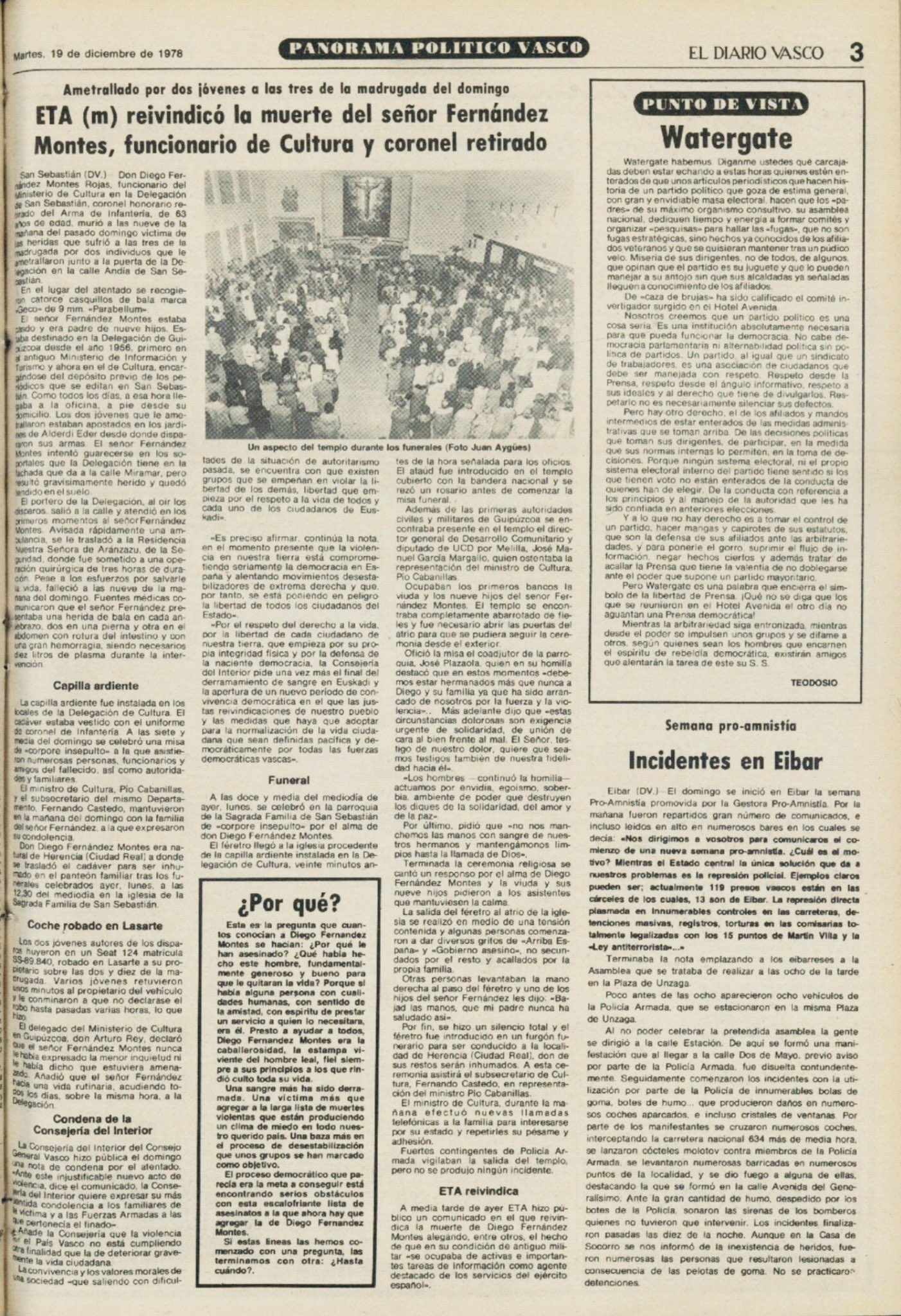 En la madrugada del domingo 17 de diciembre de 1978, miembros del grupo Gamboa de ETA asesinaban frente a la playa de La Concha de San Sebastián, al coronel del Ejército retirado DIEGO FERNÁNDEZ-MONTES ROJAS. La víctima trabajaba en el Ministerio de Cultura, donde se ocupaba del depósito oficial de prensa.