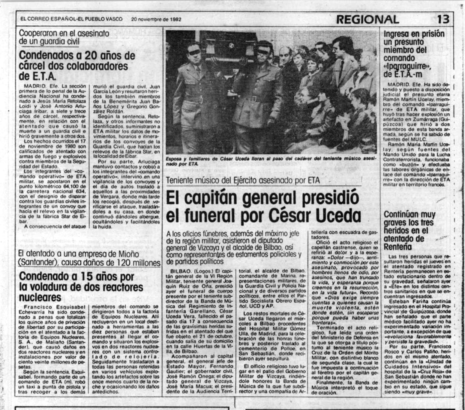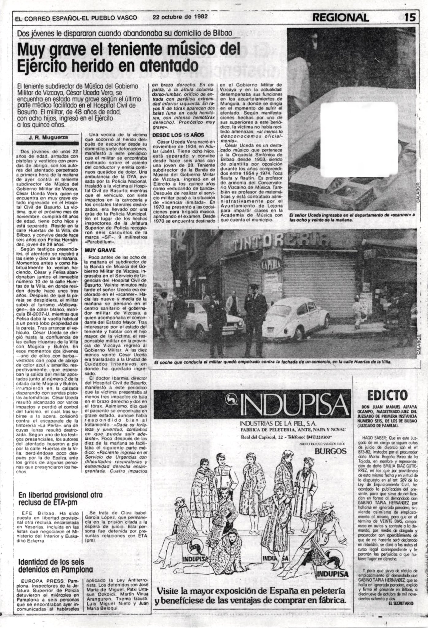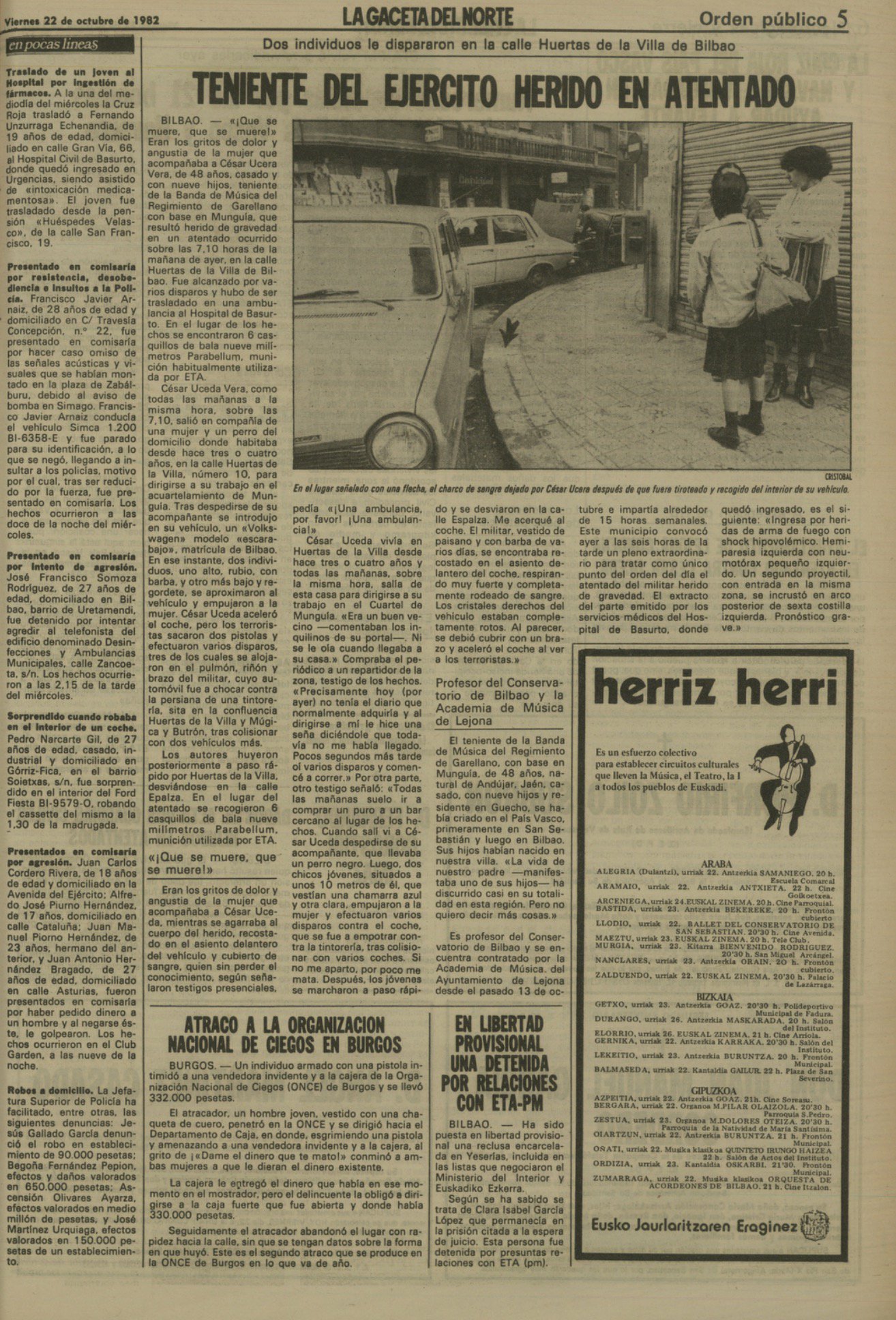 El 17 de noviembre de 1982 fallece en Madrid el teniente del Cuerpo de Músicas Militares CÉSAR UCEDA VERA, incapaz de superar las heridas sufridas un mes antes, el 21 de octubre, cuando fue acribillado a balazos en Bilbao por dos terroristas de la banda ETA. Tras ser tiroteado, la víctima fue llevada urgentemente al Hospital de Basurto, pero unos días después lo trasladaron a un hospital de Madrid donde acabaría falleciendo. Su estado fue calificado de «muy grave» desde el primer momento. César presentaba «cuatro orificios de entrada de bala situados uno en la espalda, en la región dorso-lumbar causante de la parálisis apreciada en la pierna izquierda, otros cuatro en el brazo derecho, así como dos balas alojadas en los dos hemitórax».