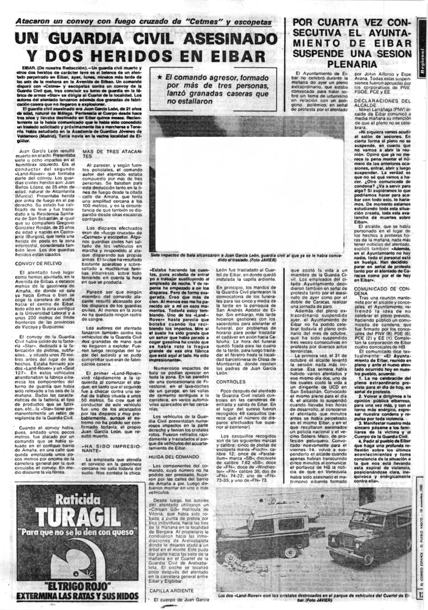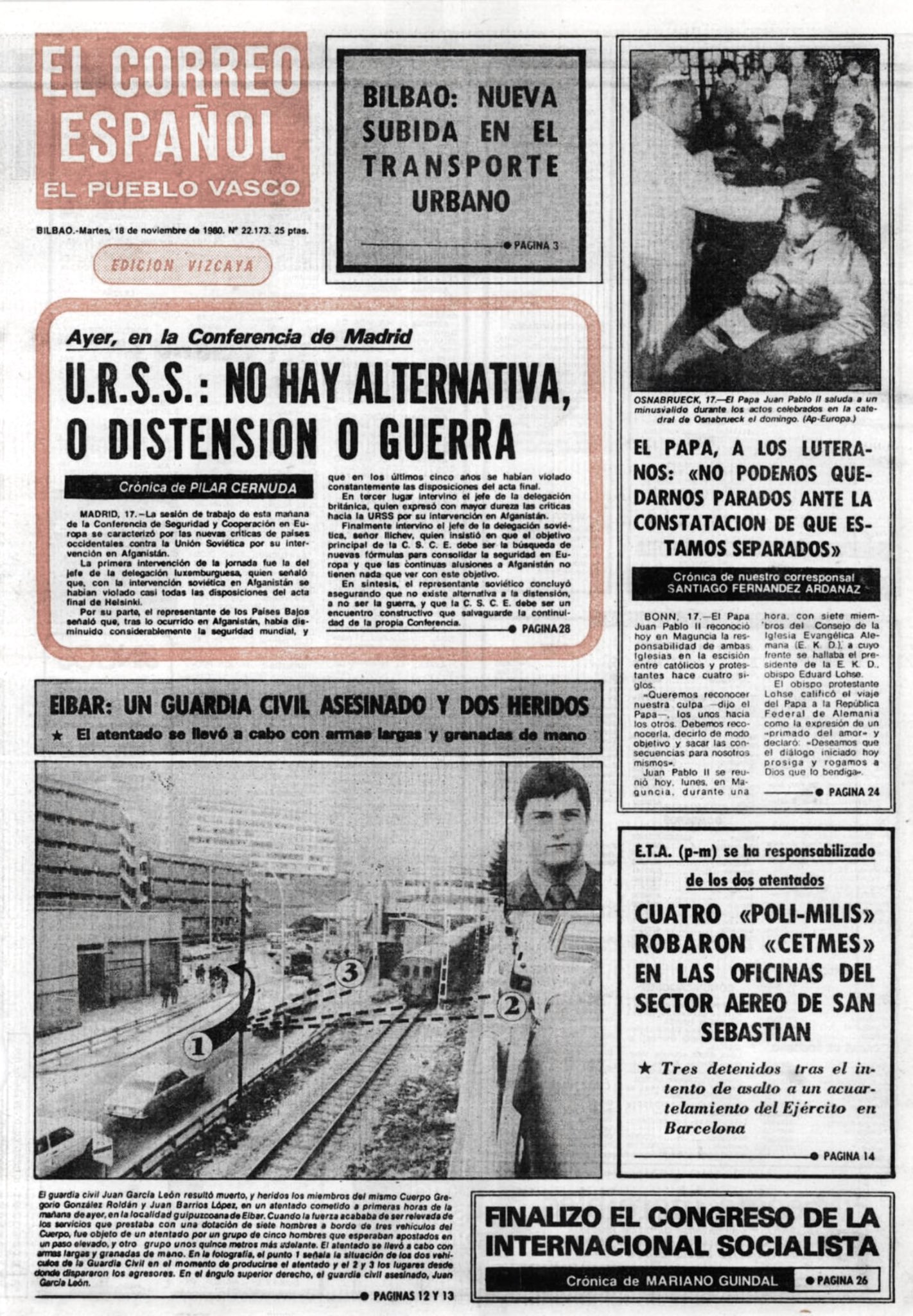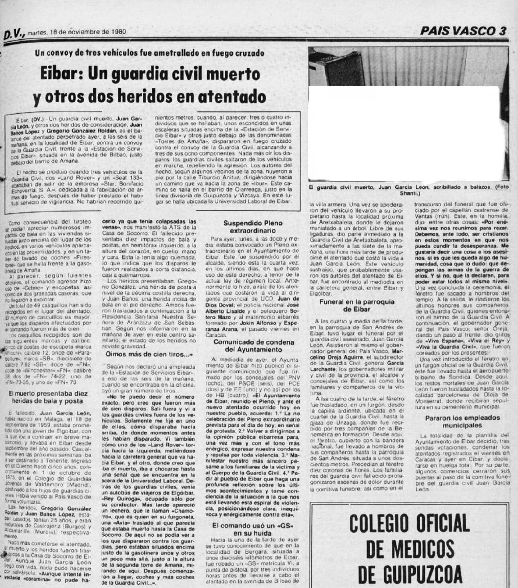 Pasadas las seis de la mañana del 17 de noviembre de 1980, la banda terrorista ETA asesinaba en Éibar (Guipúzcoa) al guardia civil JUAN GARCÍA LEÓN, que conducía el primer vehículo de un convoy formado por dos Land Rover y un Seat 131 de la Guardia Civil. El convoy volvía de prestar servicio de vigilancia en la fábrica de armas Star Bonifacio Echeverría de la localidad guipuzcoana. A unos ciento cincuenta metros de la misma, en un punto de la carretera en dirección a Ermua, cinco terroristas les tendieron una emboscada y atacaron el convoy con metralletas, fusiles de asalto y escopetas, además de con dos granadas de mano que no llegaron a explotar. Los asesinos de la banda estaban escondidos en dos sitios distintos: en unas escaleras situadas encima de la estación de servicio de Éibar y debajo de las denominadas Torres de Amaña, por lo que el convoy de la Guardia Civil se vio envuelto en un fuego cruzado.