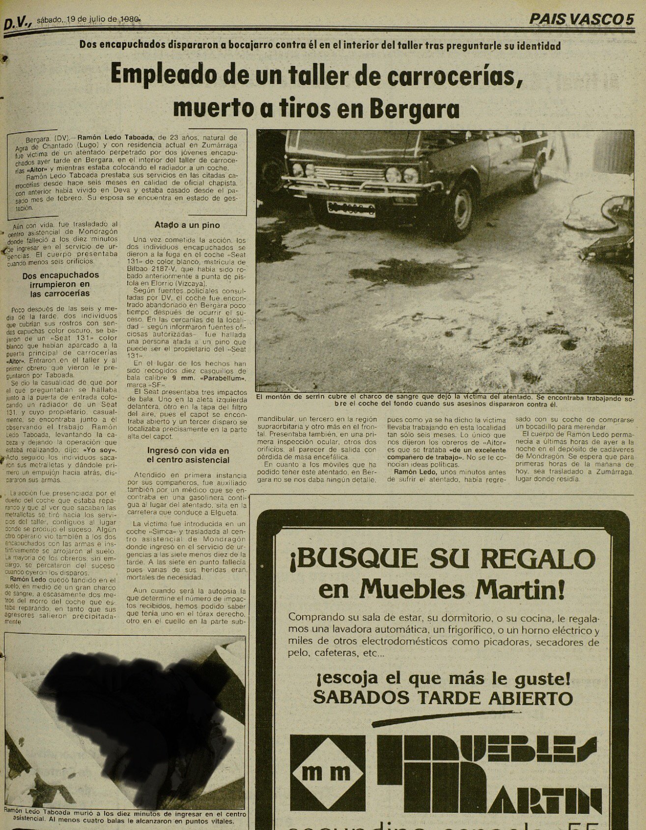 El 18 de julio de 1980 la banda terrorista ETA asesina en Vergara (Guipúzcoa) al joven RAMÓN LEDO TABOADA, chapista de profesión. Dos encapuchados armados entraron en el taller de carrocería Aitor, donde trabajaba, y preguntaron por él. Ramón se identificó y los terroristas, sin cruzar palabra, le dispararon a bocajarro, dejándole gravemente herido. Trasladado urgentemente por sus compañeros al centro asistencial de Mondragón, falleció minutos después de ingresar con cinco impactos de bala en la cabeza, la yugular y el pecho.