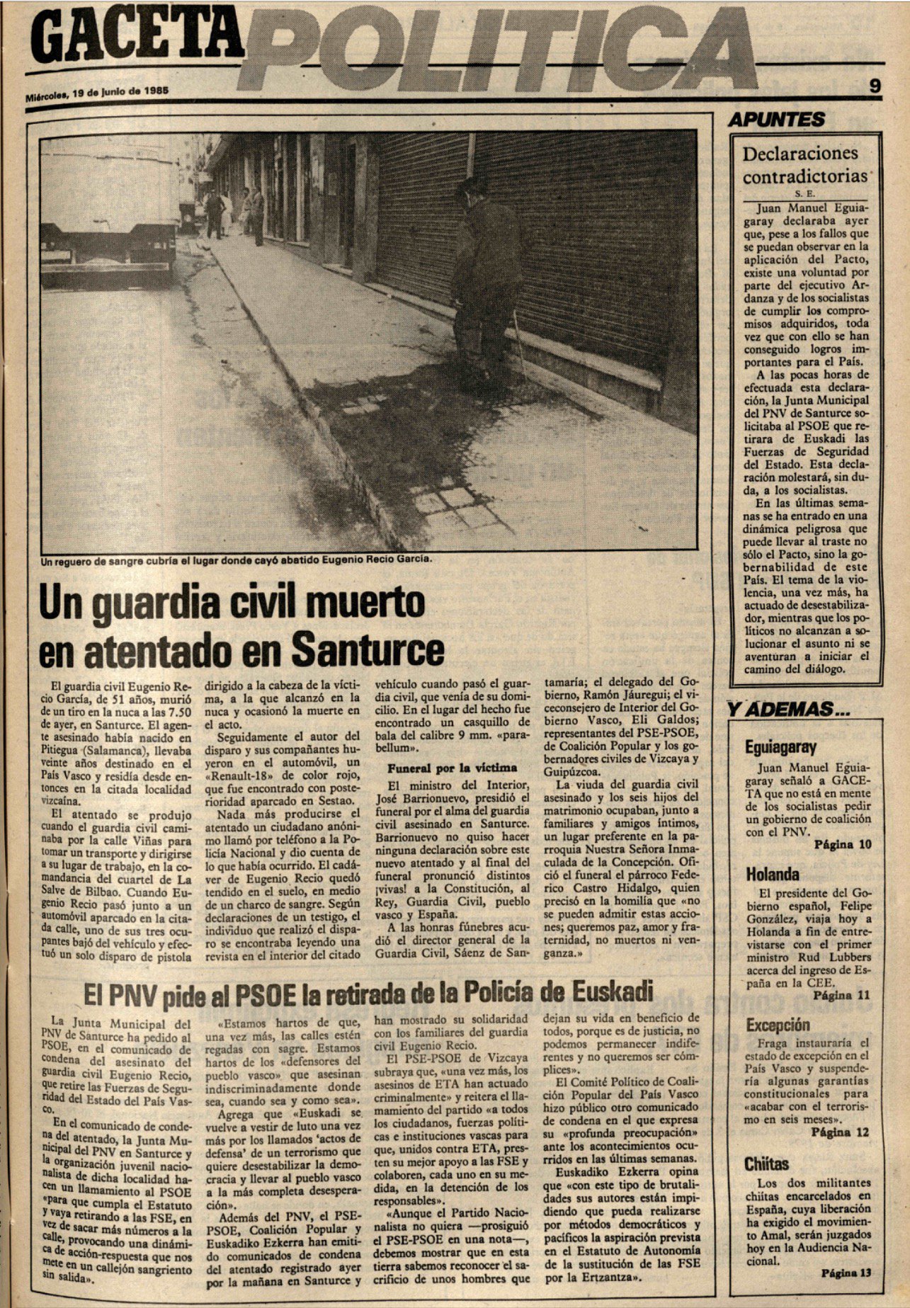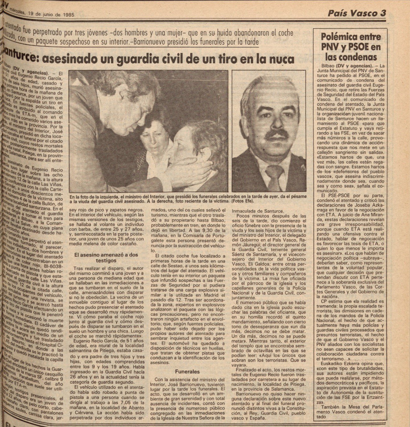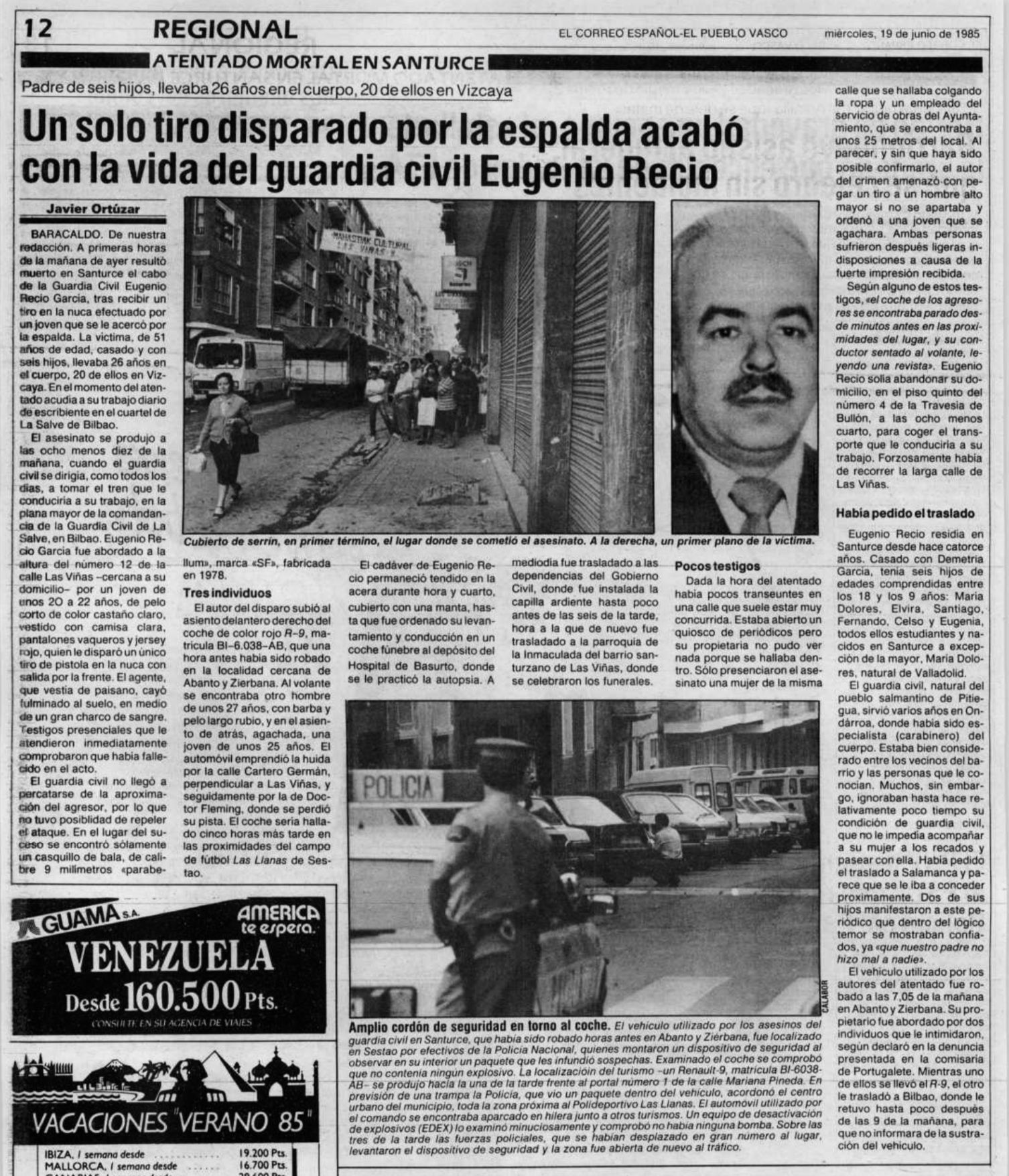 Un año después, el 18 de junio de 1985, la banda terrorista ETA asesinaba en Santurce (Vizcaya) al cabo de la guardia civil EUGENIO RECIO GARCÍA. Faltaban quince minutos para las ocho de la mañana y el guardia civil caminaba, vestido de paisano, por la calle de Las Viñas en dirección a la estación, donde cogería el tren que tendría que haberle llevado a su trabajo en el cuartel de la Guardia Civil de La Salve, en Bilbao. En ese momento fue abordado por un terrorista que, tras conminar a una joven que transitaba por el lugar a arrojarse al suelo, efectuó un único disparo con arma corta contra el agente. En el lugar del crimen se encontró un solo casquillo de bala.