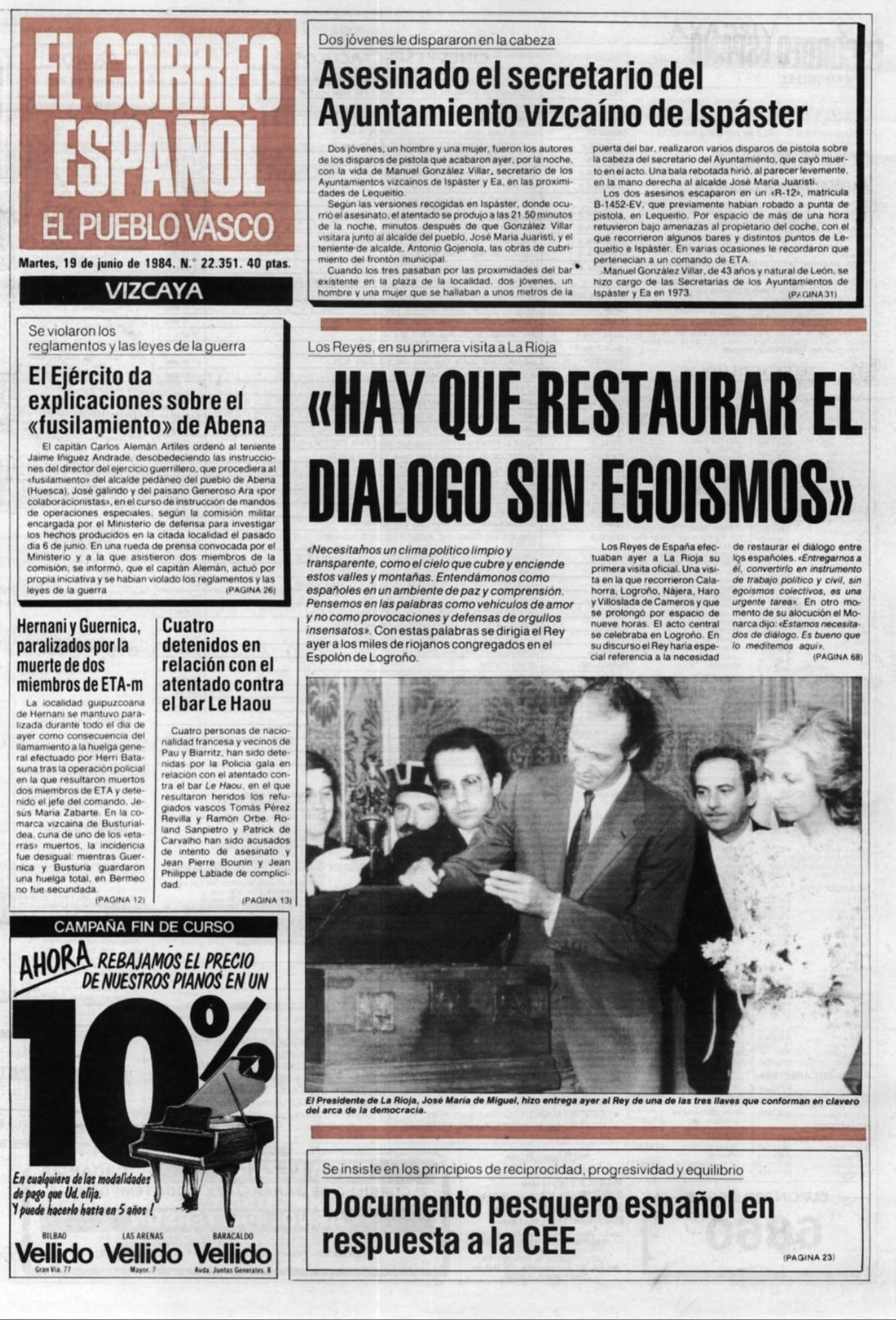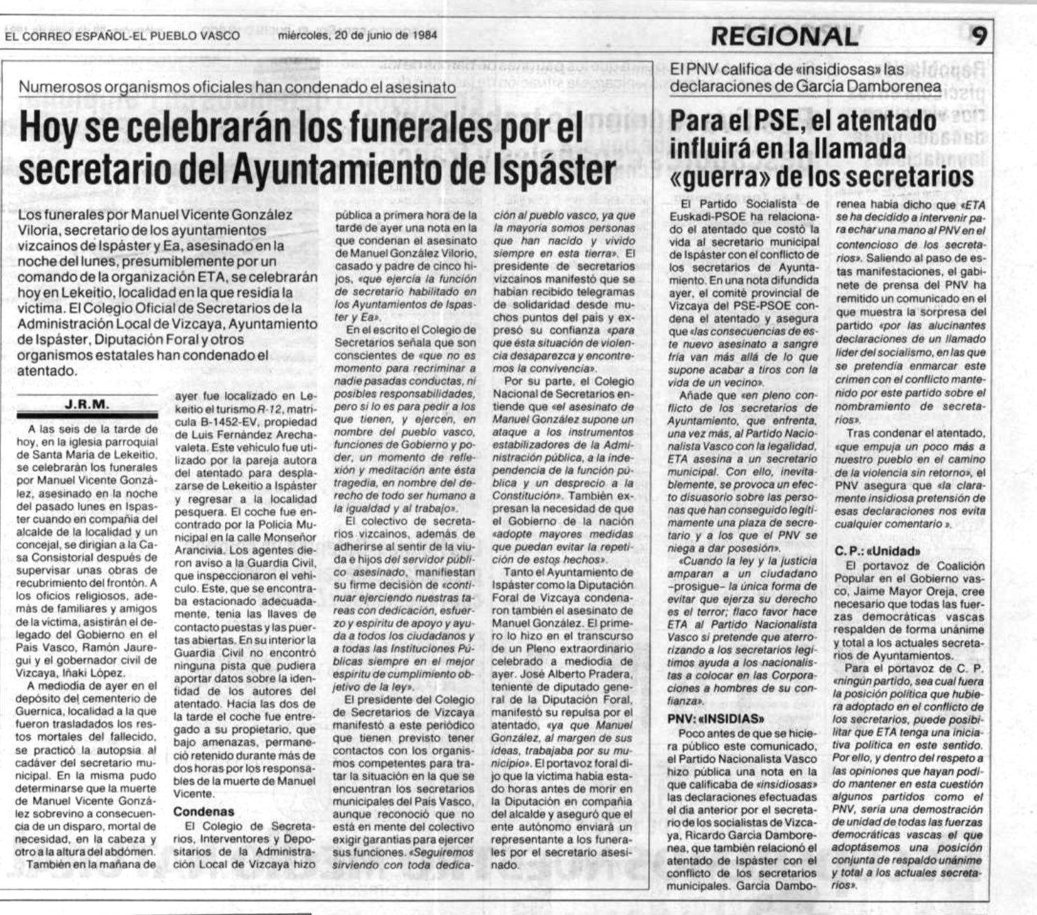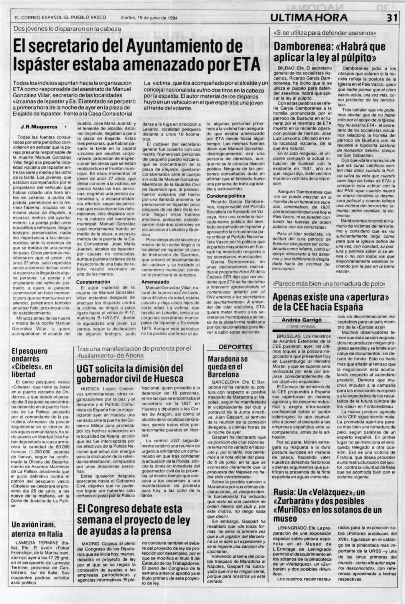 El 18 de Junio de 1984 la banda terrorista ETA asesinaba de un tiro en la cabeza al secretario del Ayuntamiento de Ispáster (Vizcaya) MANUEL VICENTE GONZÁLEZ VILORIO.