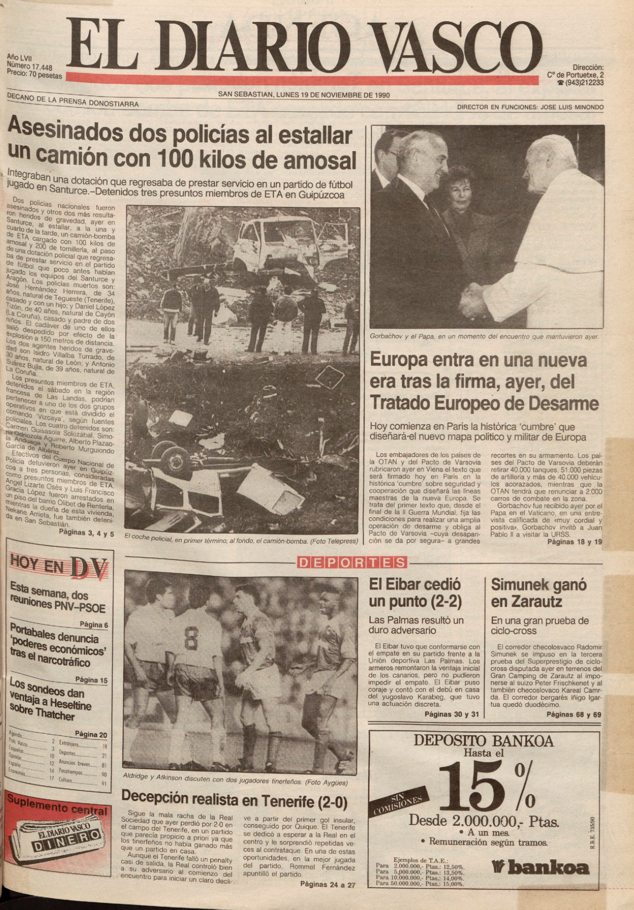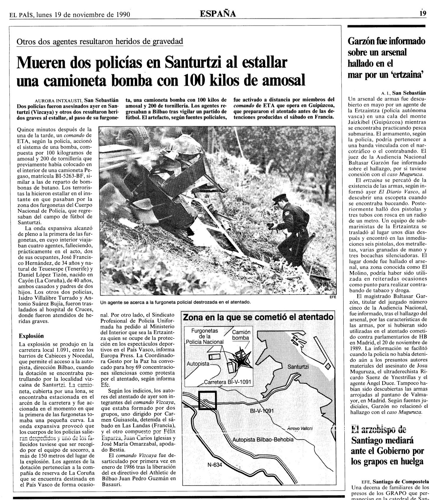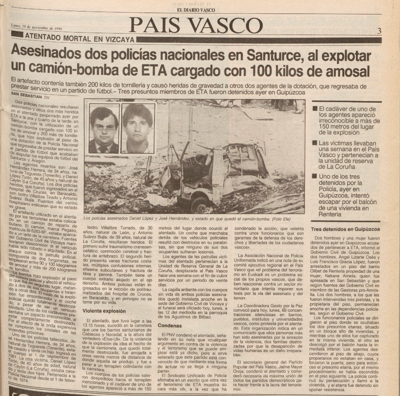A la una y cuarto de la tarde del 18 de noviembre de 1990 la banda terrorista ETA hizo explotar una camión-bomba al paso de un convoy policial que regresaba de prestar un servicio de orden público en el campo de fútbol de Santurce (Vizcaya), donde se había celebrado un encuentro de división regional entre el equipo local y el Aragón. El vehículo, una furgoneta Pegaso similar a las que se utilizan para el reparto de bombonas de butano, estaba cargado con cien kilos de amonal y doscientos de metralla y aparcado en un arcén de la carretera cubierto con una lona. El convoy policial circulaba por la carretera que une el barrio de Cabieces con el acceso a la autovía Bilbao-Santander, y el camión-bomba fue activado por control remoto por miembros del grupo Vizcaya de ETA justo cuando el primer vehículo policial tomaba una pequeña curva. La onda expansiva de la bomba afectó de lleno al segundo furgón policial y, pese al blindaje del vehículo, causó la muerte en el acto de los agentes de Policía JOSÉ FRANCISCO HERNÁNDEZ HERRERA y DANIEL LÓPEZ TIZÓN, e hirió de gravedad a otros dos agentes: Isidro Villalibre Torrada y Antonio Suárez Mujía.