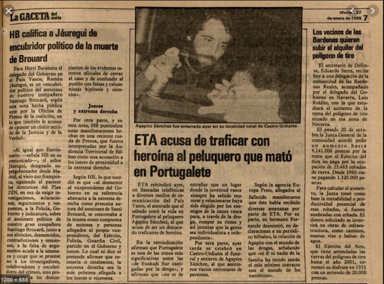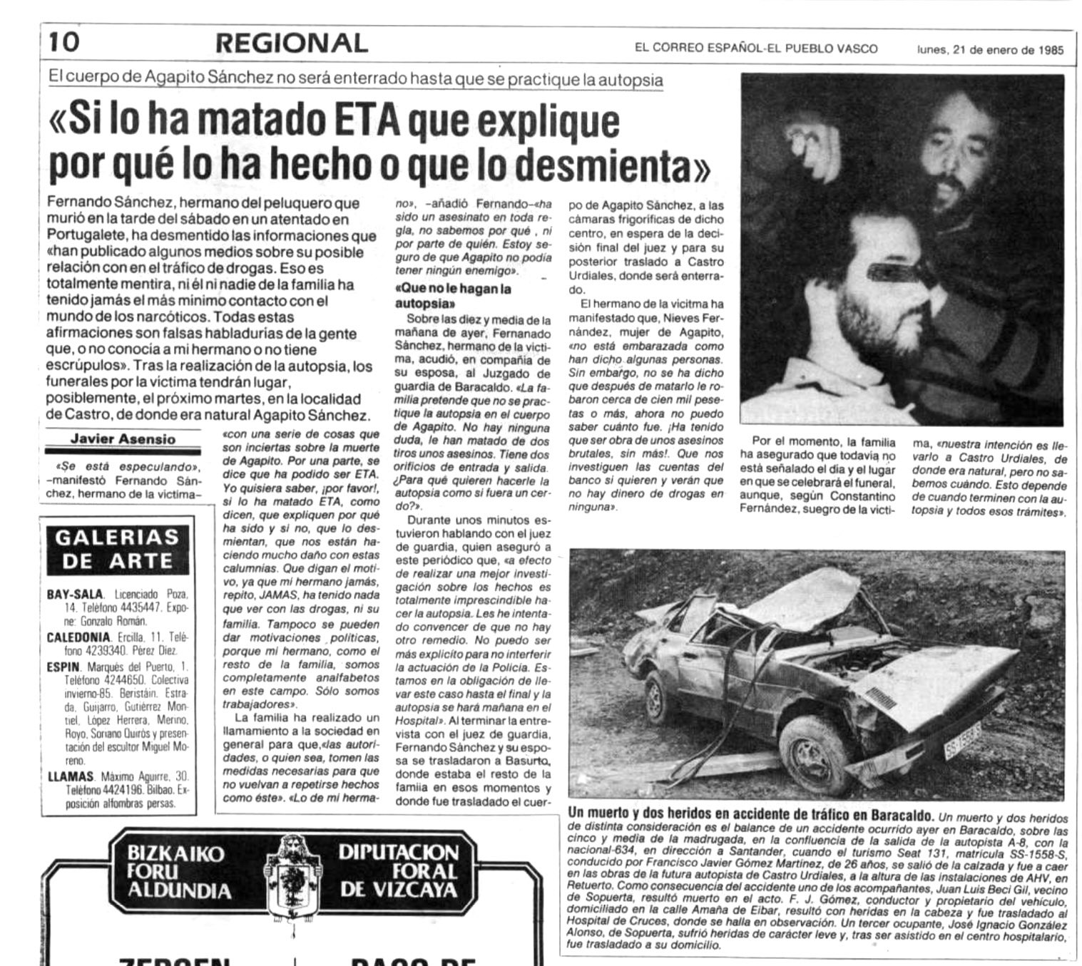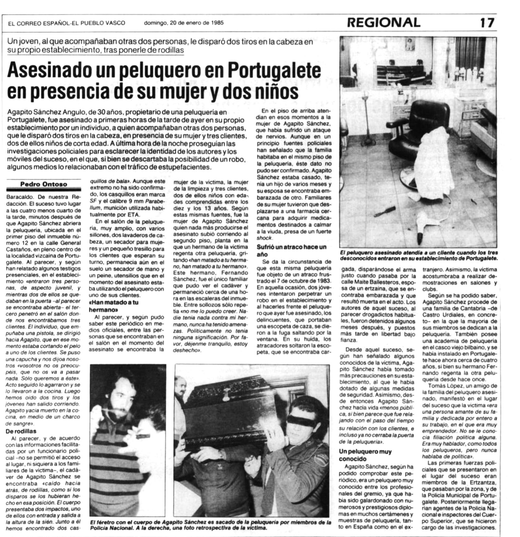 El 19 de enero de 1985 la banda terrorista ETA asesinaba en Portugalete (Vizcaya) al peluquero AGAPITO SÁNCHEZ ANGULO. Fue el primer asesinato de un año que terminaría con 37 víctimas mortales. Ese año, además, ETA instaló en Madrid un grupo permanente y utilizó profusamente el método del coche-bomba.